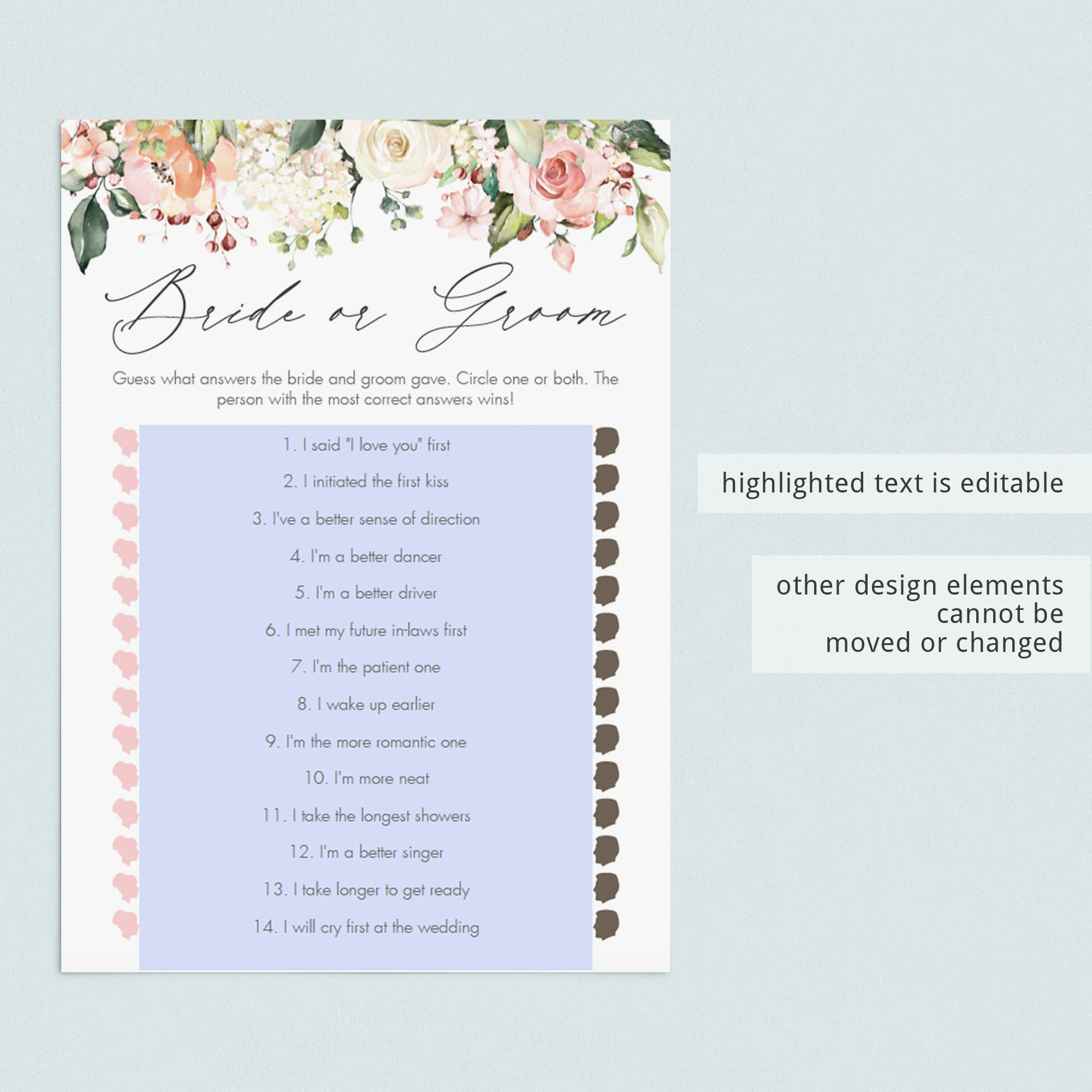 Entertain your bridal shower guests with this floral bridal shower games bundle with blush flowers design. The set includes everything you need to entertain your guests with a variety of activities and to create beautiful keepsakes for the happy new couple.