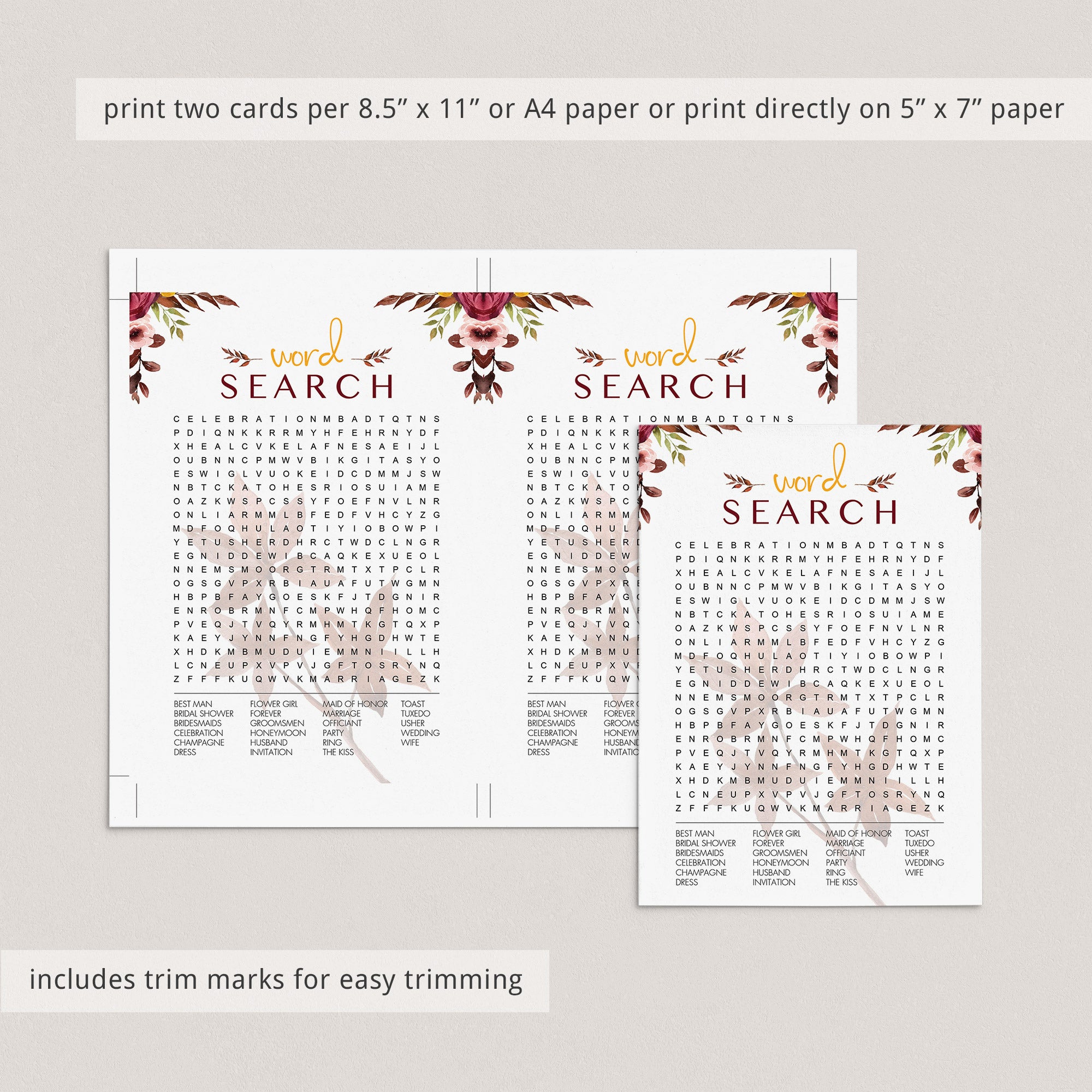Are you looking for a fun game for your fall wedding shower? Play Wedding Word Search with this gorgeous burgundy game card. Let your guests search for all wedding related words that are listed at the bottom of the cards. The words can be found horizontally, vertically and diagonally. The first person to get all the words wins!