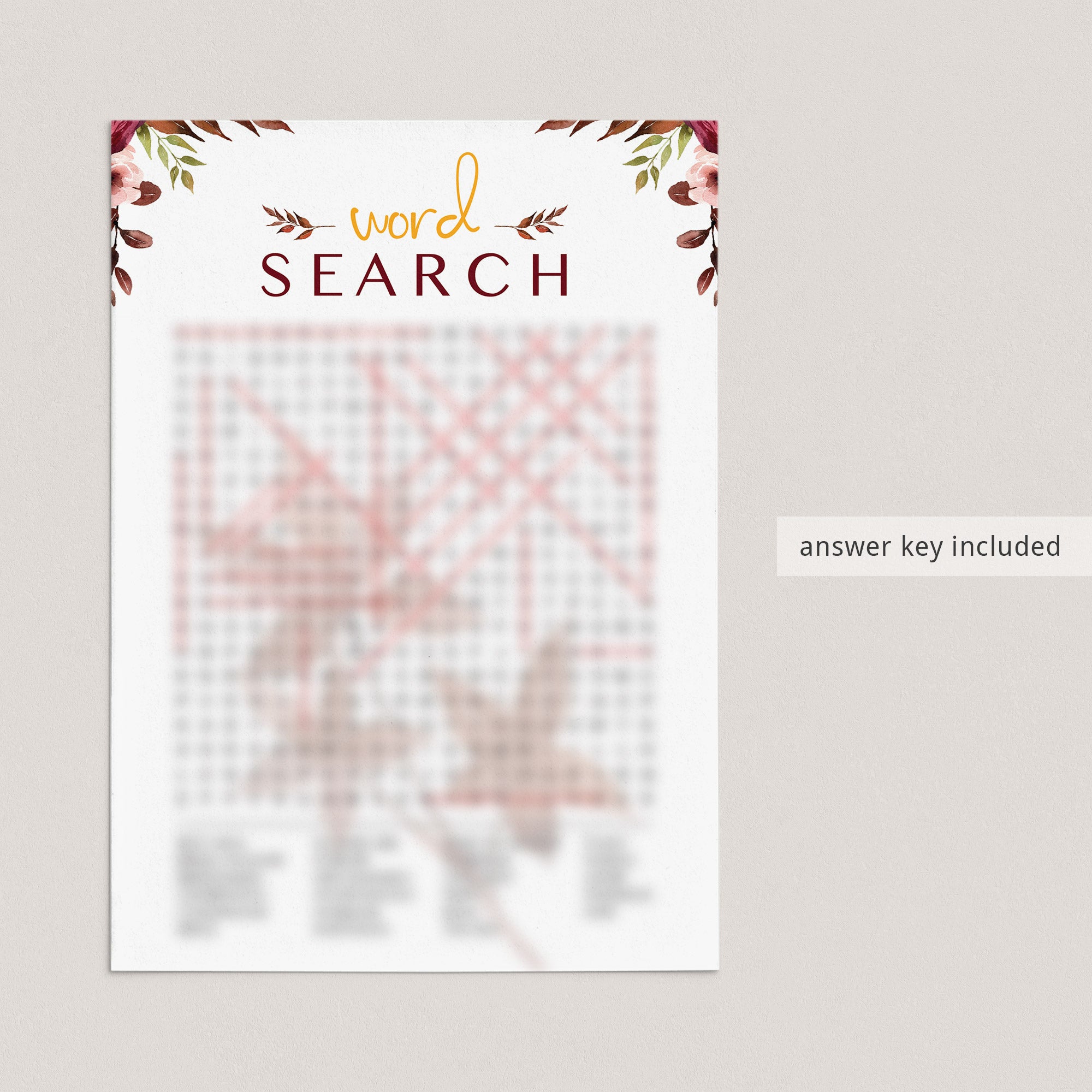 This fall wedding Word Search game is an instant download. After purchase you will receive a download link immediately on screen. Also within minutes of your order and payment, an e-mail will be sent to you with a link for your download.