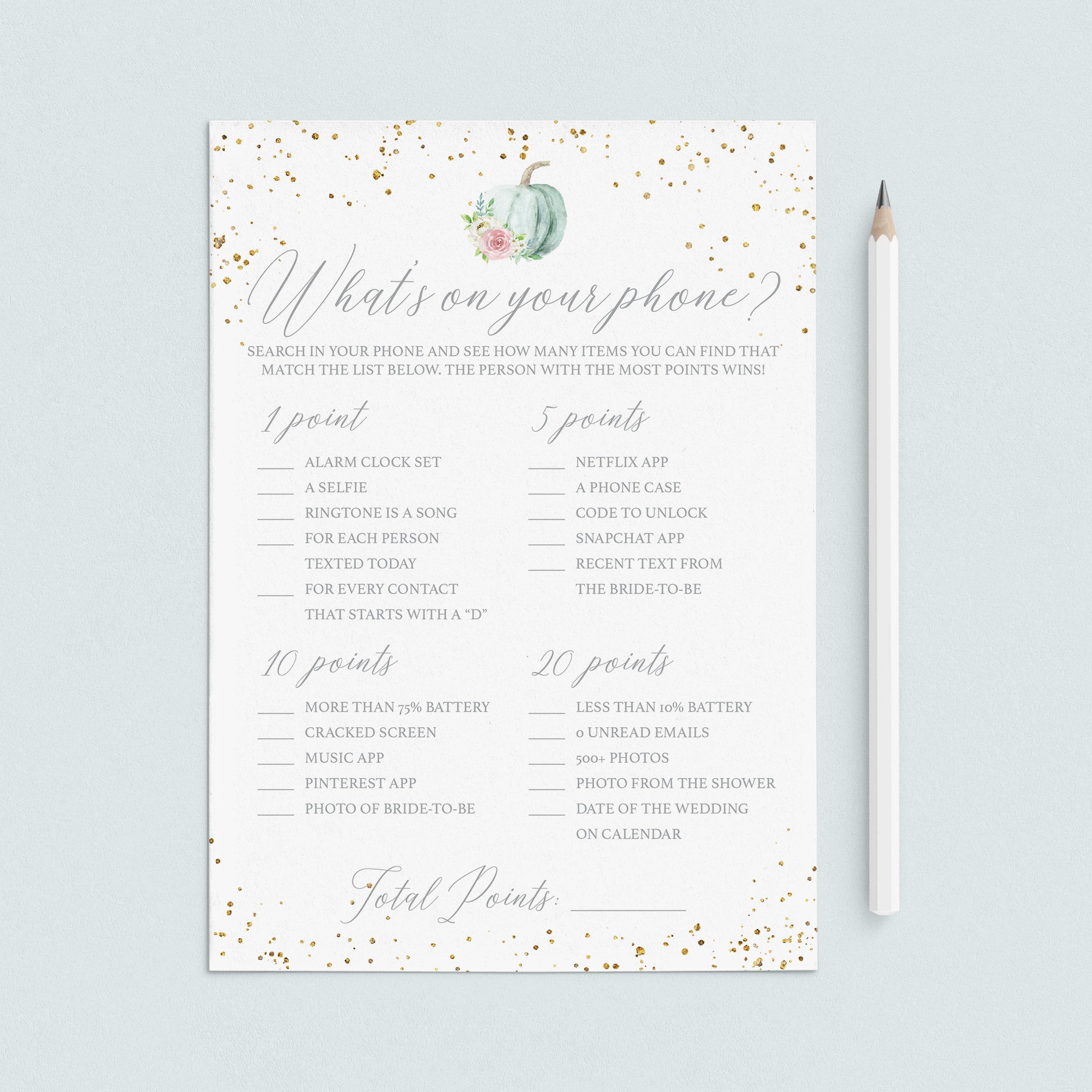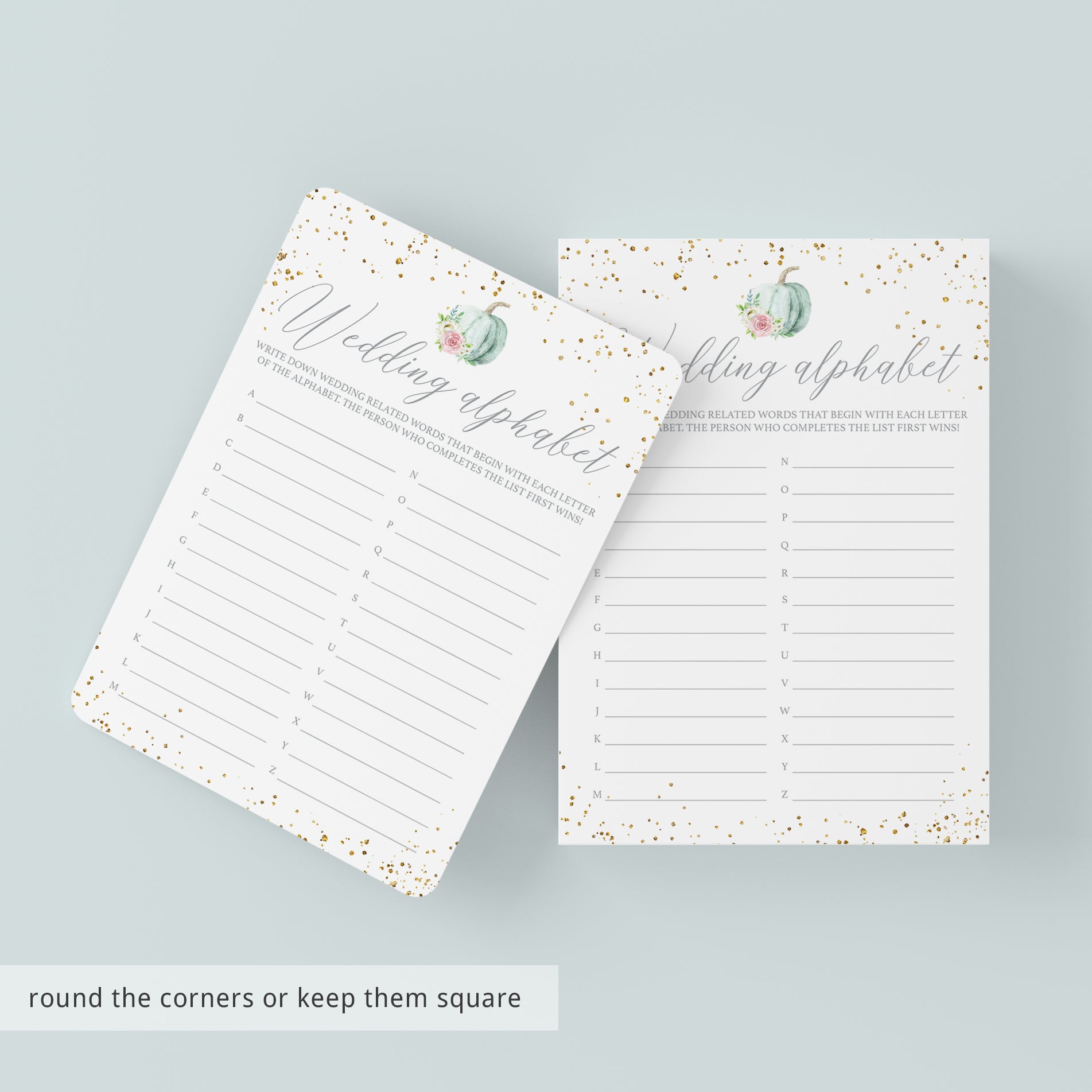 This floral pumpkin bridal shower games pack includes the following 4 games: