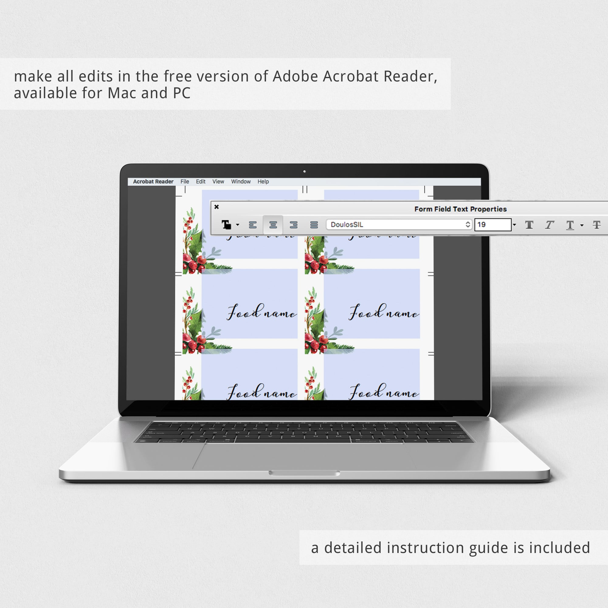 The template is editable in Adobe Acrobat Reader (free download). After downloading the file, fill in your goodies or leave the cards blank to create handwritten buffet cards. Print the cards right from your computer in a matter of minutes or have them printed at your favorite print shop.