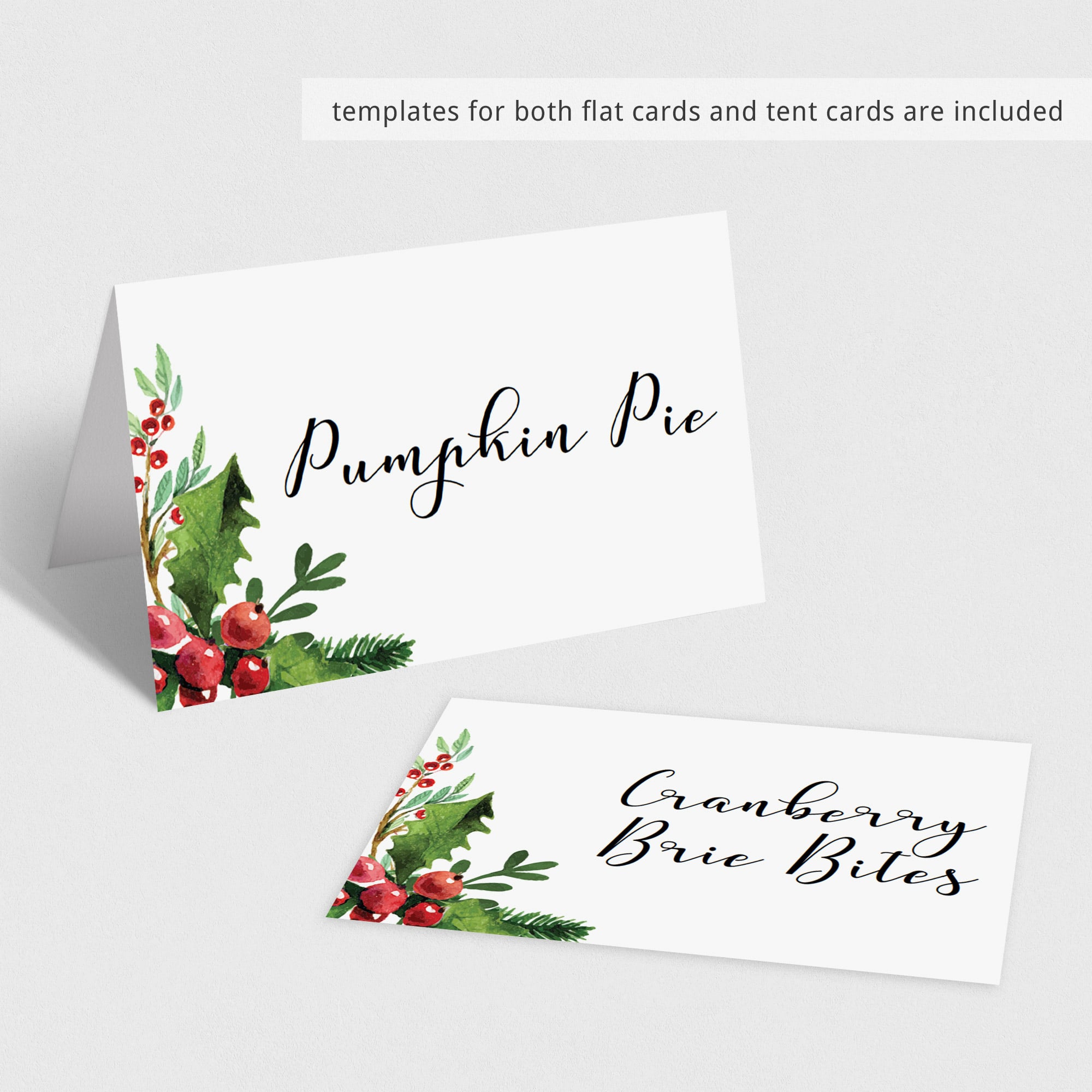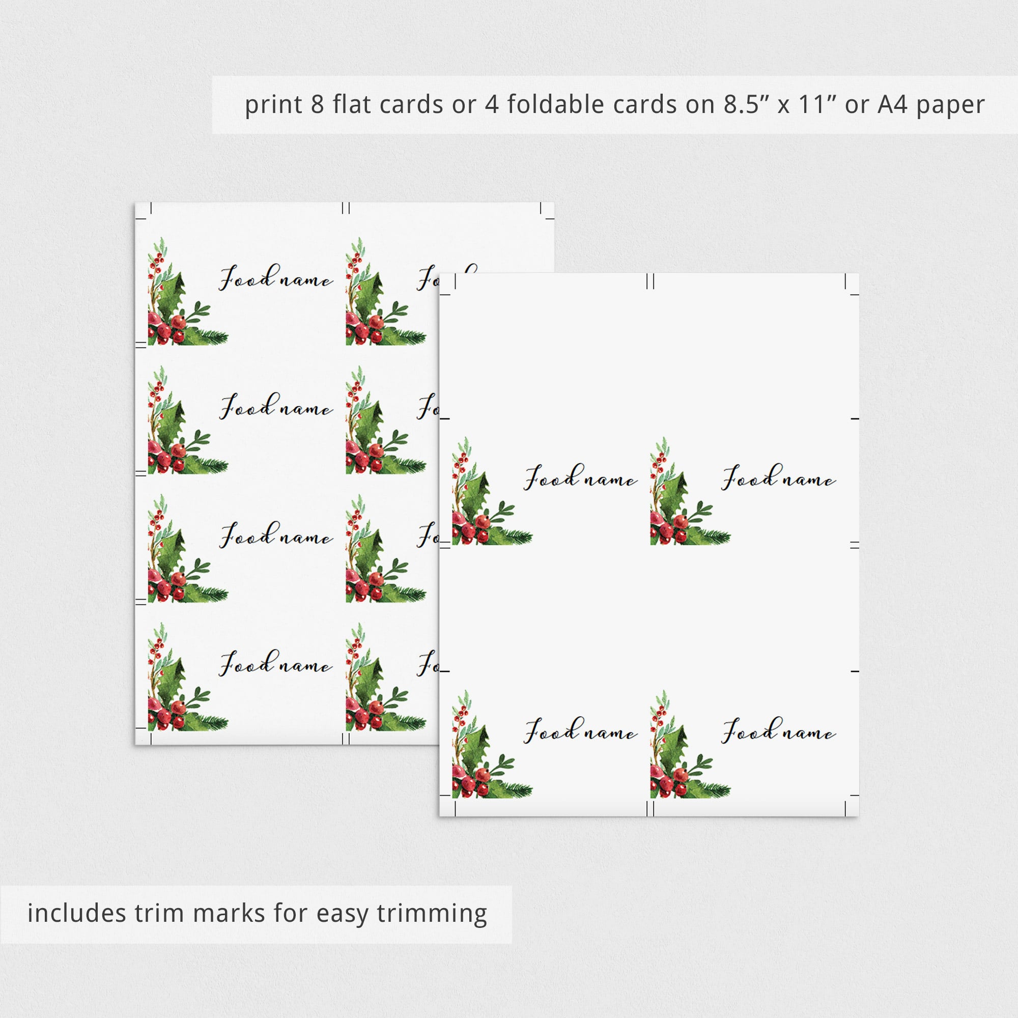 Decorate your Holiday buffet table with these beautiful red and green buffet cards. The watercolor red berries and green leaves will ensure that you have those special winter vibes at your party. The editable buffet cards are perfect to label desserts, serve as place cards or you can use them as gift name tags.