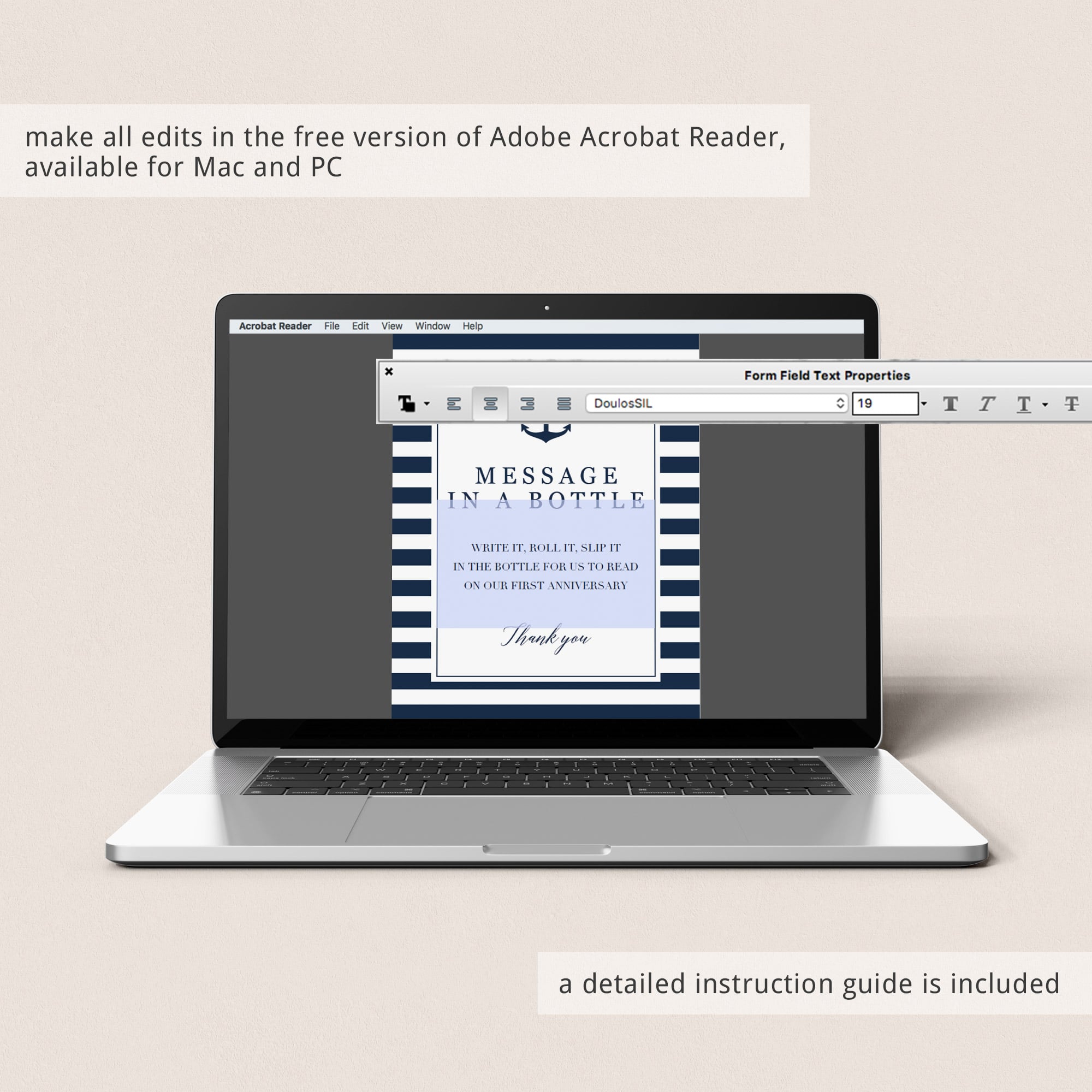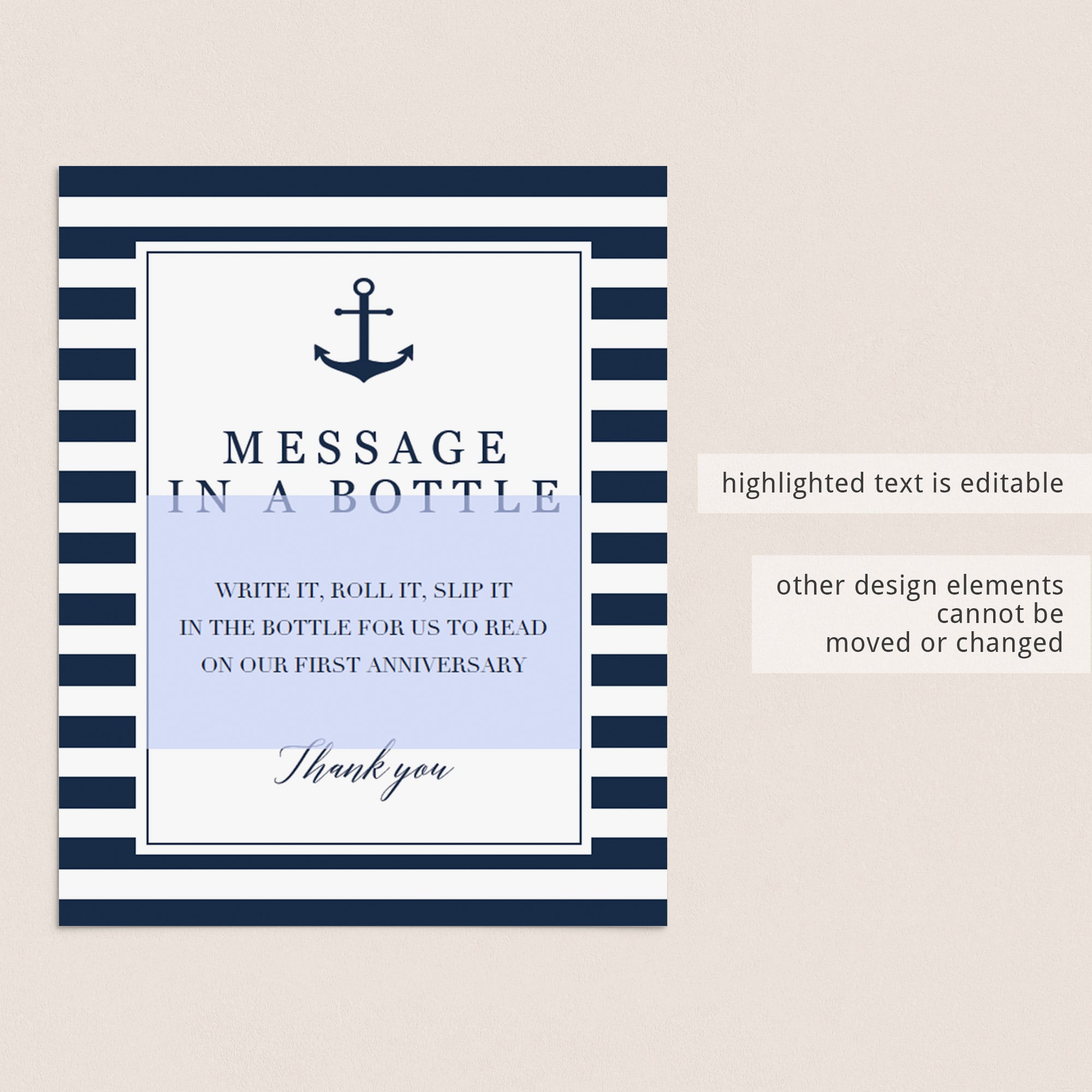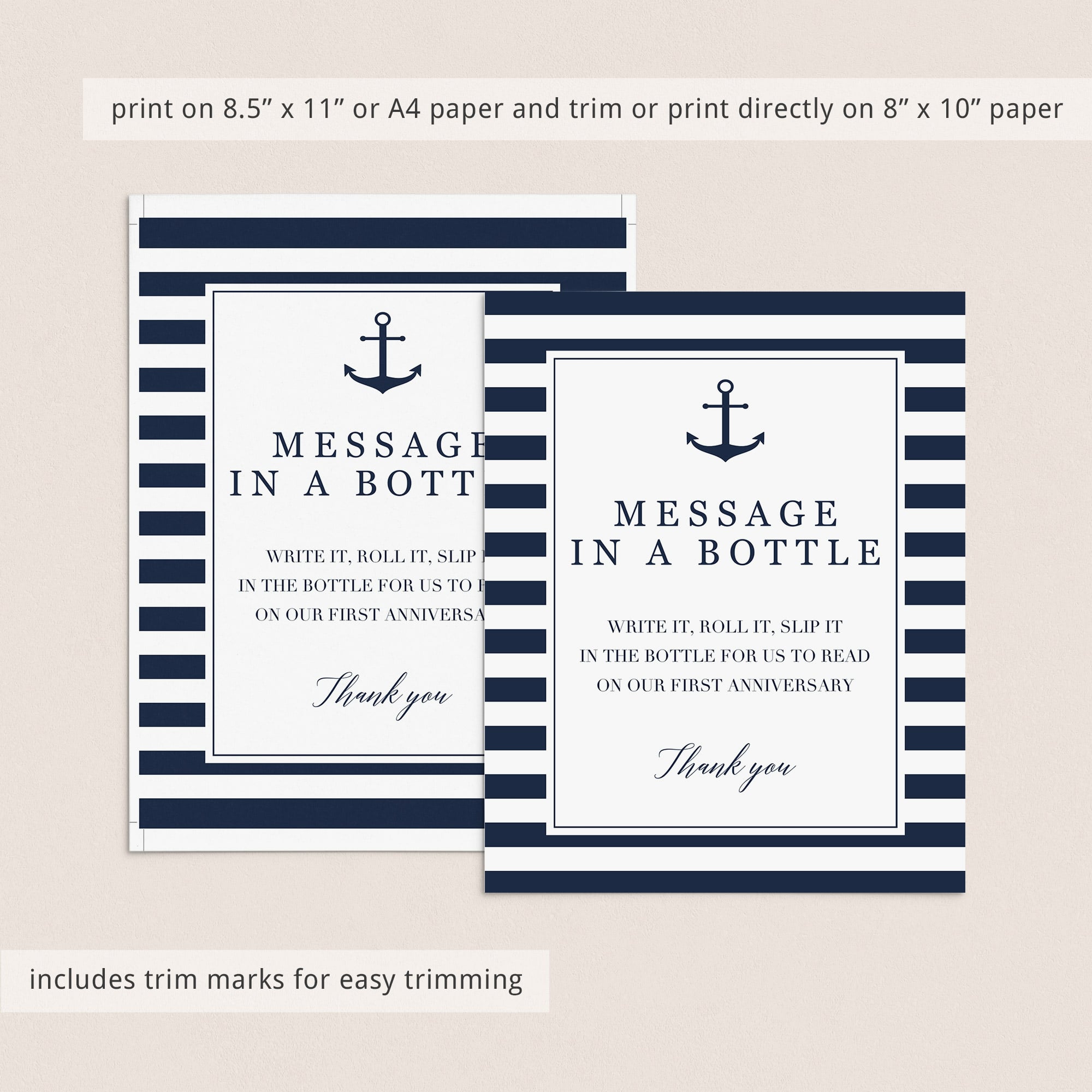 Ask your wedding guests to leave their message for the newlyweds to read on their first anniversary with this nautical "Message in a bottle" sign with anchor and navy and white stripes.