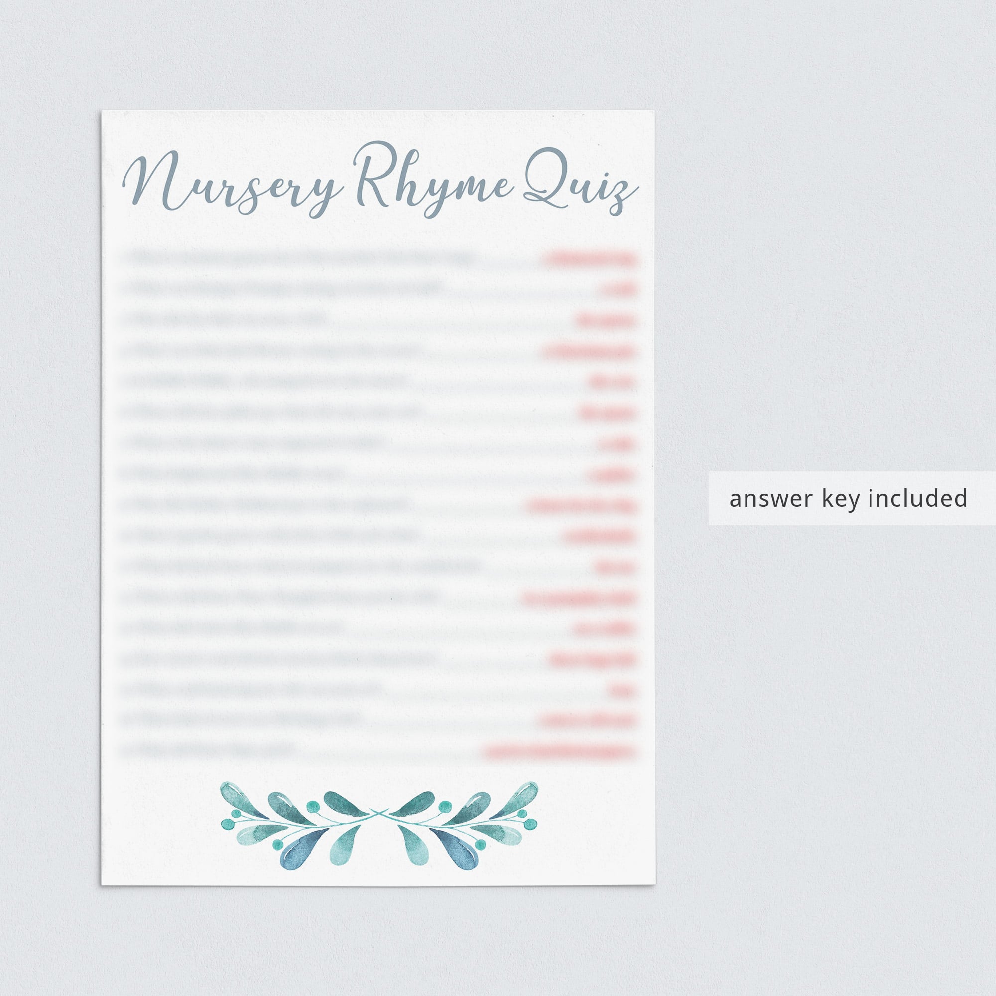 Test your guests how well they know their nursery rhymes with this blue and silver baby shower game Nursery Rhyme Quiz.