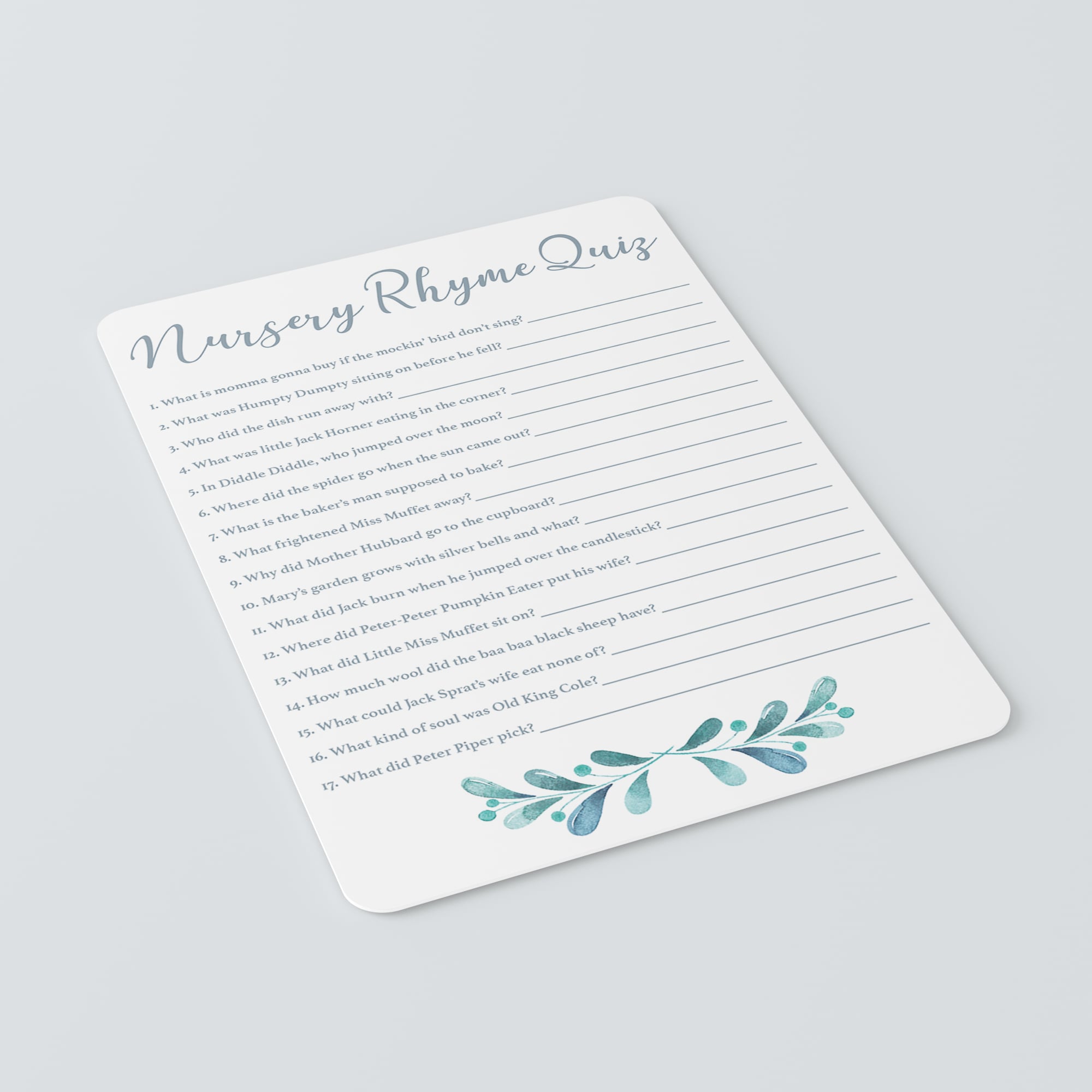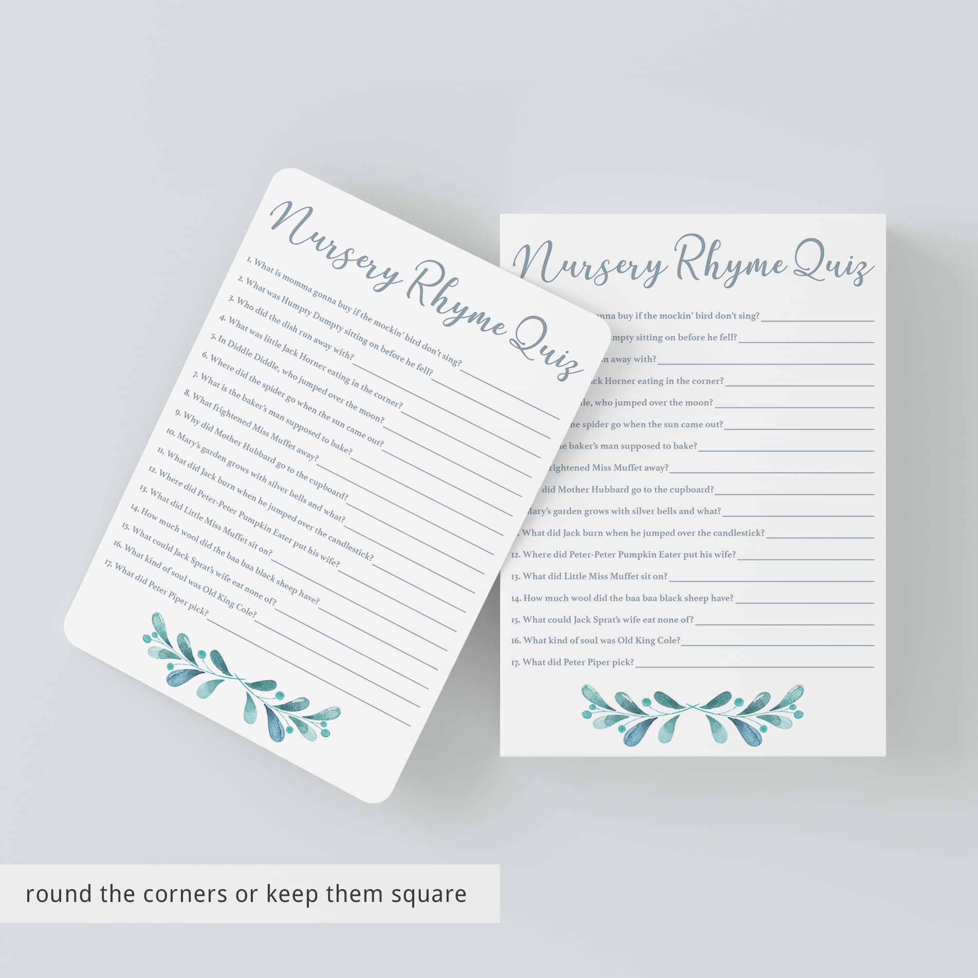 Kick off the fun at your baby shower and recollect childhood nursery rhymes with this blue and silver nursery rhyme quiz.