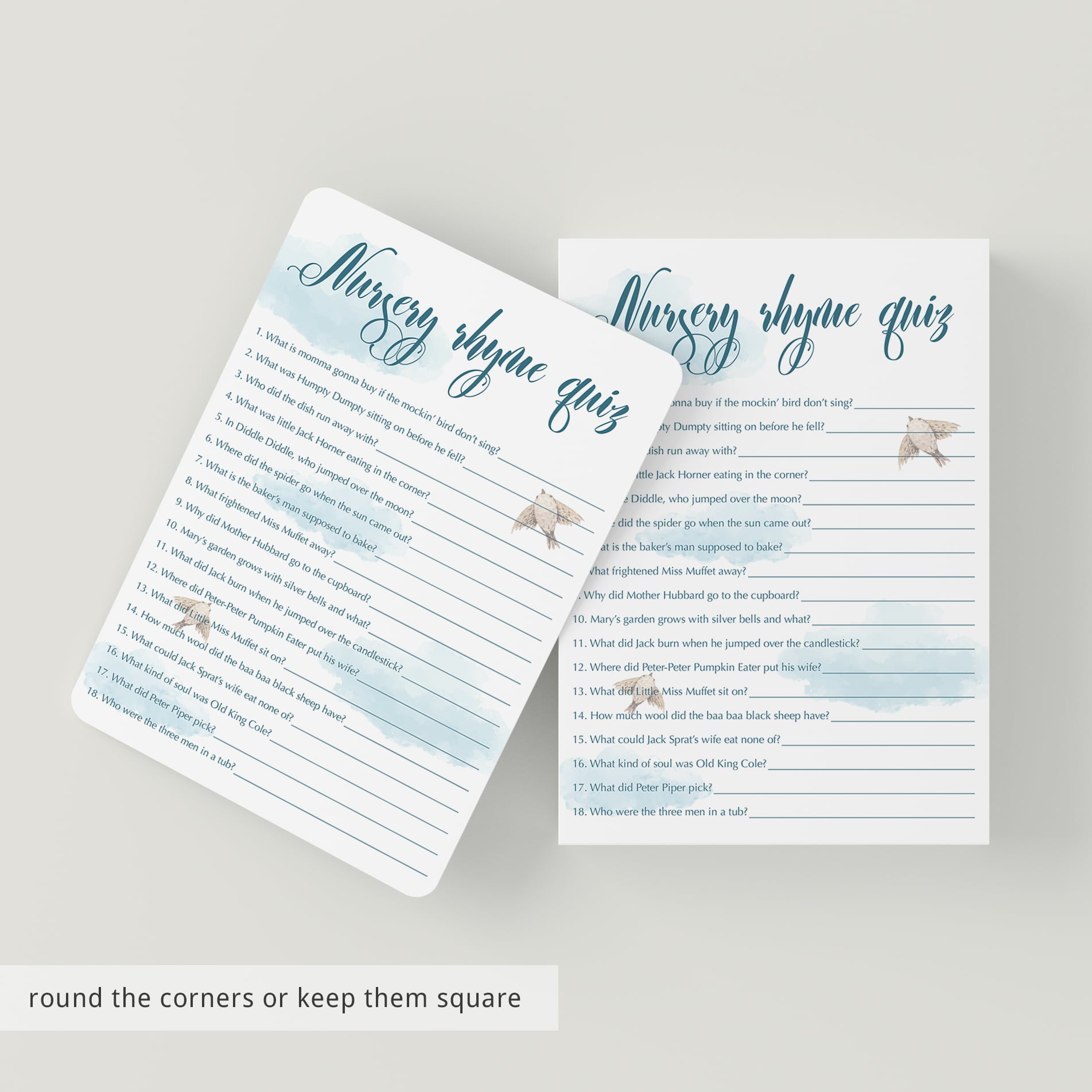 Test your guests how well they know their nursery rhymes with this blue clouds baby shower Nursery Rhyme Quiz.