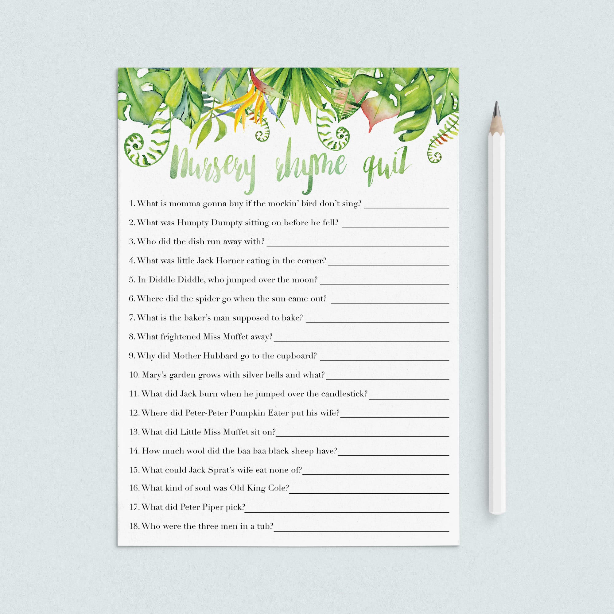 Test your guests how well they know their nursery rhymes with this Luau baby shower Nursery Rhyme Quiz.