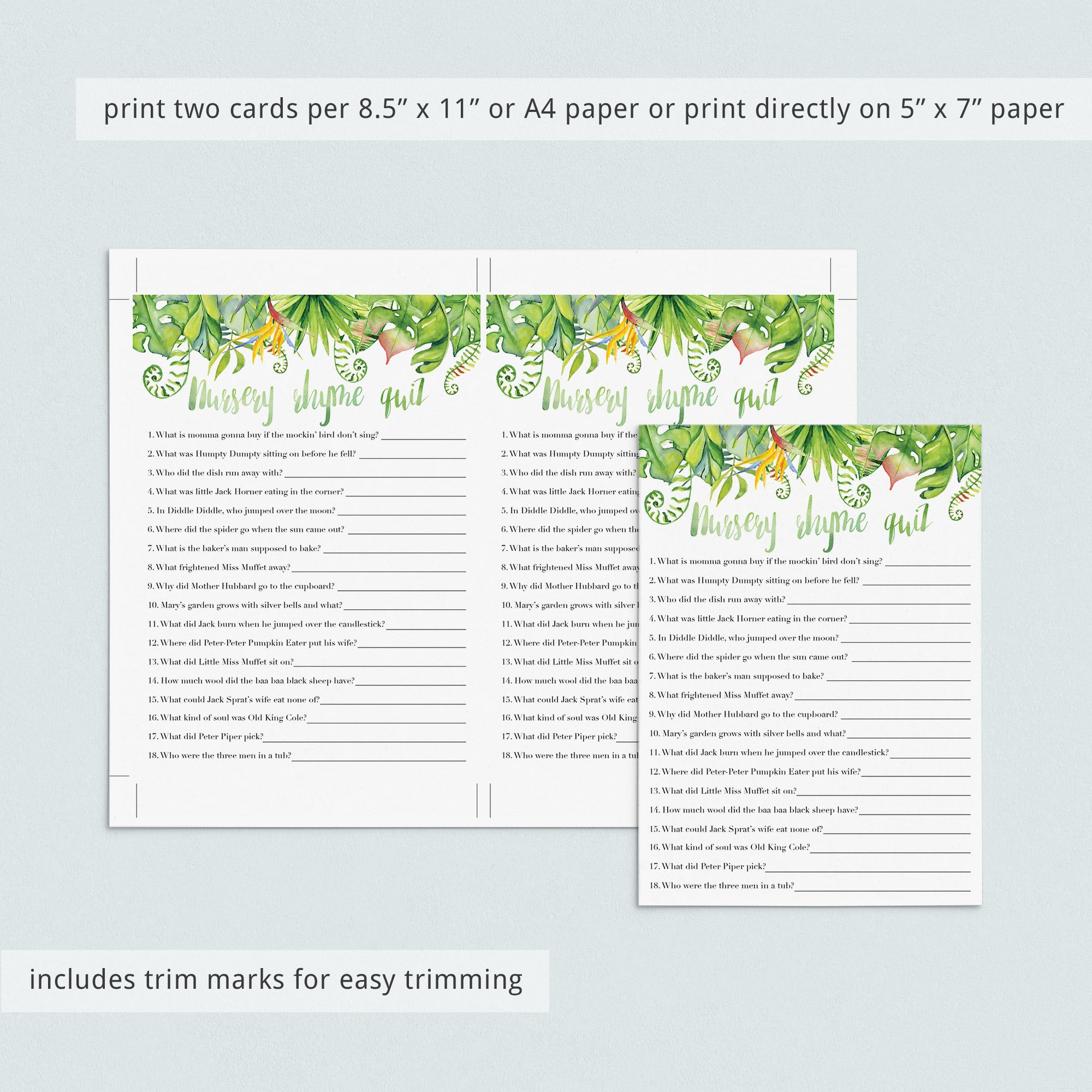 This Luau baby shower game with tropical leaves is an instant download, so simply download and print the cards as many times as you need. Print right from your computer in a matter of minutes or have the cards printed at your favorite print shop.