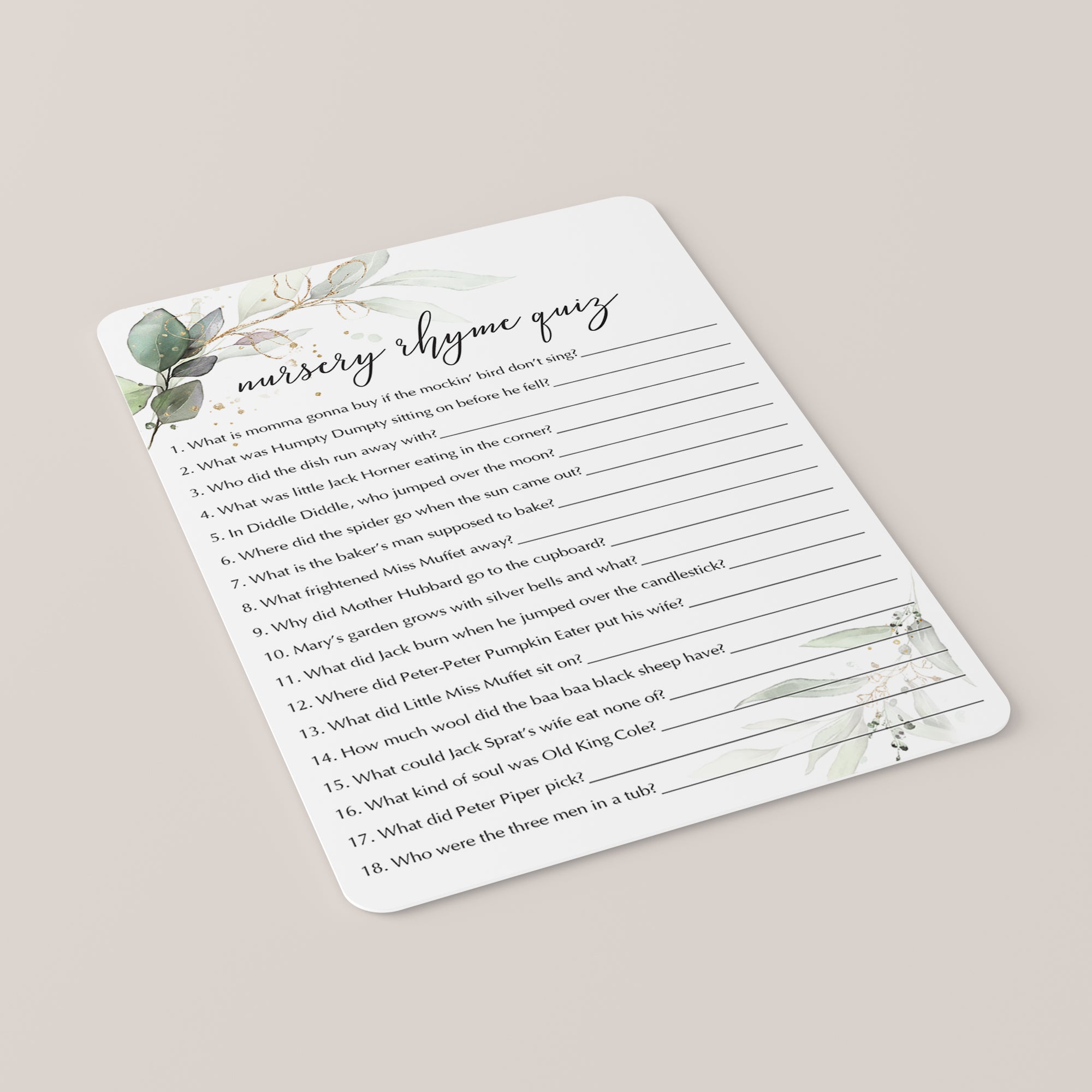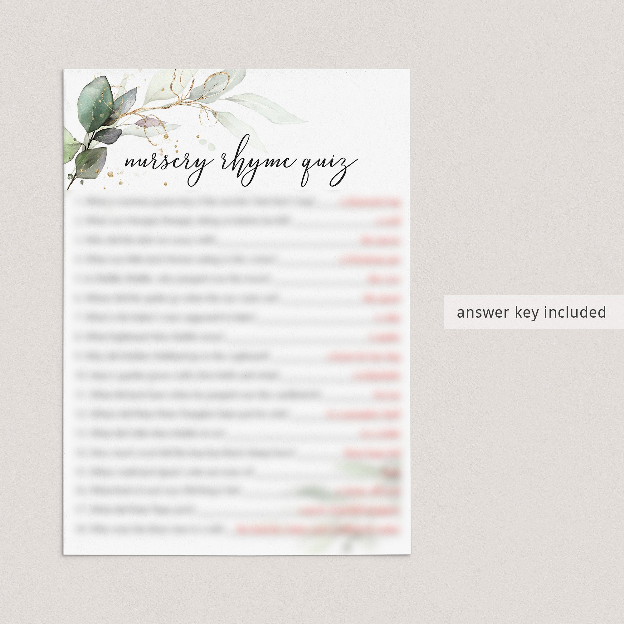 Test your guests how well they know their nursery rhymes with this modern baby shower game Nursery Rhyme Quiz. The game card with watercolor leaves and faux gold foil is the perfect addition to your modern chic baby shower.