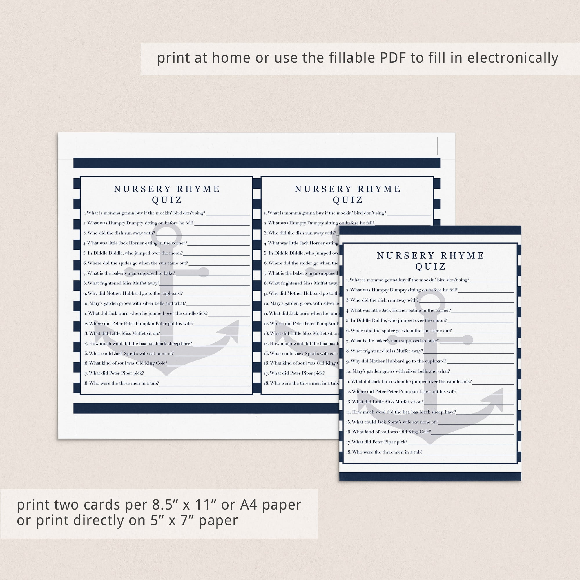 Test your guests how well they know their nursery rhymes with this nautical baby shower Nursery Rhyme Quiz. Printable and electronically fillable PDF files are included.