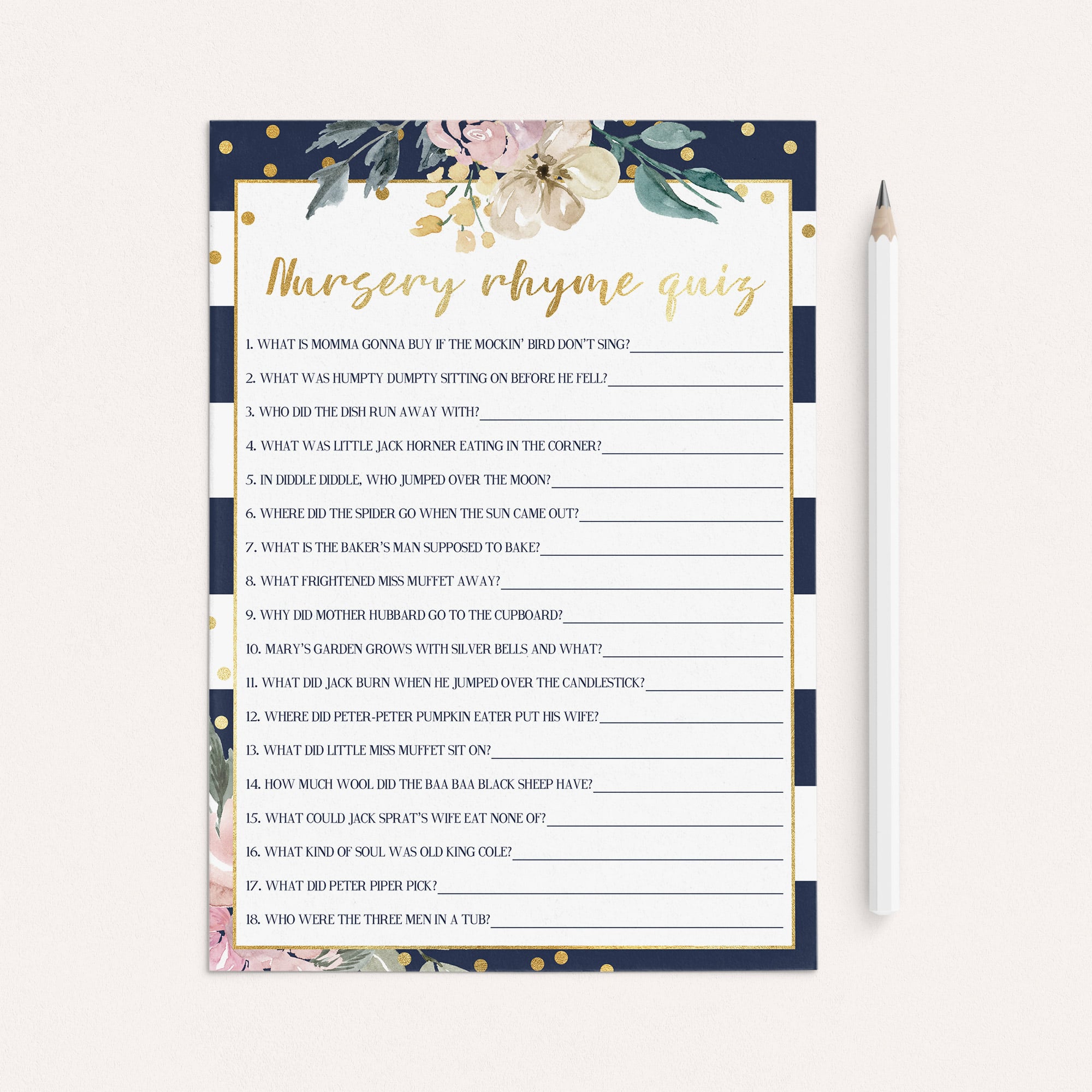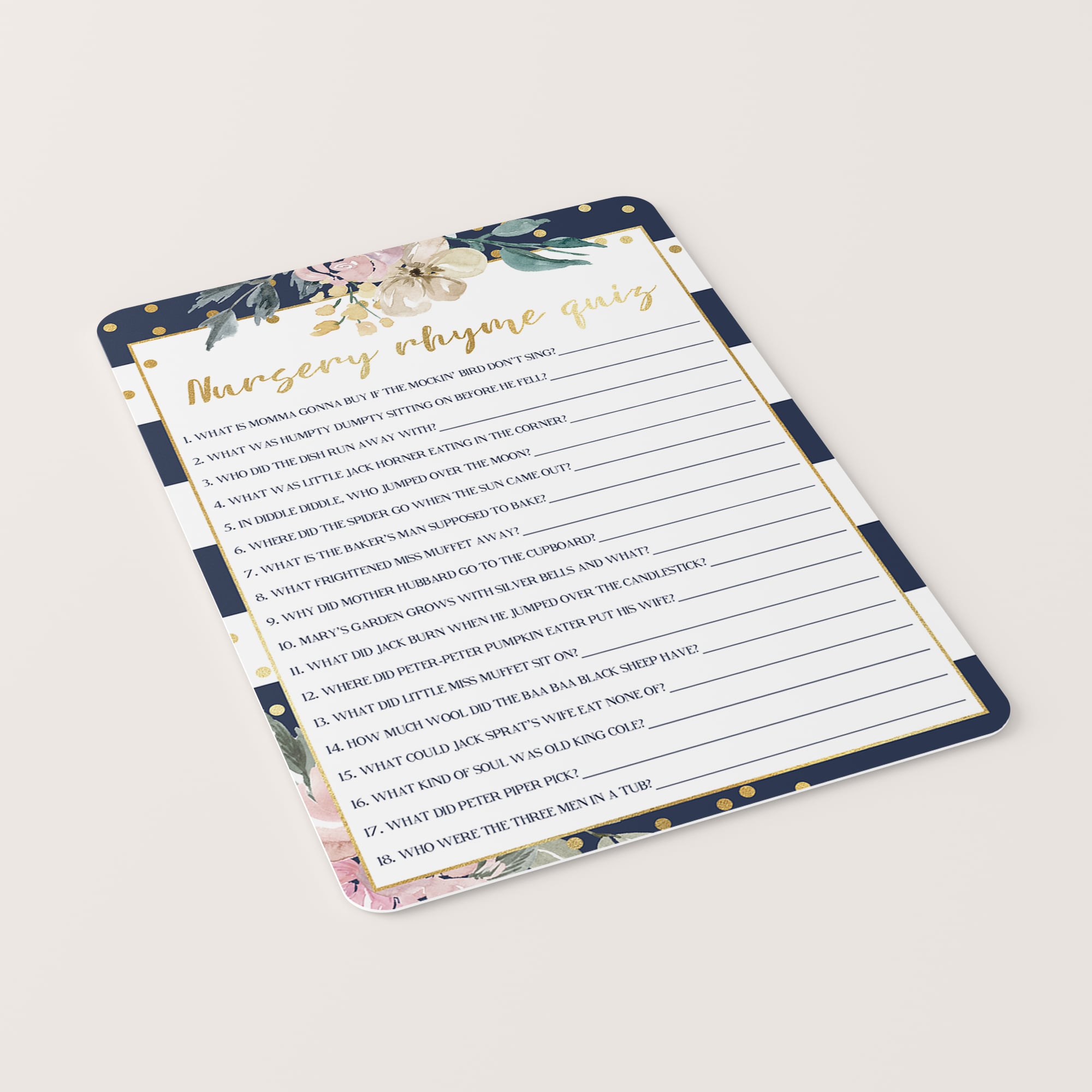 Test your guests how well they know their nursery rhymes with this gorgeous pink and navy baby shower game Nursery Rhyme game.