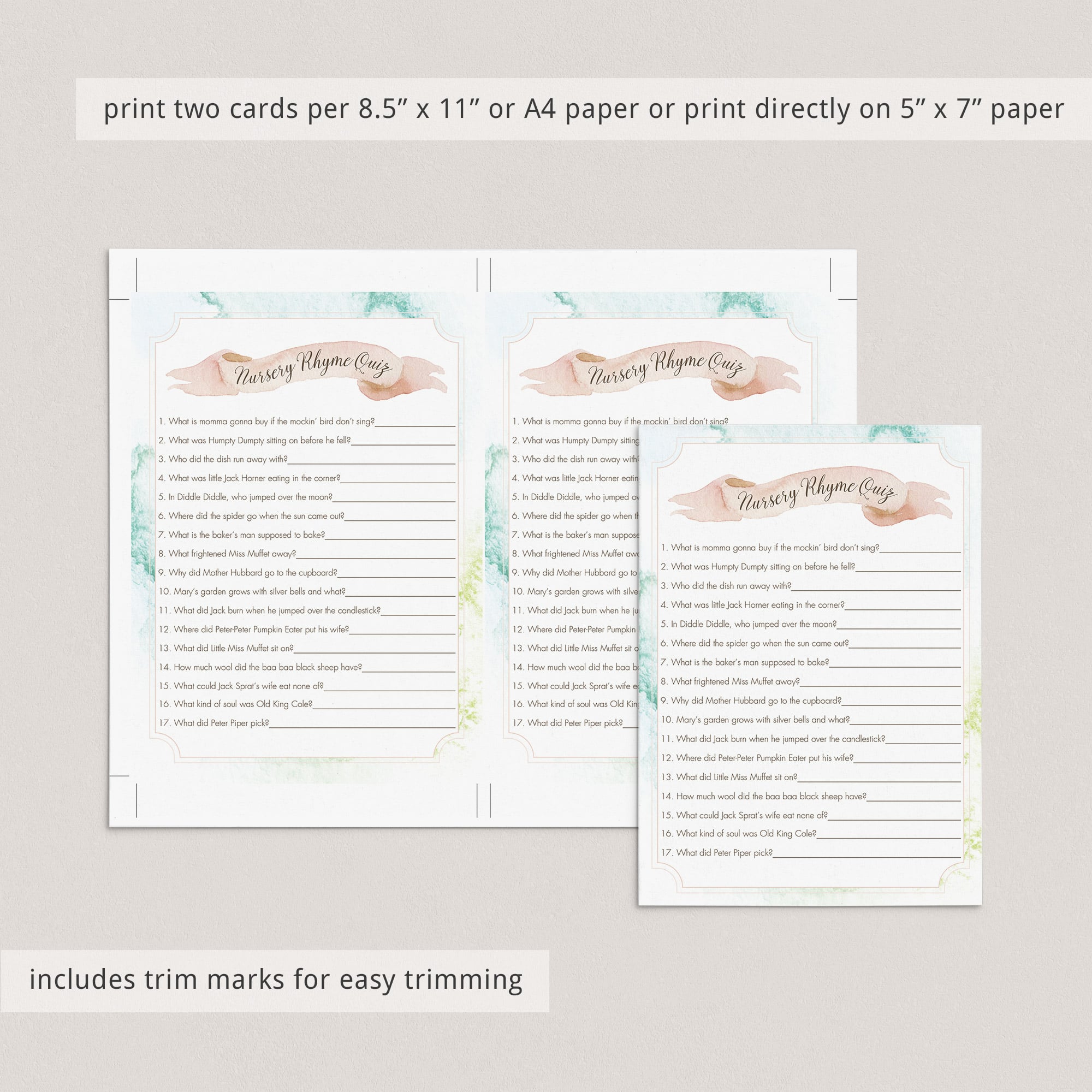 Kick off the fun at your baby party and recollect childhood nursery rhymes with this watercolor nursery rhyme game.