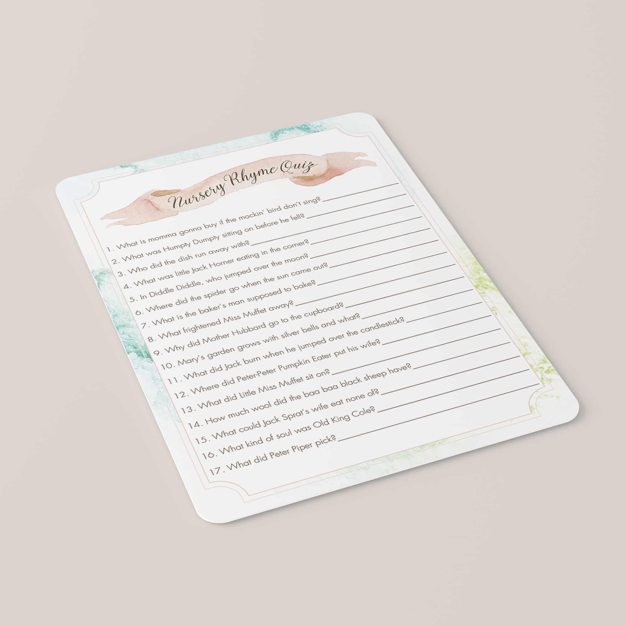 Test your guests how well they know their nursery rhymes with this watercolor blush baby Nursery Rhyme Quiz.
