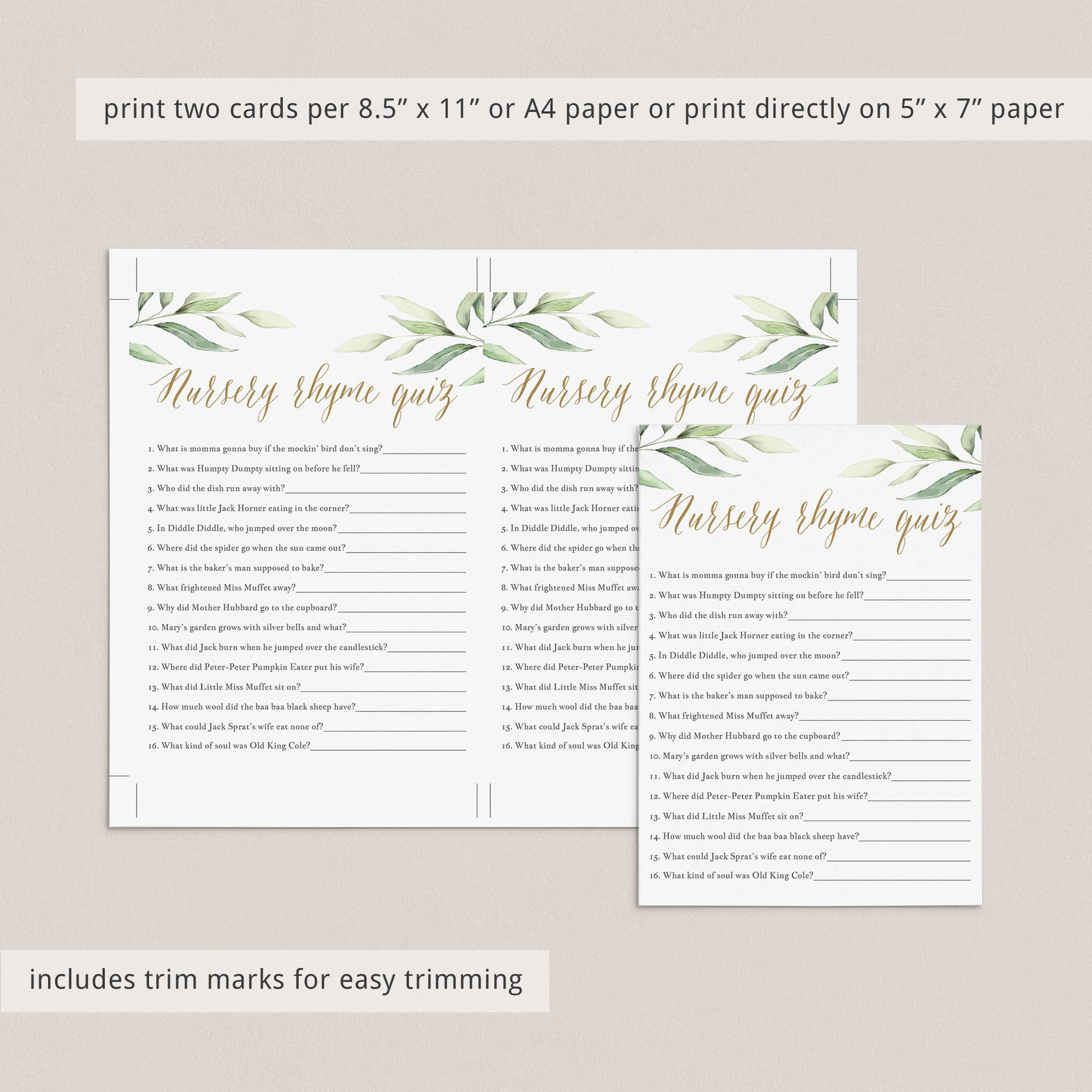 This greenery baby shower game is an instant download, so simply download and print the nursery rhyme games as many times as you need. Print right from your computer in a matter of minutes or have the cards printed at your favorite print shop.
