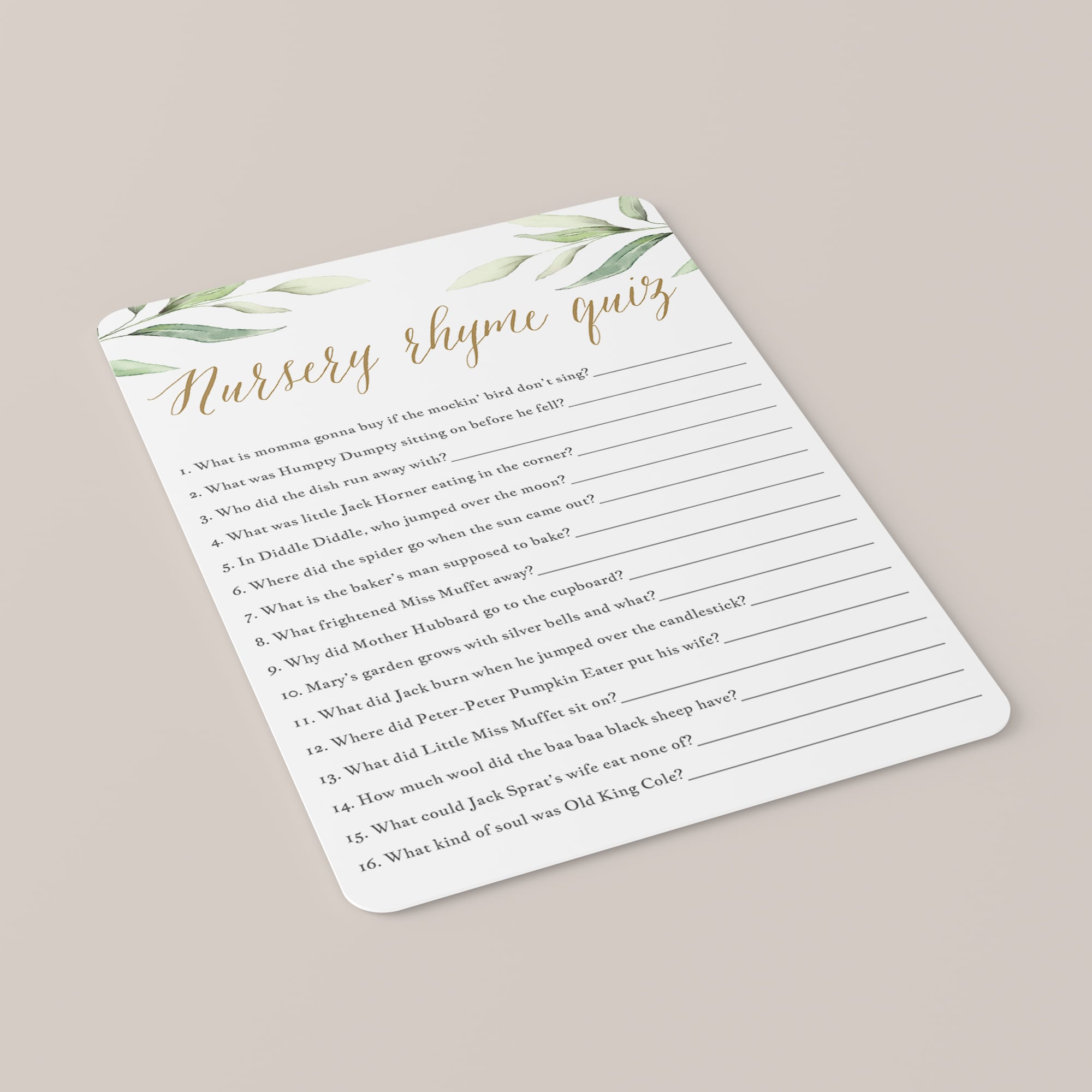 Kick off the fun at your baby shower and recollect childhood nursery rhymes with this watercolor greenery baby shower game.