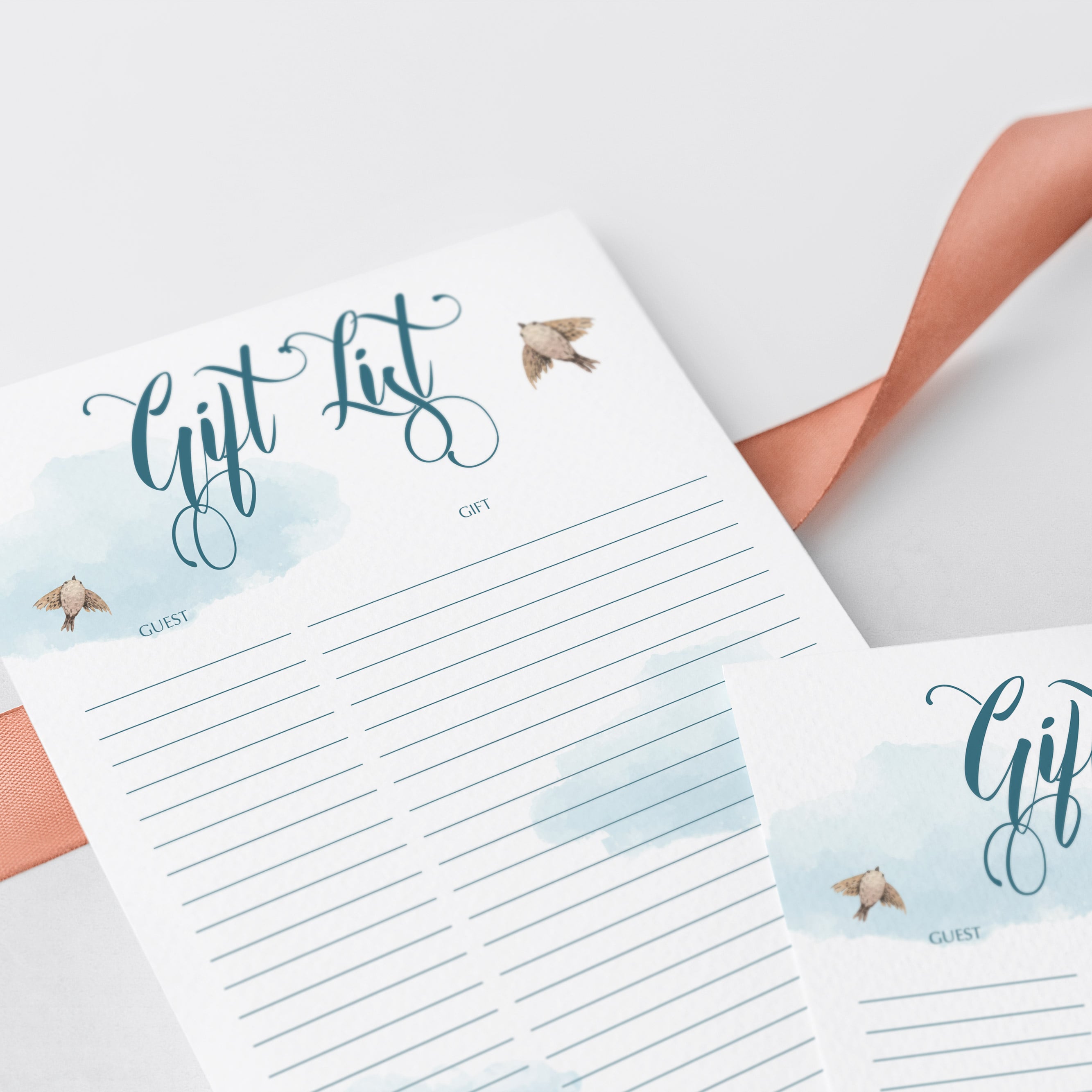 Are you hosting an Up and Away themed party? Use this blue party supplies bundle with watercolor clouds to take notes to remember who gave each gift and to thank your guests for coming. The bundle includes a gift log sheet, a favor tag and thank you cards. With these essential blue party supplies, you’ll be ready in no-time!