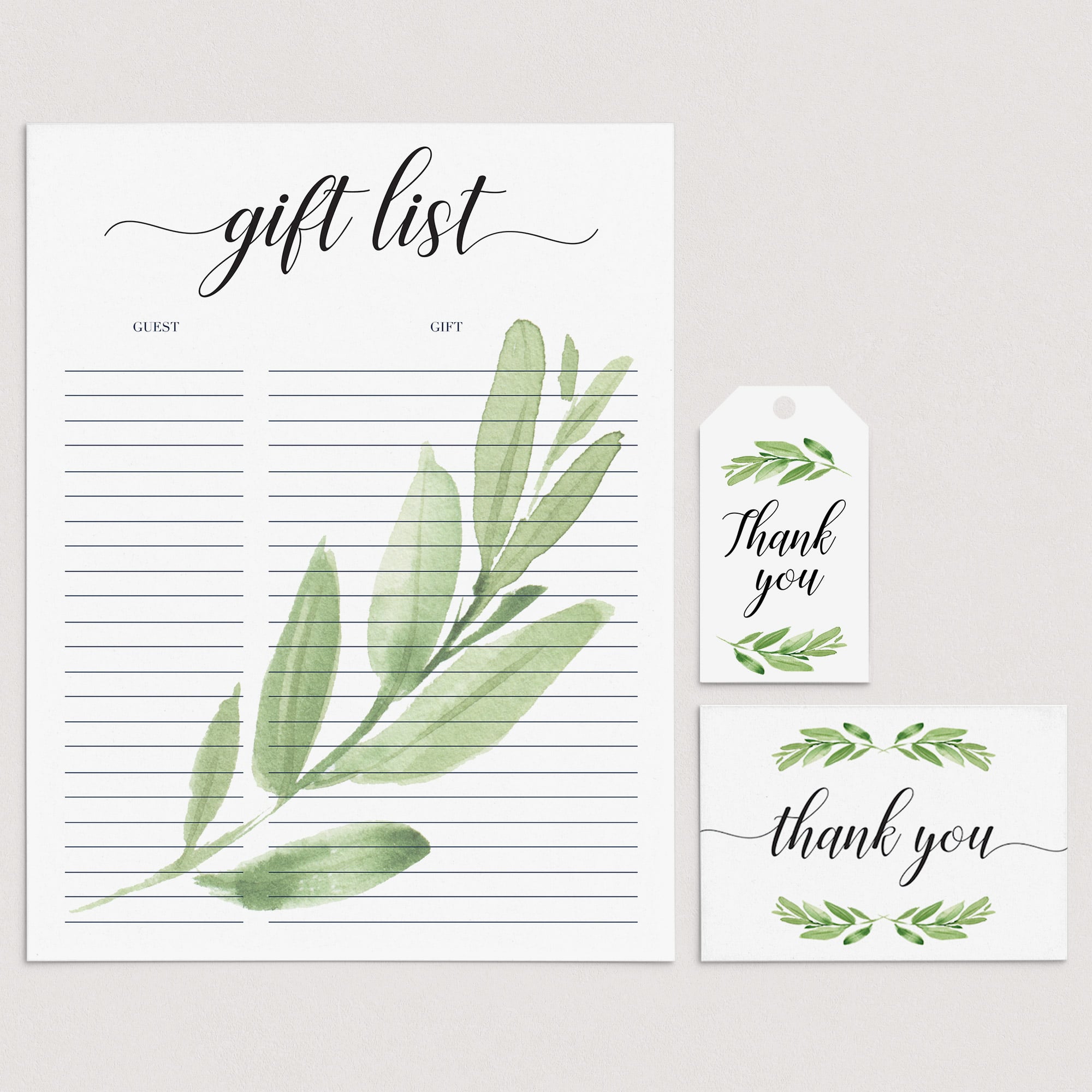 Are you hosting a greenery party? Use this greenery party supplies package to take notes to remember who gave each gift and thank your guests for coming. The printable package includes a gift list, favor tag template and thank you card. With these essential greenery party supplies, you’ll be ready in no-time!