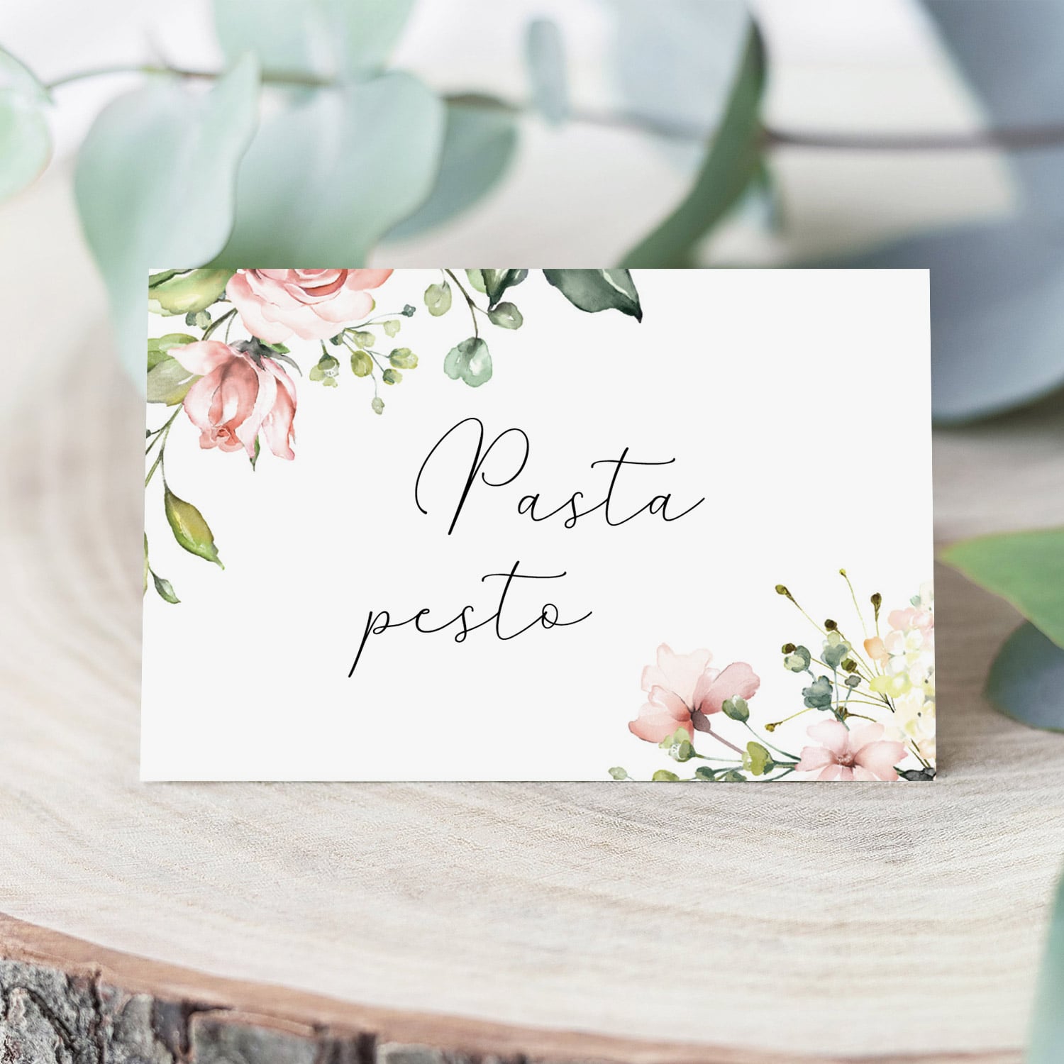 Decorate your buffet table with these gorgeous blush floral food cards. The editable food cards are perfect to label desserts or serve as place cards at a floral themed event.