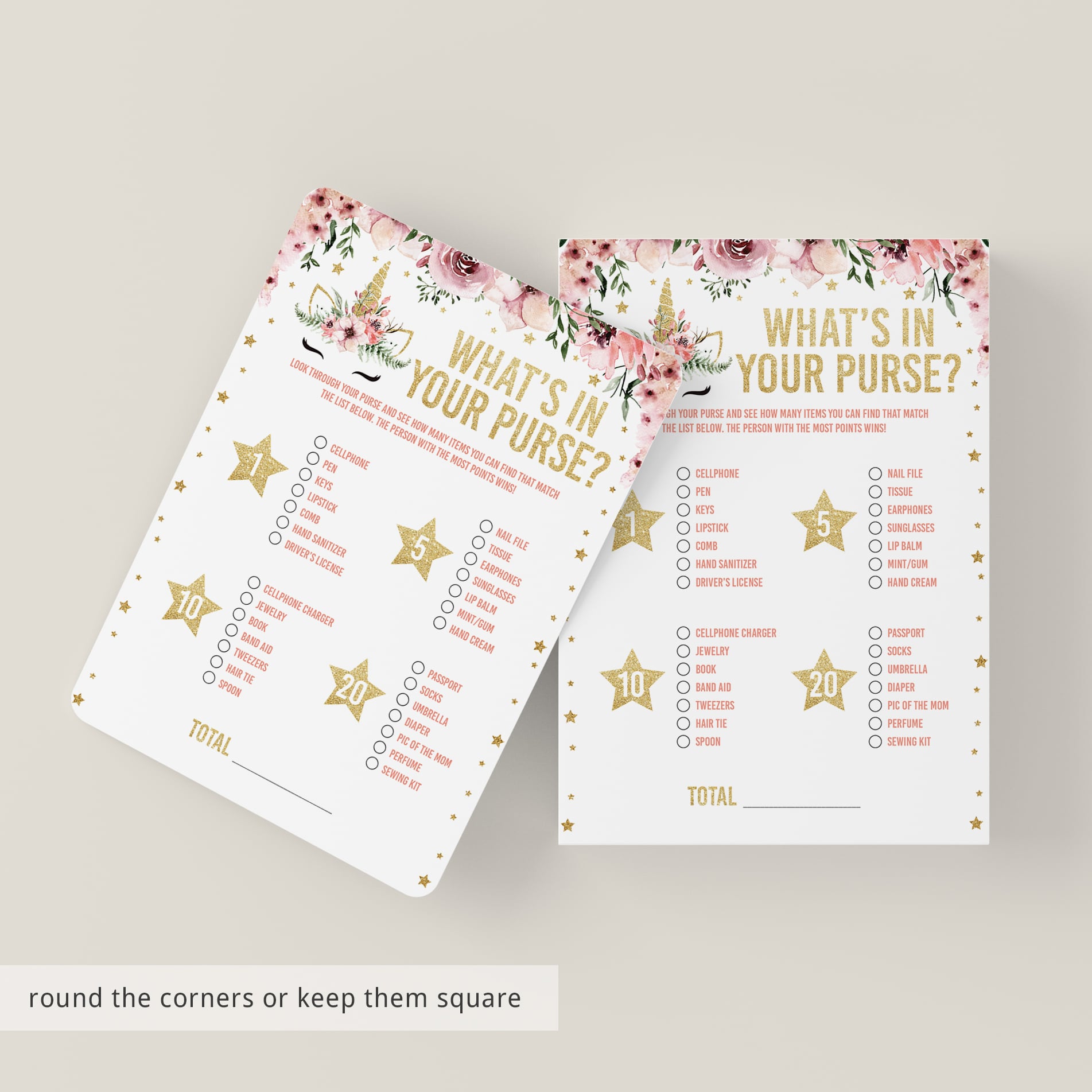 These unicorn baby shower game cards with pink flowers and gold stars list common and not-so-common items found in handbags, including lipstick, keys, tweezers, and socks. This game is perfect for a girl baby shower.