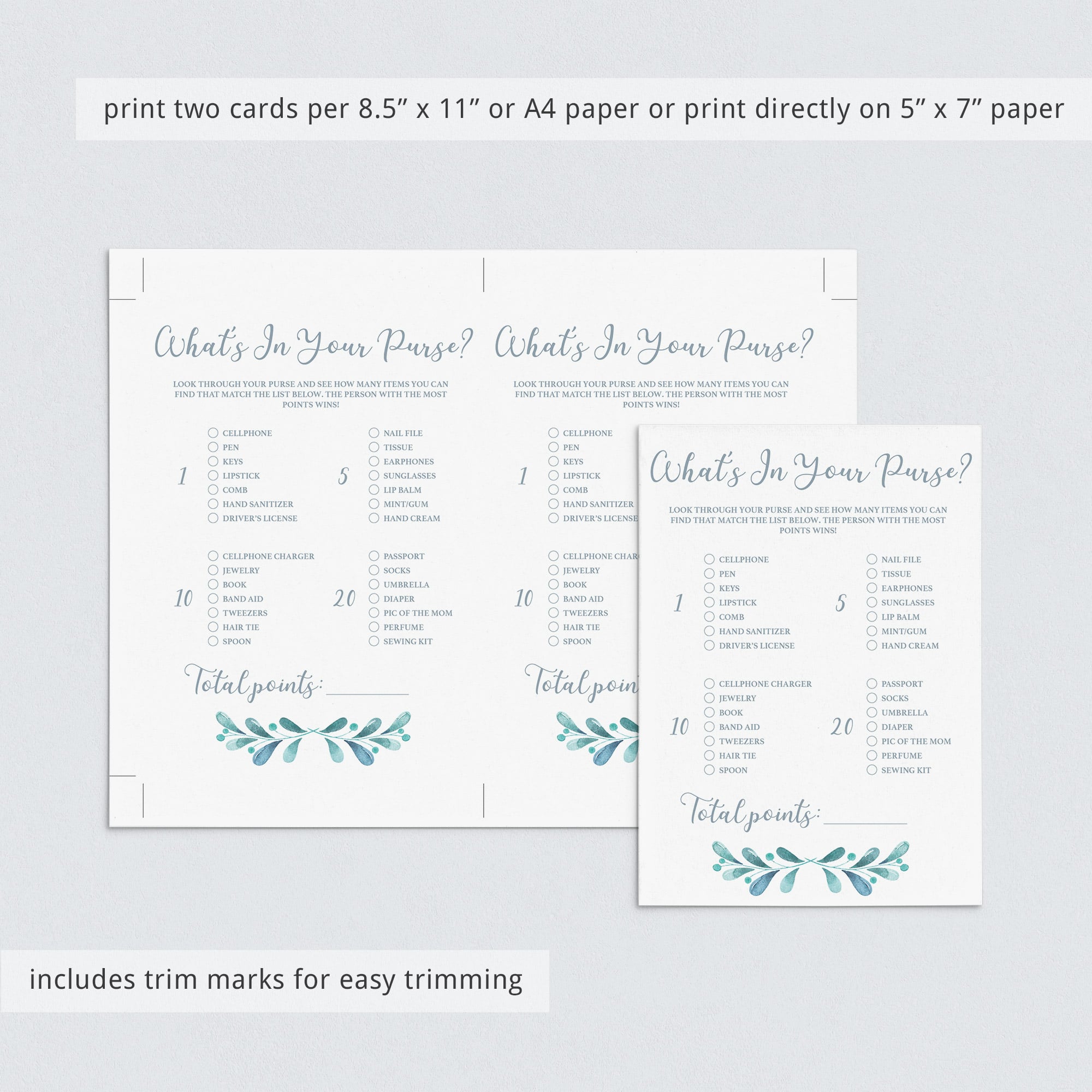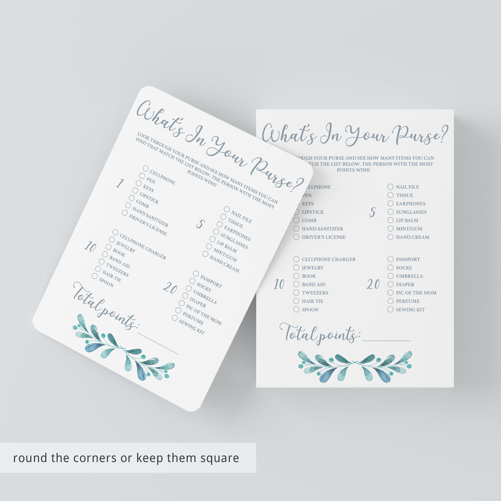 The game is very easy to play. Simply pass these watercolor game cards around during the baby shower where guests will have fun going through their purse and checking off items what they have from the list. Your friends gain points for each item on the list that they have in their purse. The player with the most points wins!