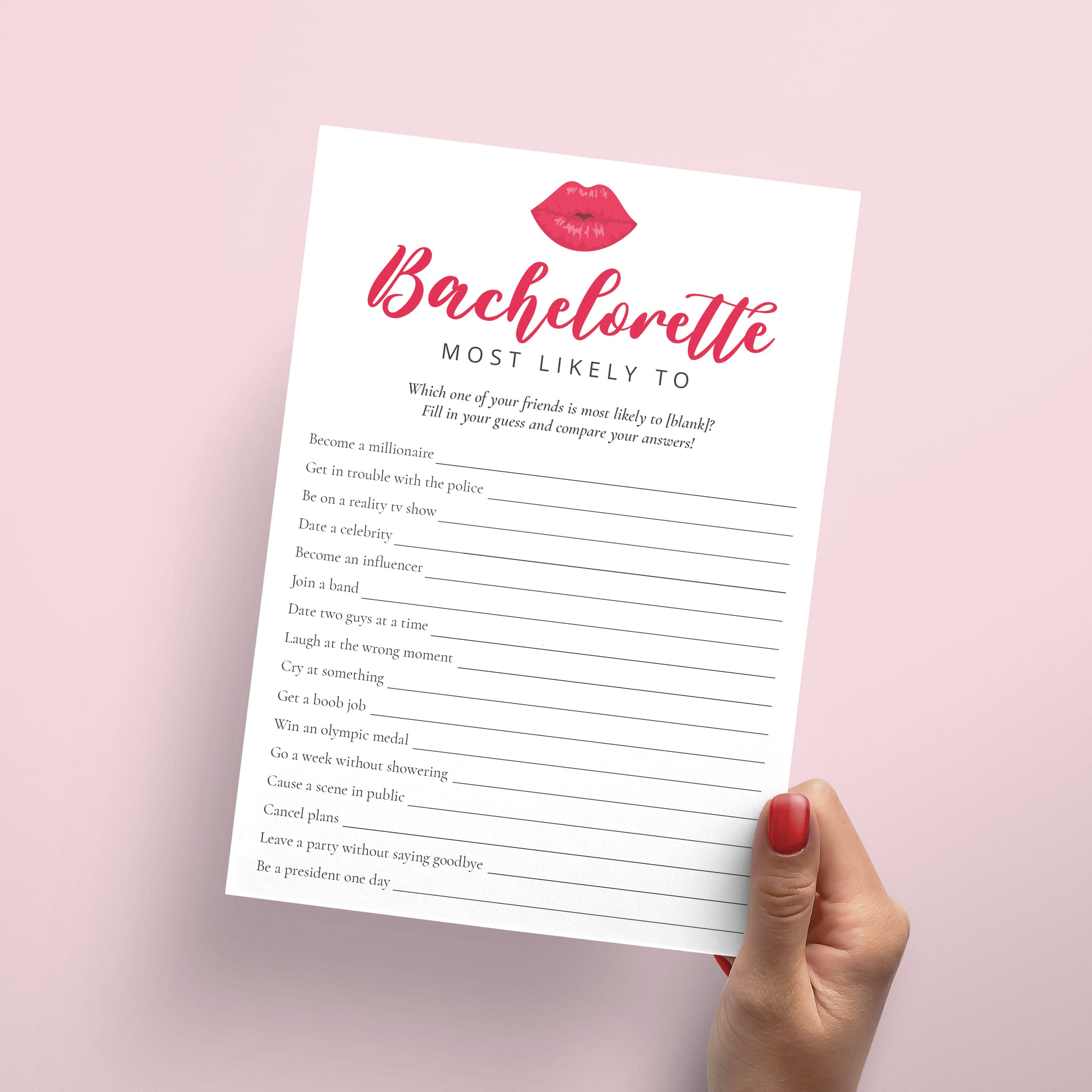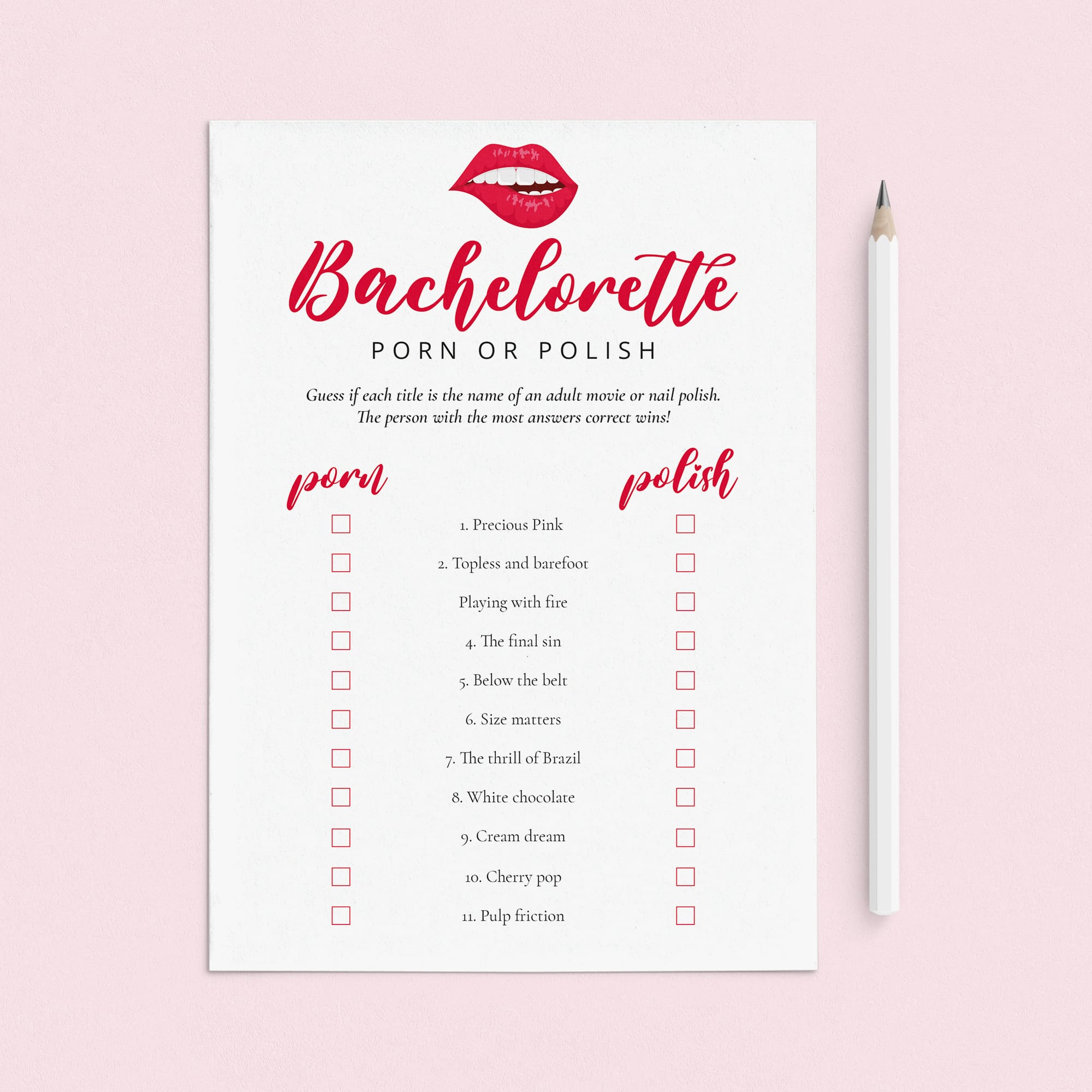 Looking for a fun addition to your bachelorette party? This bachelorette party games bundle is all about fun, friendship and lots of laughter. Perfect for a bachelorette weekend, Galentines party, or a girls night any day of the year. Each game features cheeky red lips for a playful and flirty vibe that sets the tone for an unforgettable party with your favorite ladies.