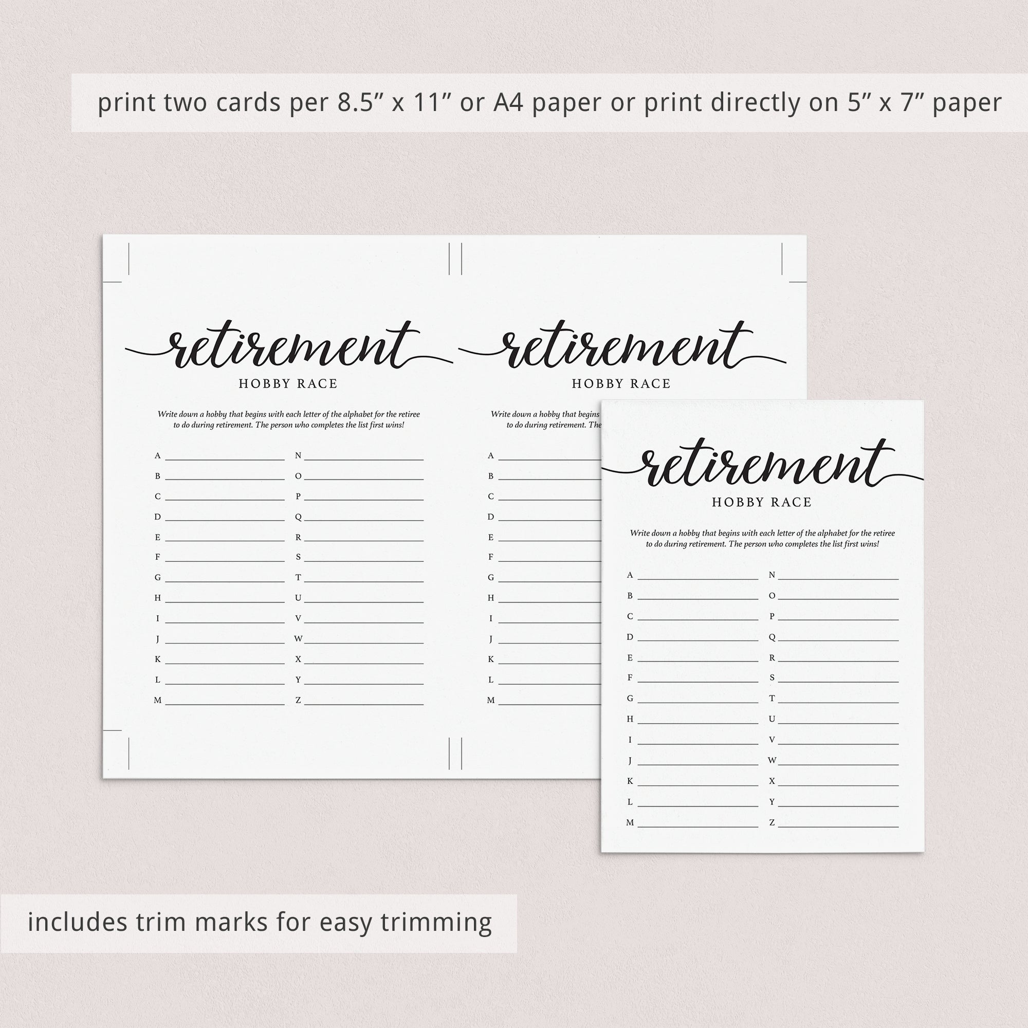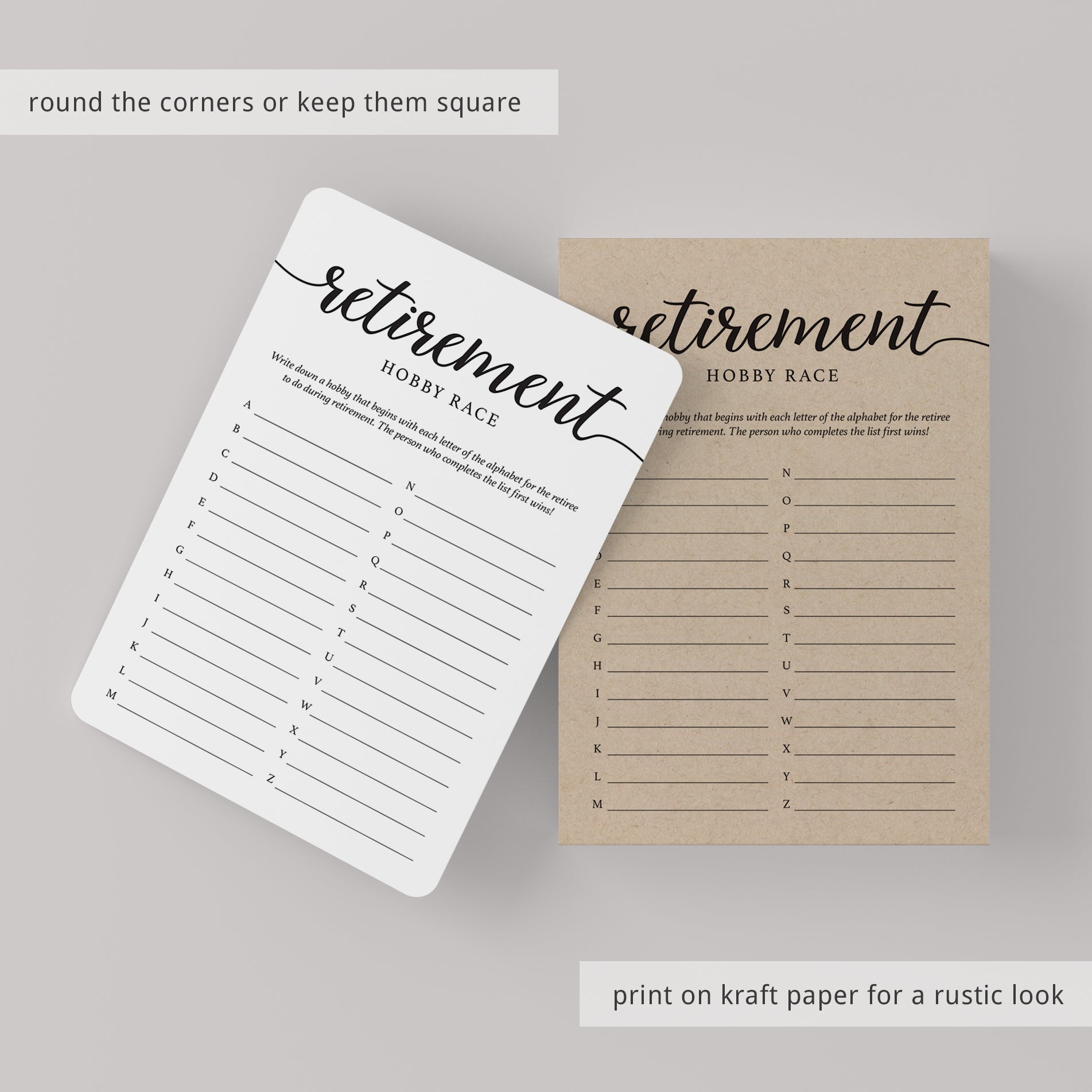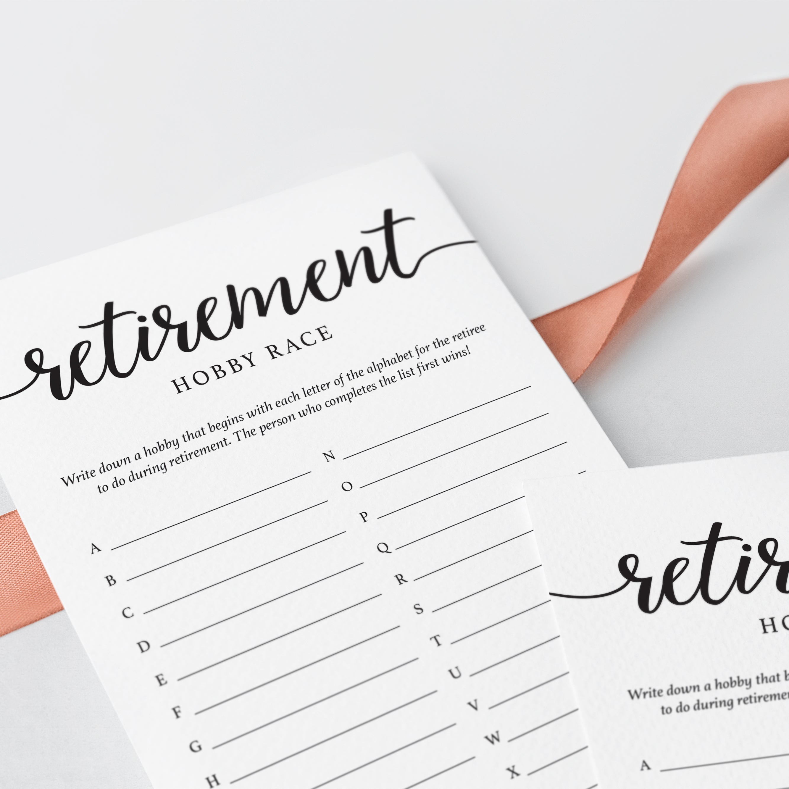 Are you looking for the perfect ice breaker for your retirement party? Play Retirement Hobby Race! This minimal calligraphy Retirement Party game is the perfect addition to any retirement party.