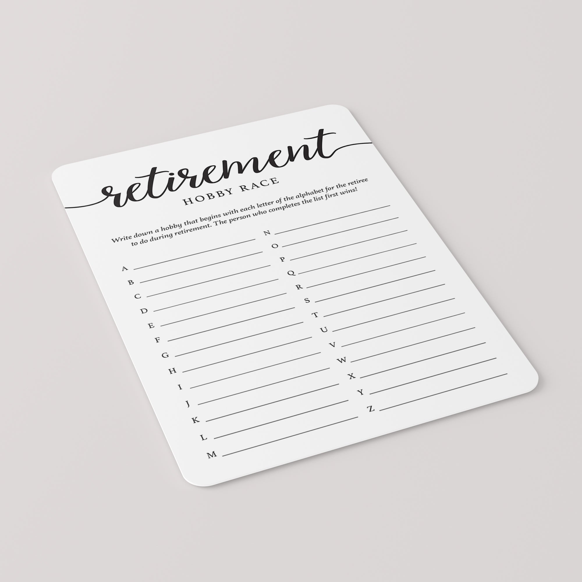The funny game is very easy to play. Hand out a Hobby Race game card and a pen to your guests. They will have to come up with hobbies for the retiree to do during tirement that begin with each letter of the alphabet as fast as they can. The first person to get all the hobbies from A to Z wins!