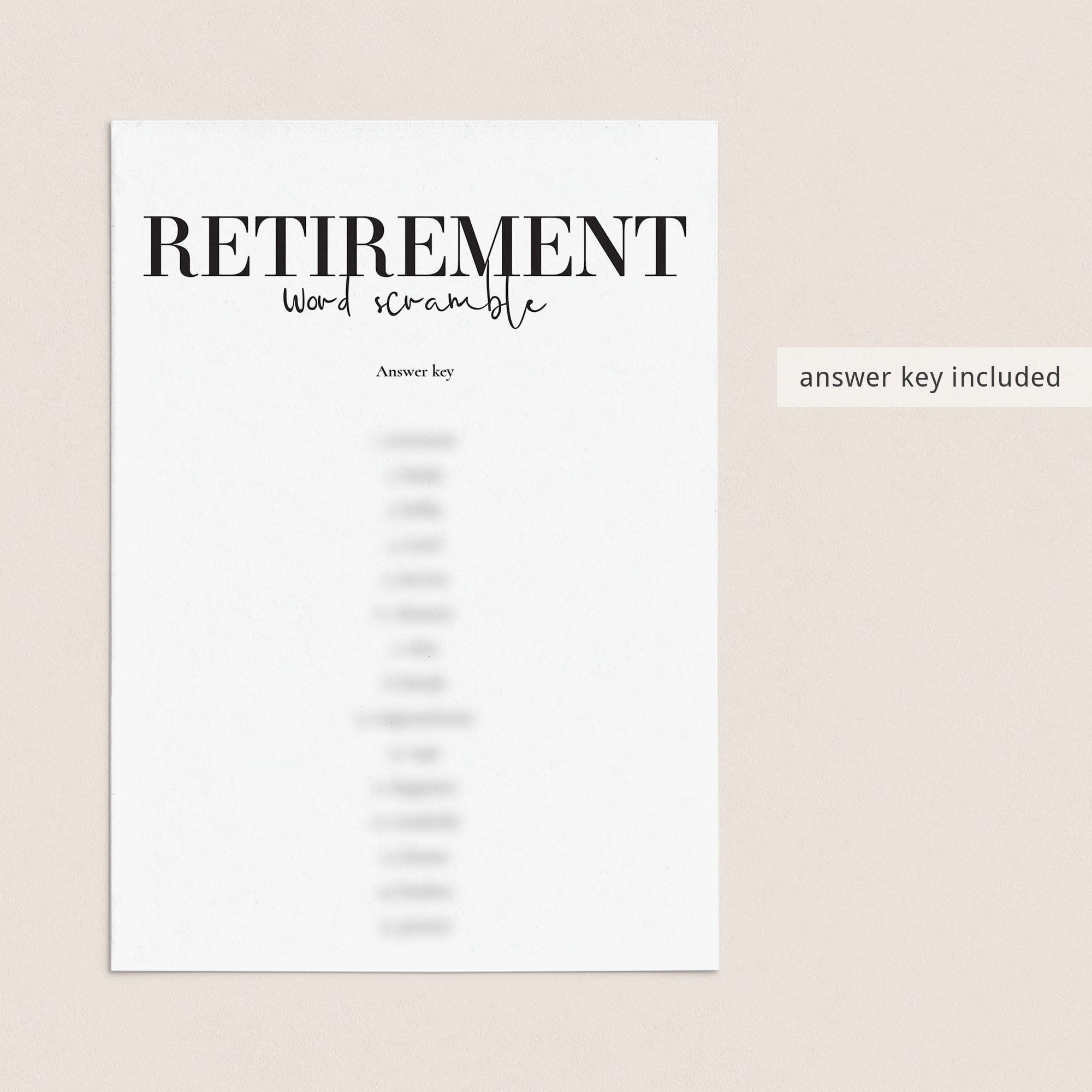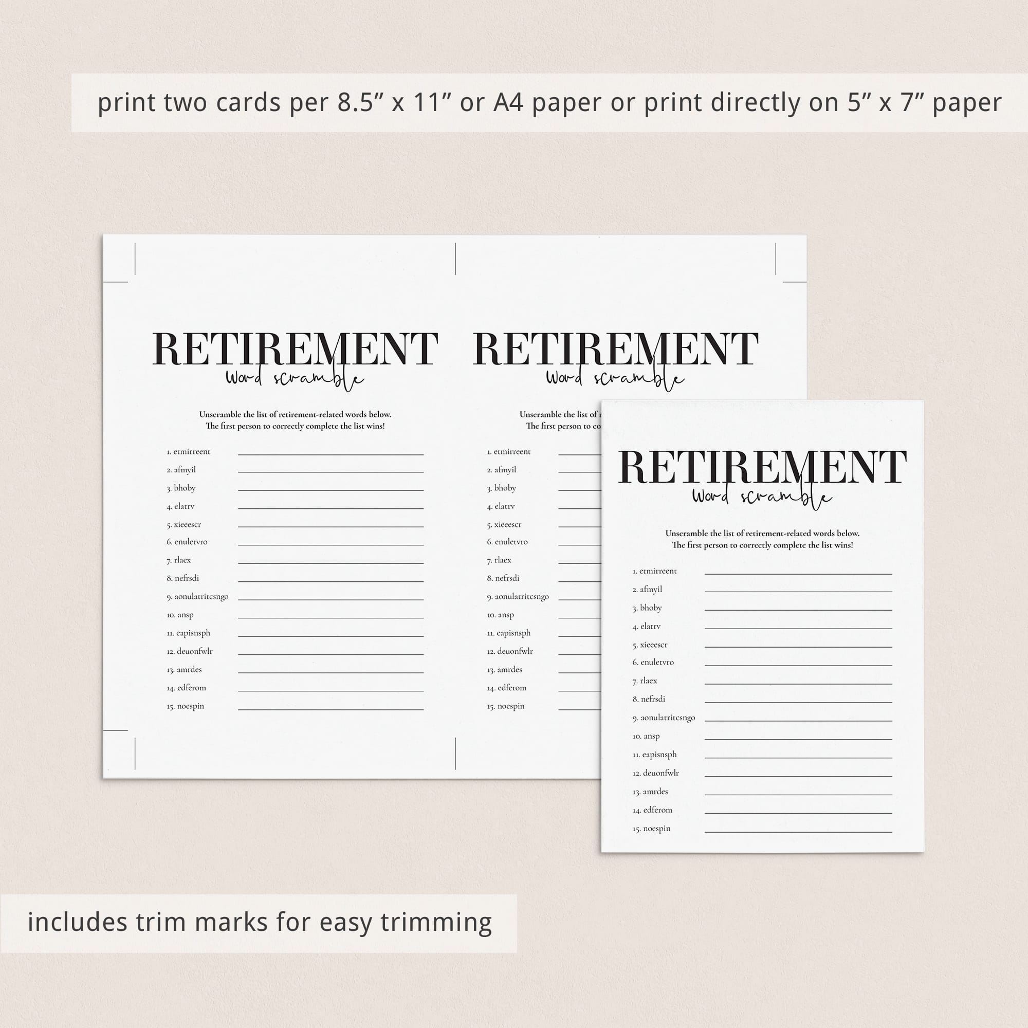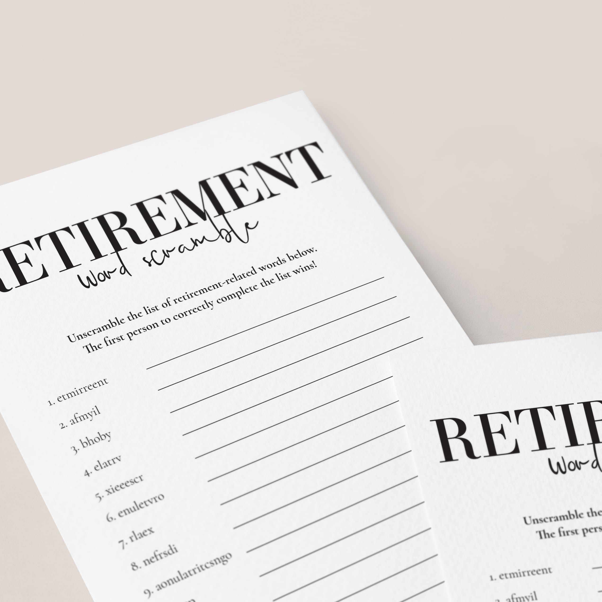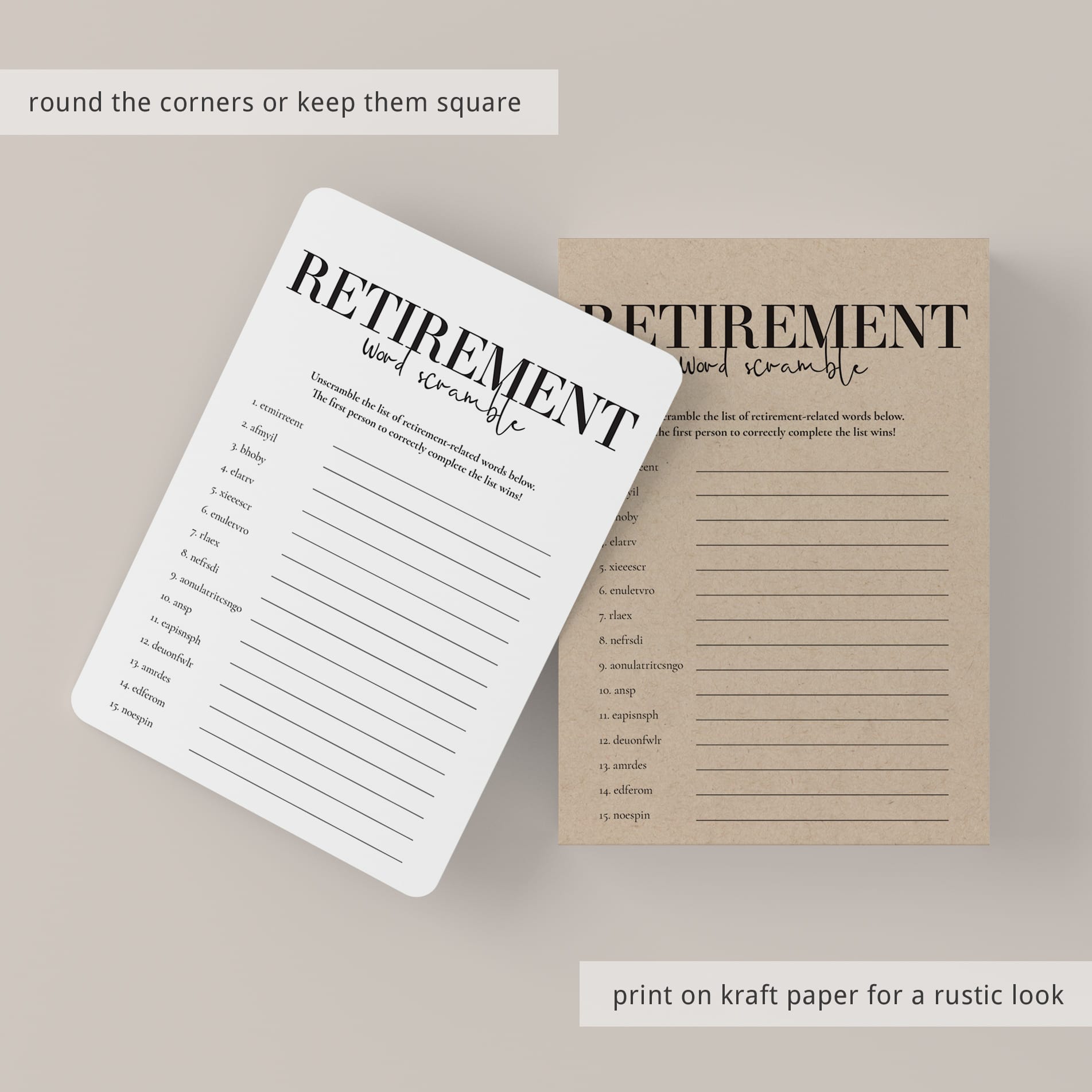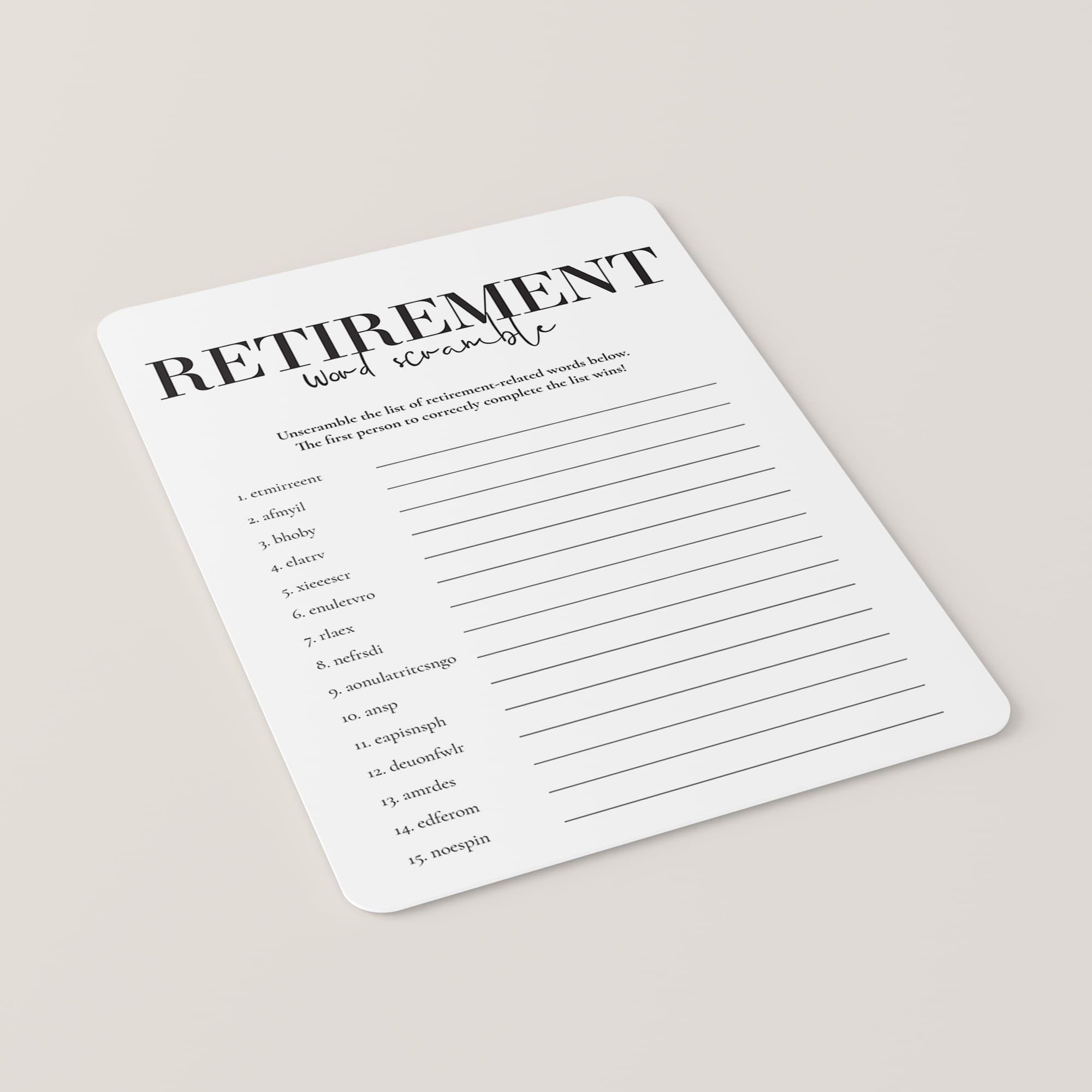 Play one of the most popular party games with this modern Retirement Word Scramble game. The black and white game will fit any retirement party theme. This game will create a fun and enjoyable moment for all of your guests.