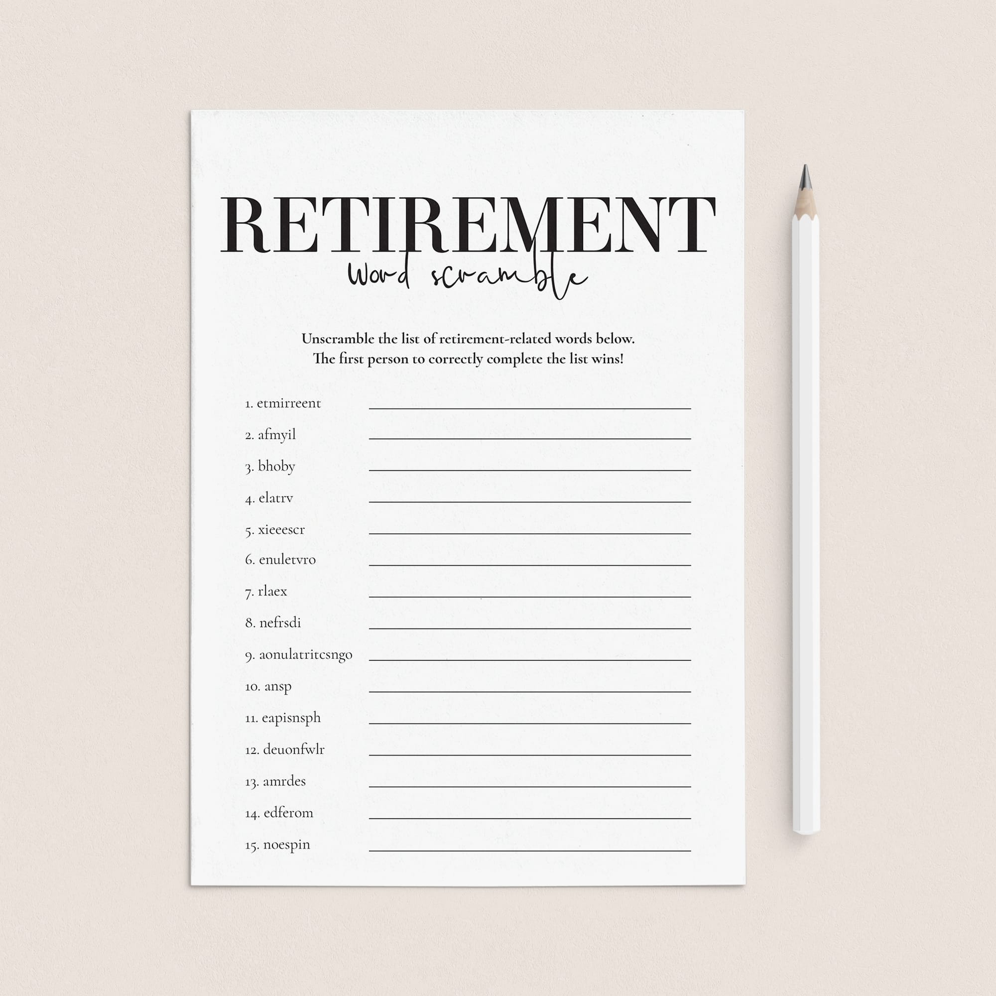 To play this game simply pass out a copy face down to your guests. When all sheets are handed out, have everyone turn their paper over and try to unscramble the retirement-related words. The first person to unscramble all of the words wins. Be sure to have a prize on hand for the winner!