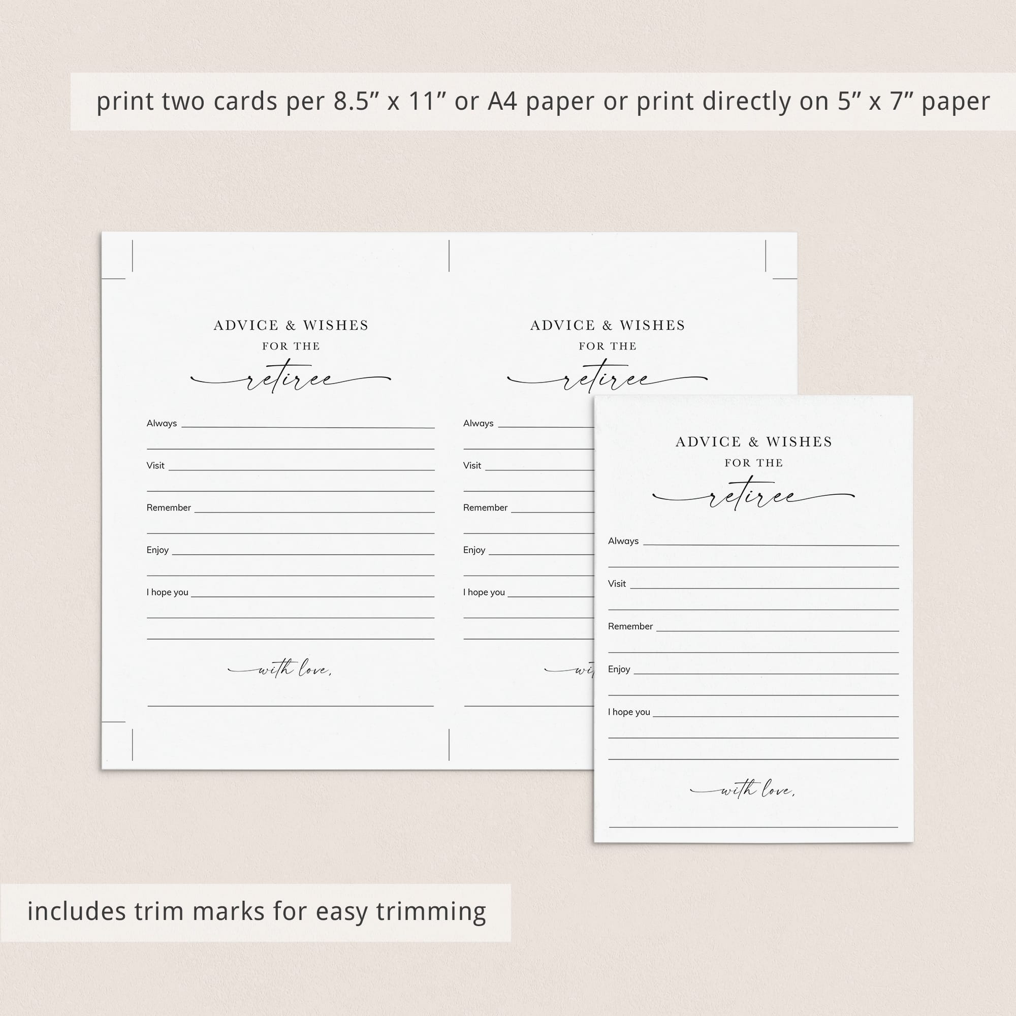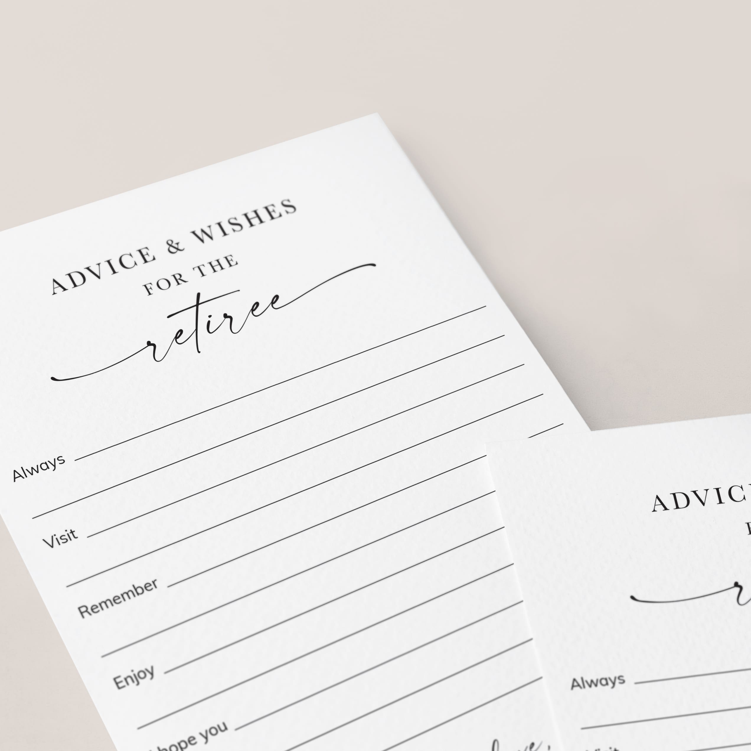 Create an amazing keepsake for the retiree with these retirement Advice and Wishes cards with a stylish script font and clean black and white design. Let your co-workers, family and friends write down their wishes and advice and collect the cards for the retiree.