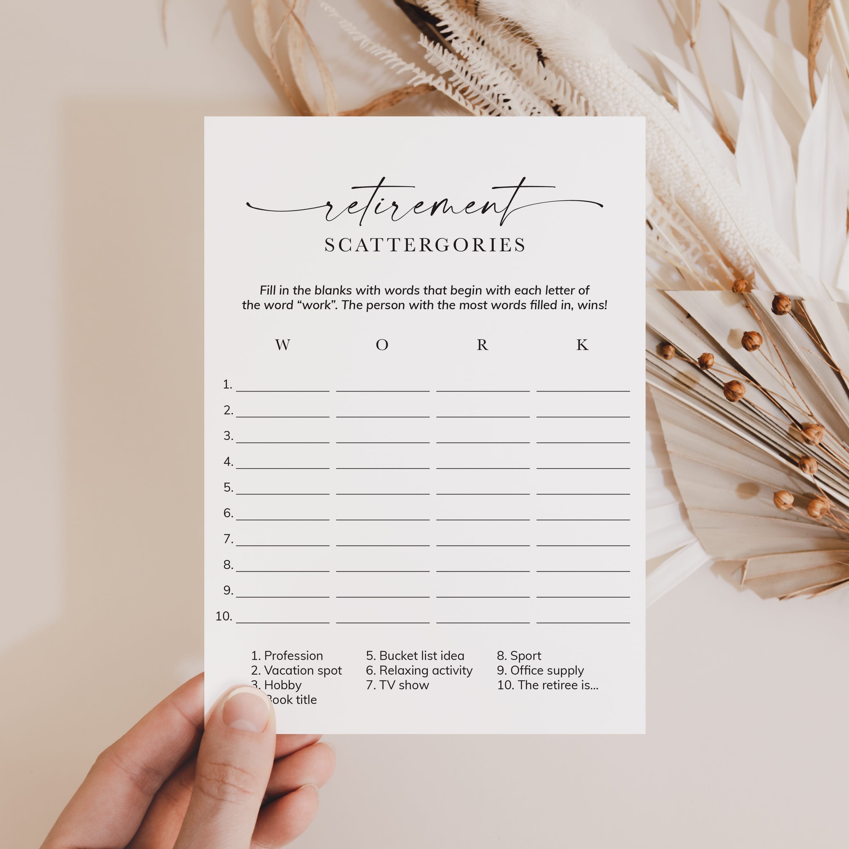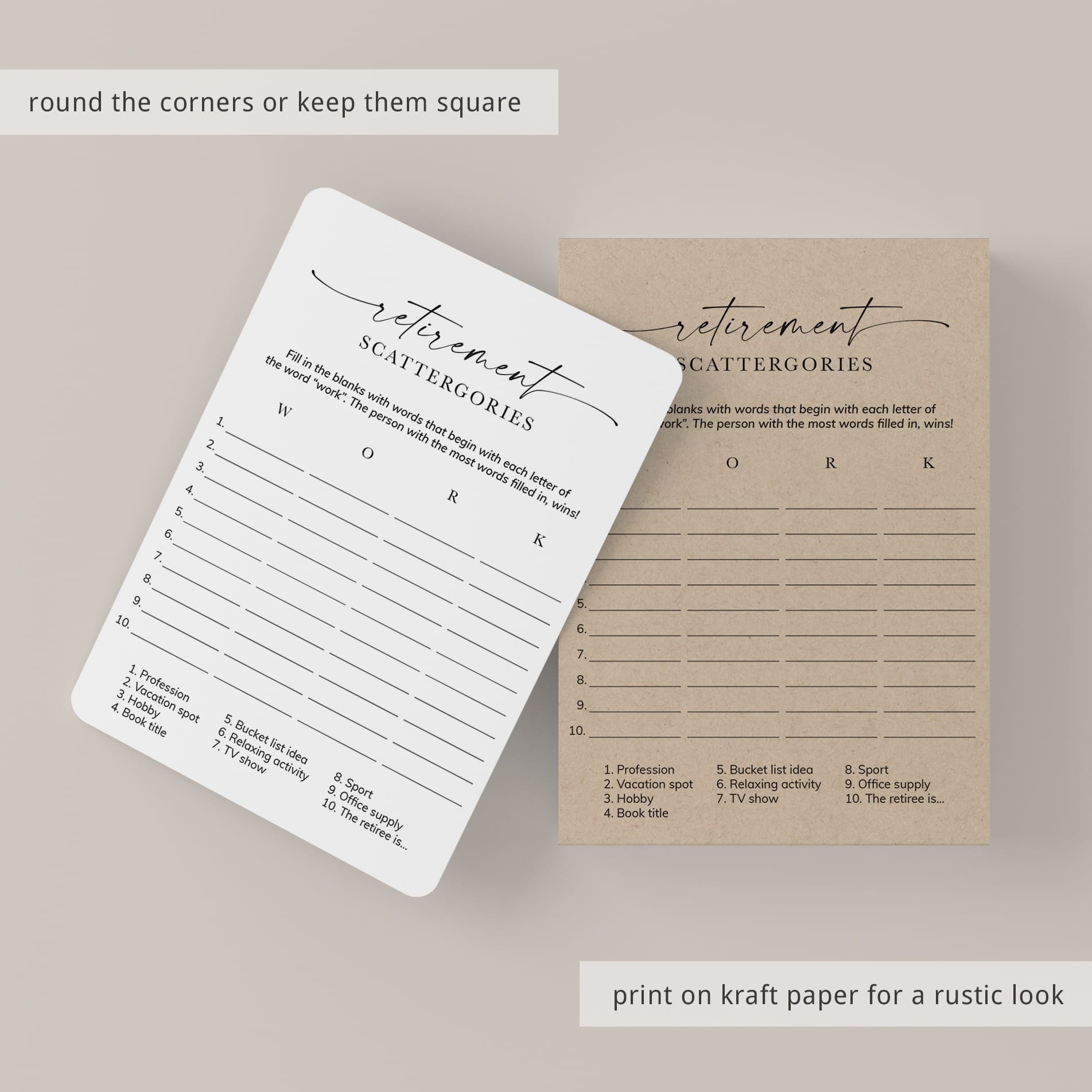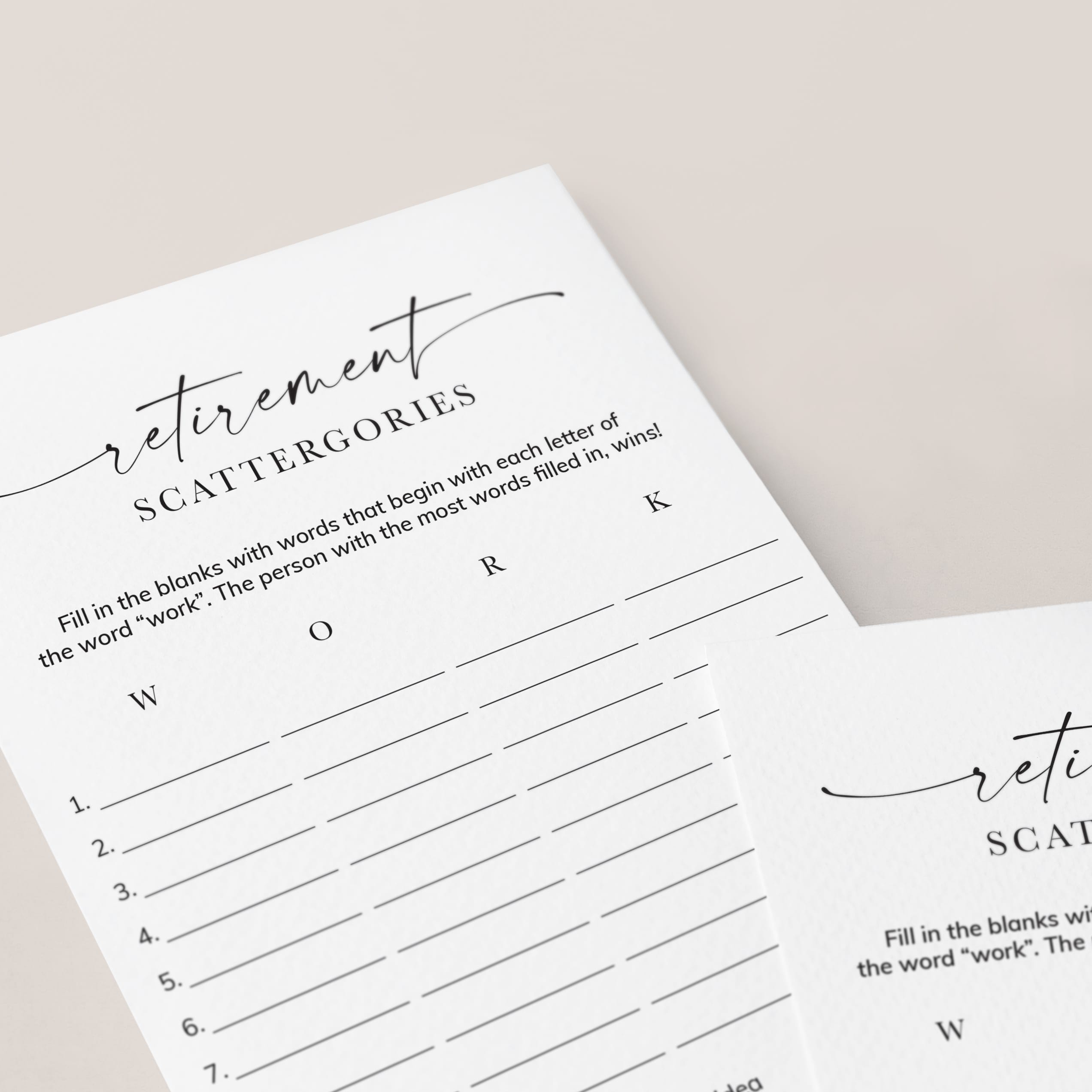 How many words can you fill in with the letters "W", "O", "R" and "K"? Play Scattergories at your retirement party with these printable game cards with stylish script font and a clean black and white design to ensure lots of fun and laughter. It's a great game for all ages and the minimalist game cards suit any retirement party theme.