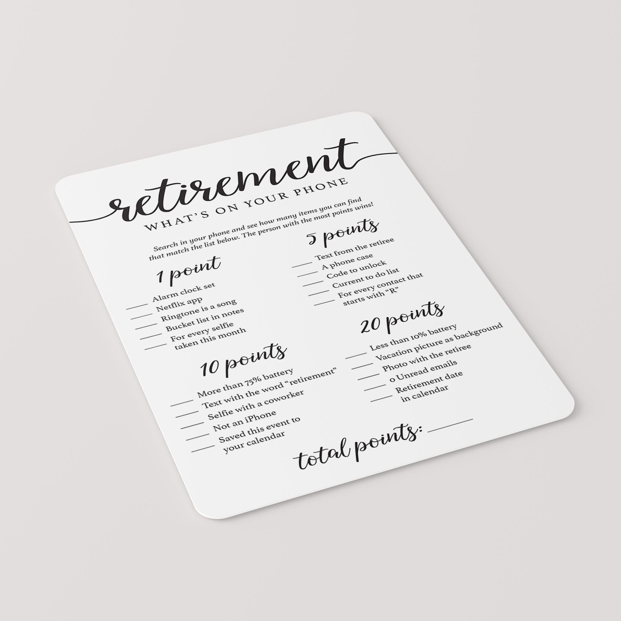 Guests simply look through their phones to see which of the listed items they have, like a to do list, selfie with a coworker, or photo with the retiree and tally up their points.