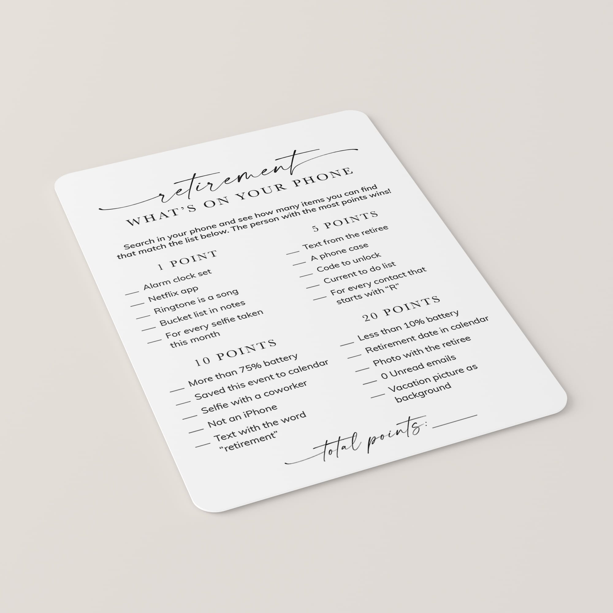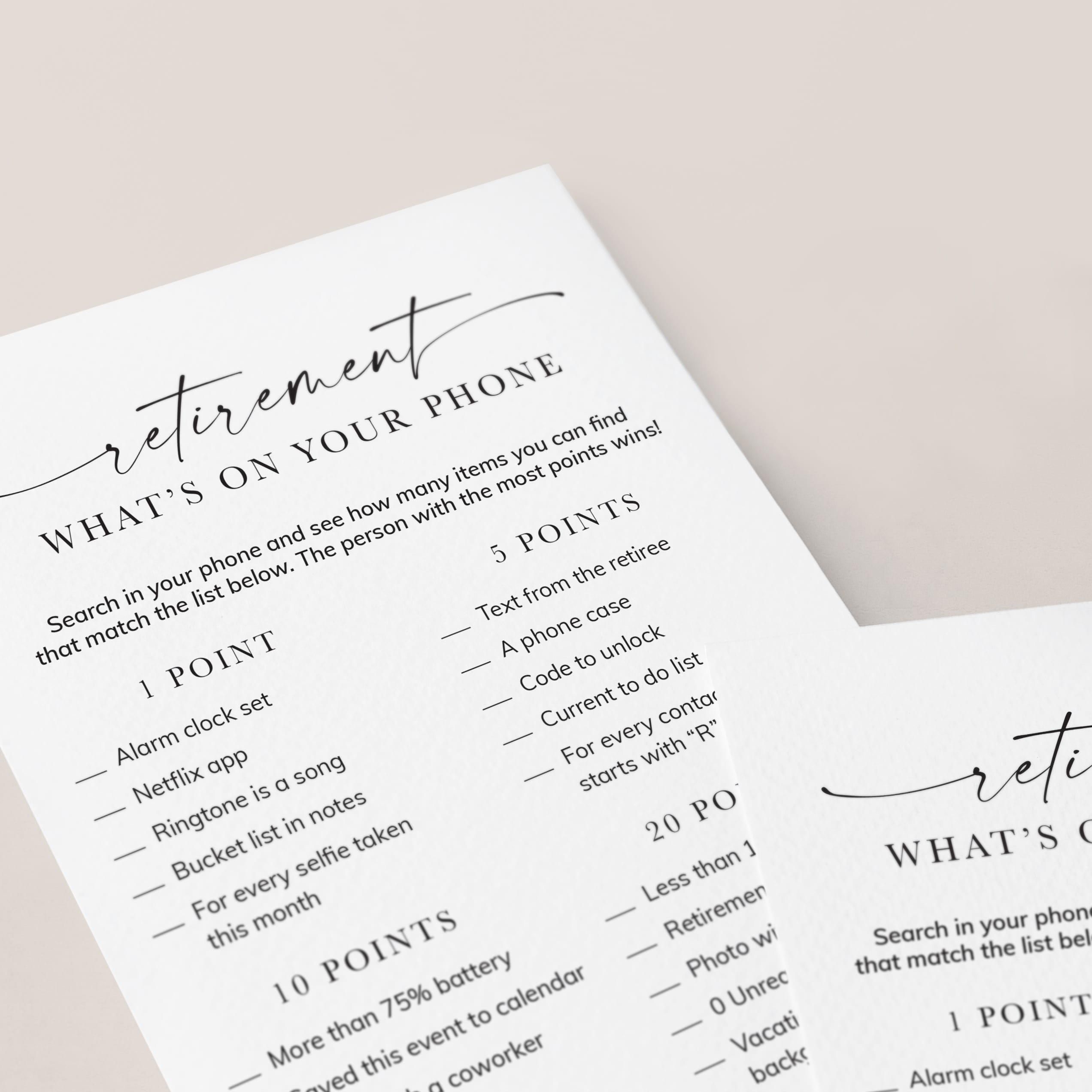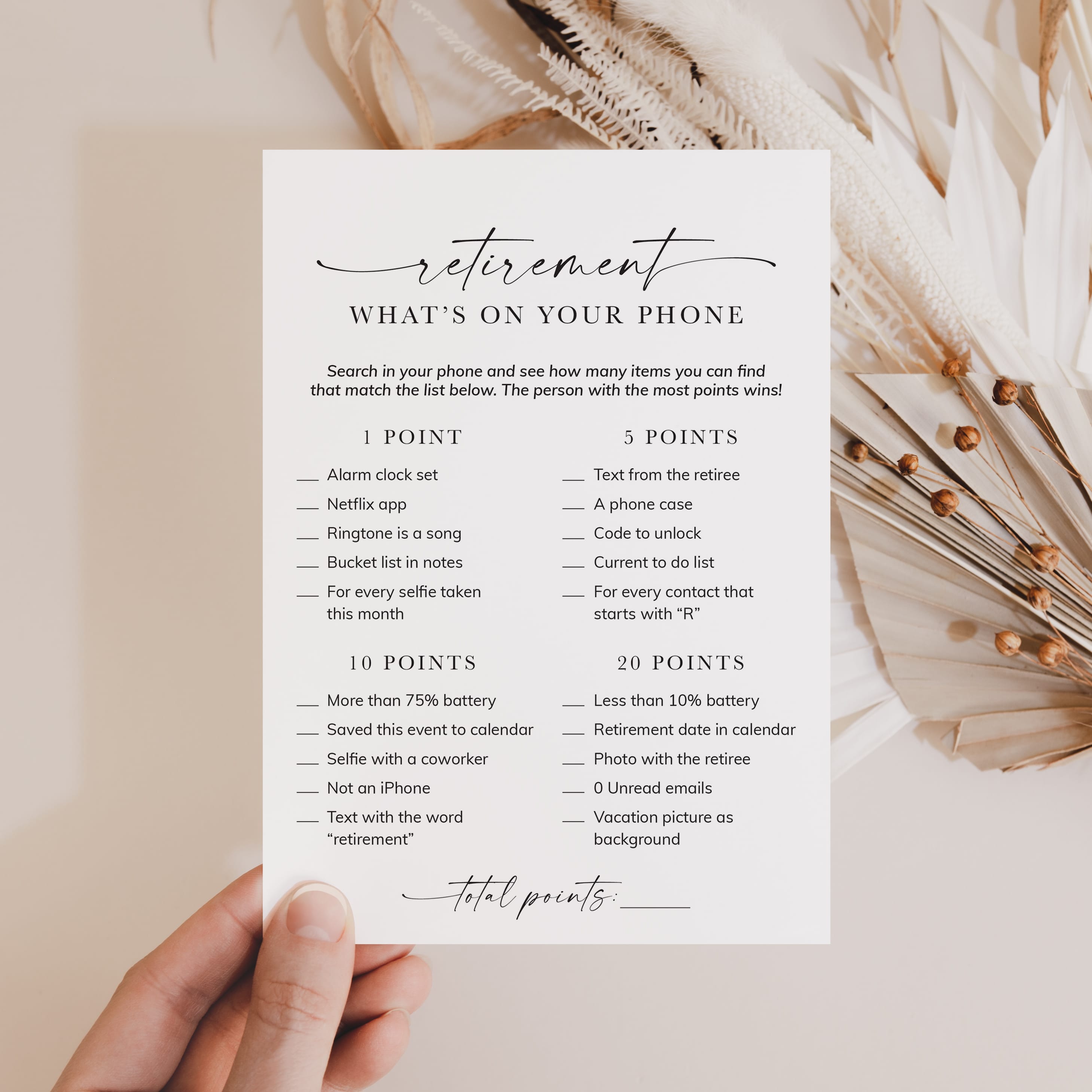 Most guests arrive at a retirement party with little more than their phone and a gift in hand. Sound familiar? Then this clean What’s On Your Phone retirement party game with stylish script font is the perfect icebreaker! A modern take on the classic What’s In Your Purse, this activity is both fun and easy to play.
