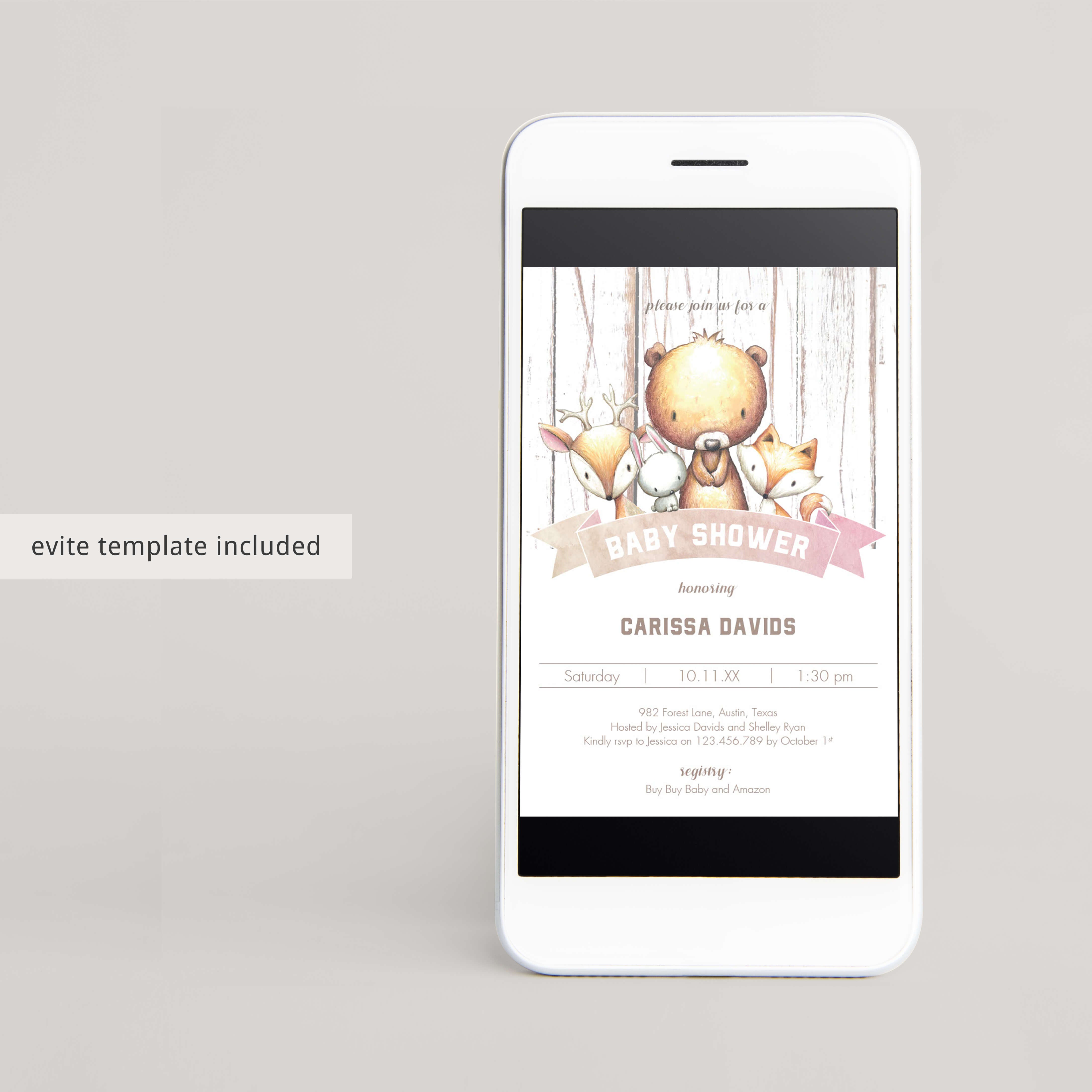 Are you hosting a forest or woodland themed baby shower? Amaze your baby shower guests with this adorable forest animals baby shower invitation with watercolor fox, bear, deer and bunny. The woodland baby shower invitation is perfect to celebrate the parents-to-be and their new baby on the way!