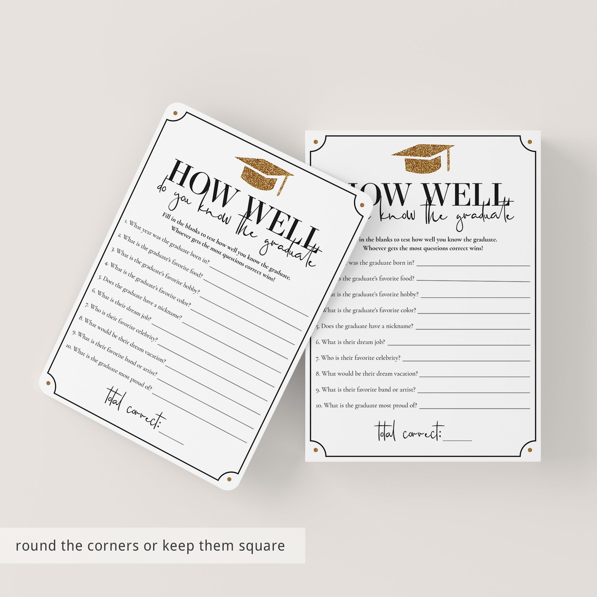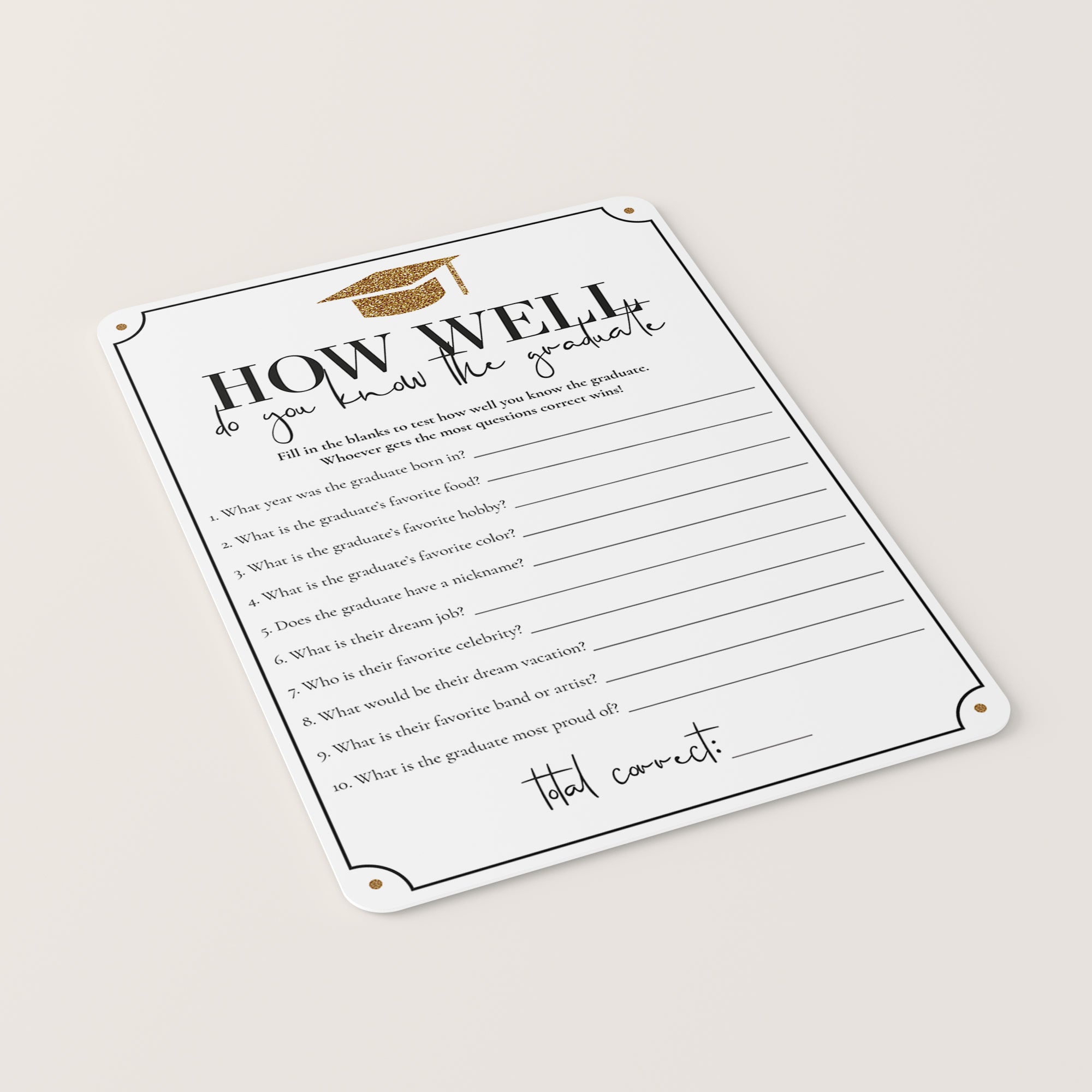 Test your graduation party guests how well they know the graduate and play 'How well do you know the graduate’ with this gold glittering graduation game card. This graduation quiz is a great way to bring disparate people together and to put them all in a party mood. It's the perfect addition to your grad party.