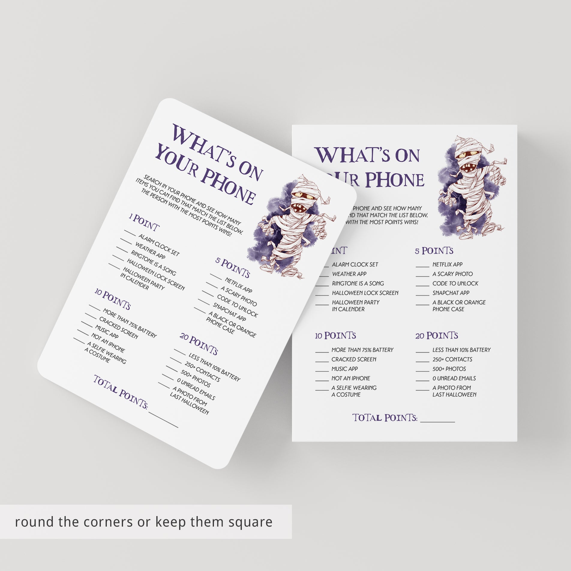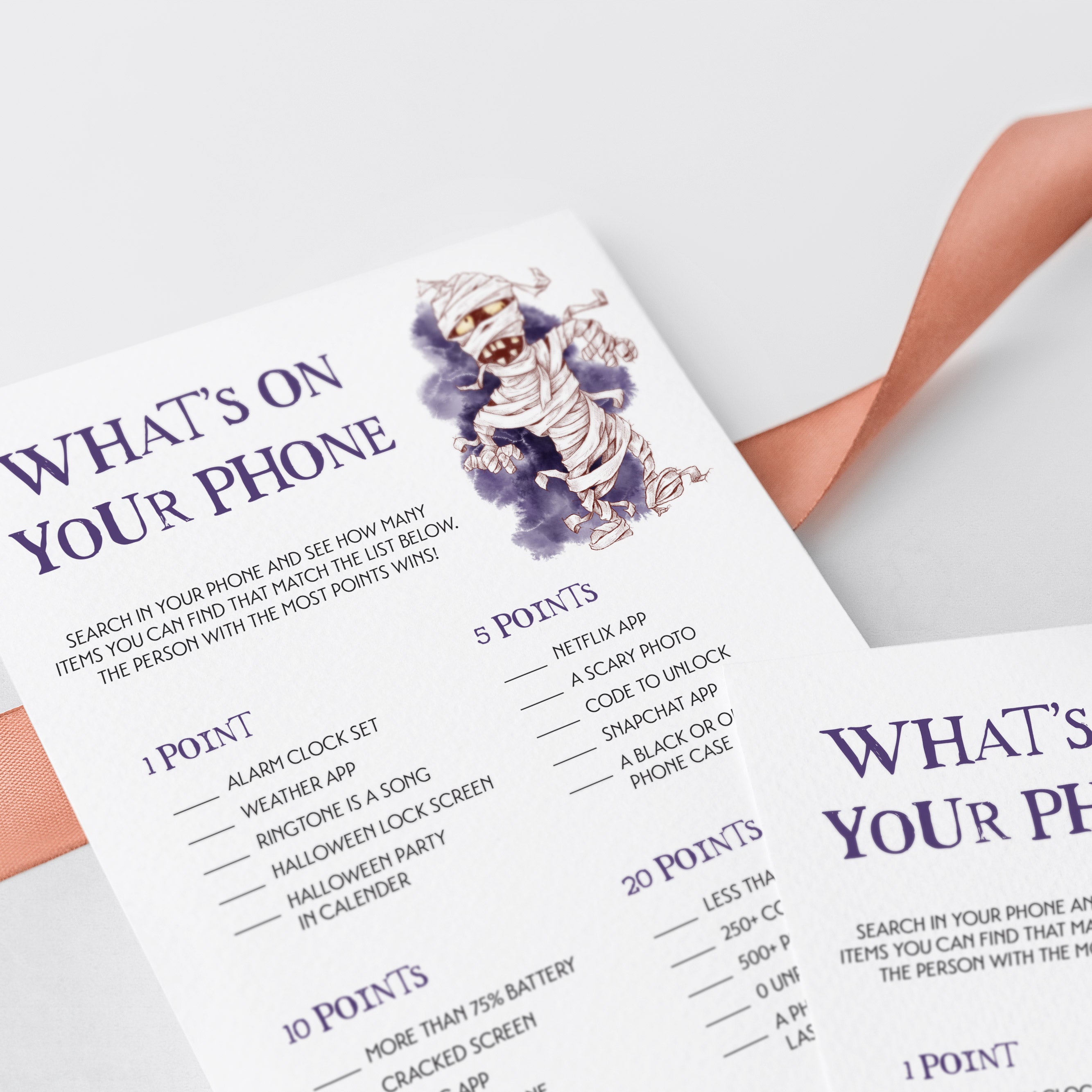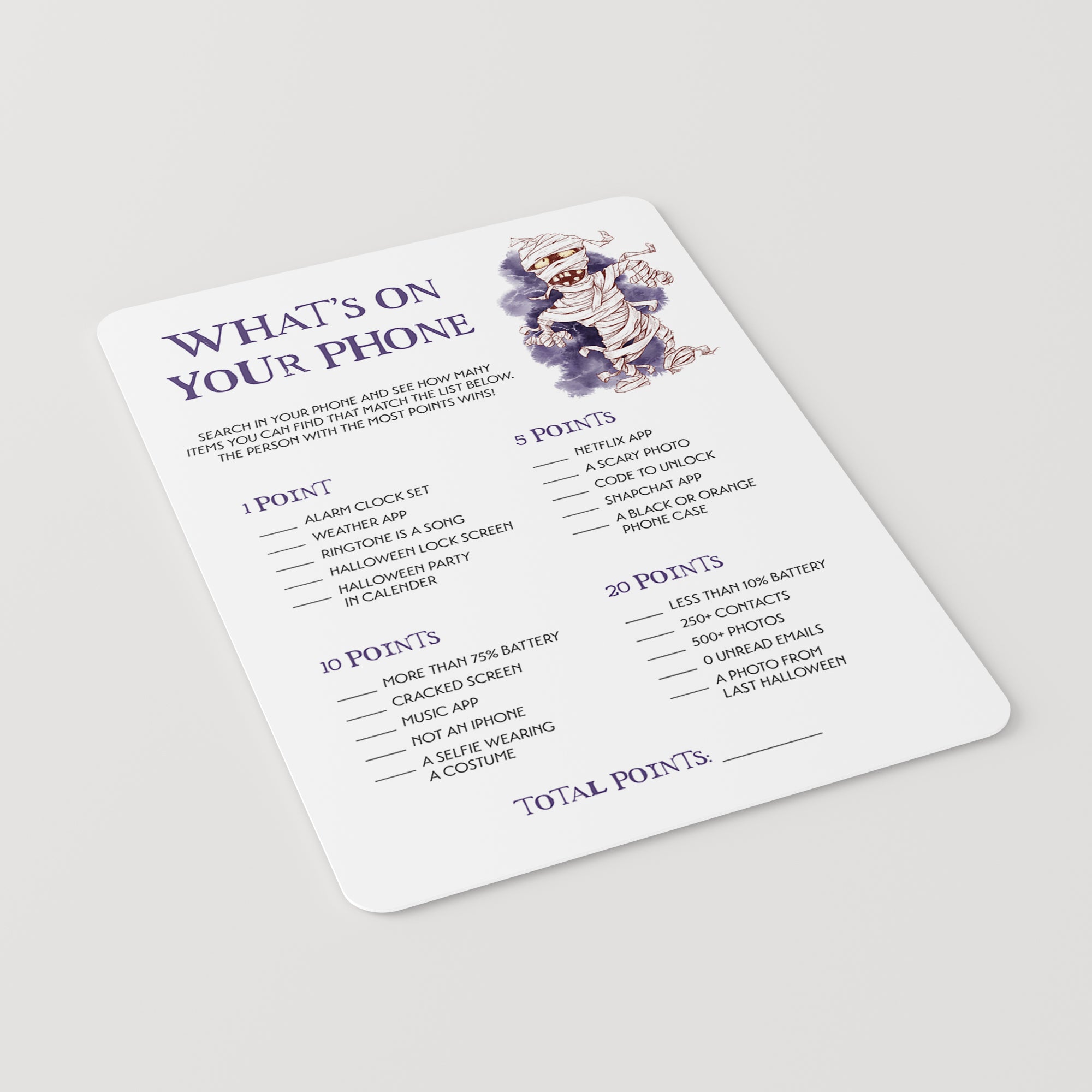 What’s On Your Phone is similar to the What’s In Your Purse game, but instead of searching for the items physically, your guests will just search for the listed items using their phone. They earn points for each item that they have in their phone. Things like having a black or orange phone case, the Halloween party saved in their calender, a scary photo and much more. The person with the most points, wins!