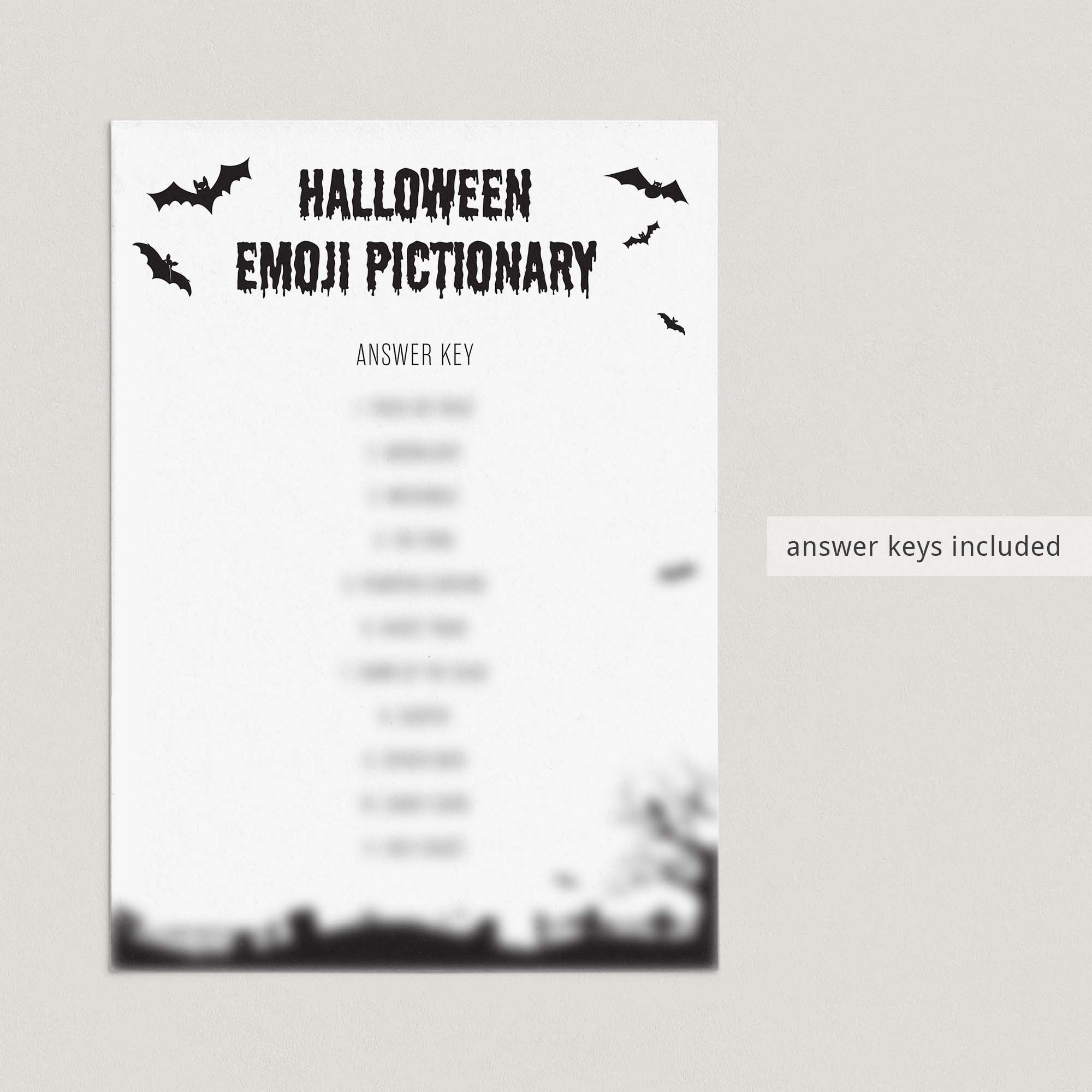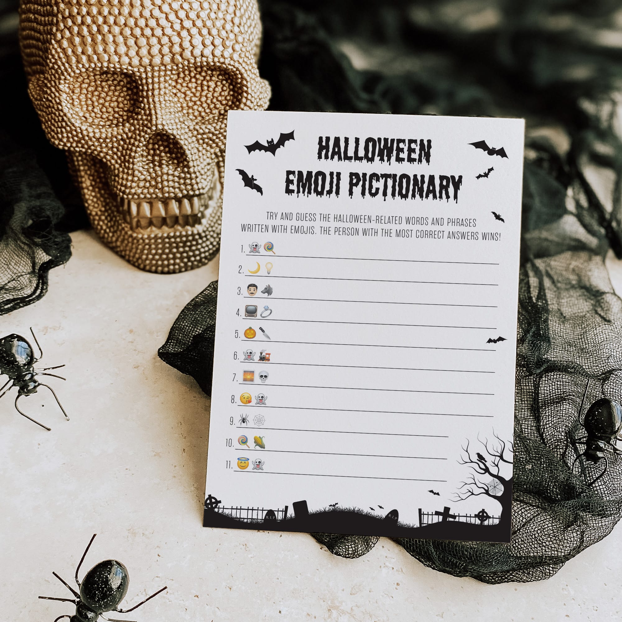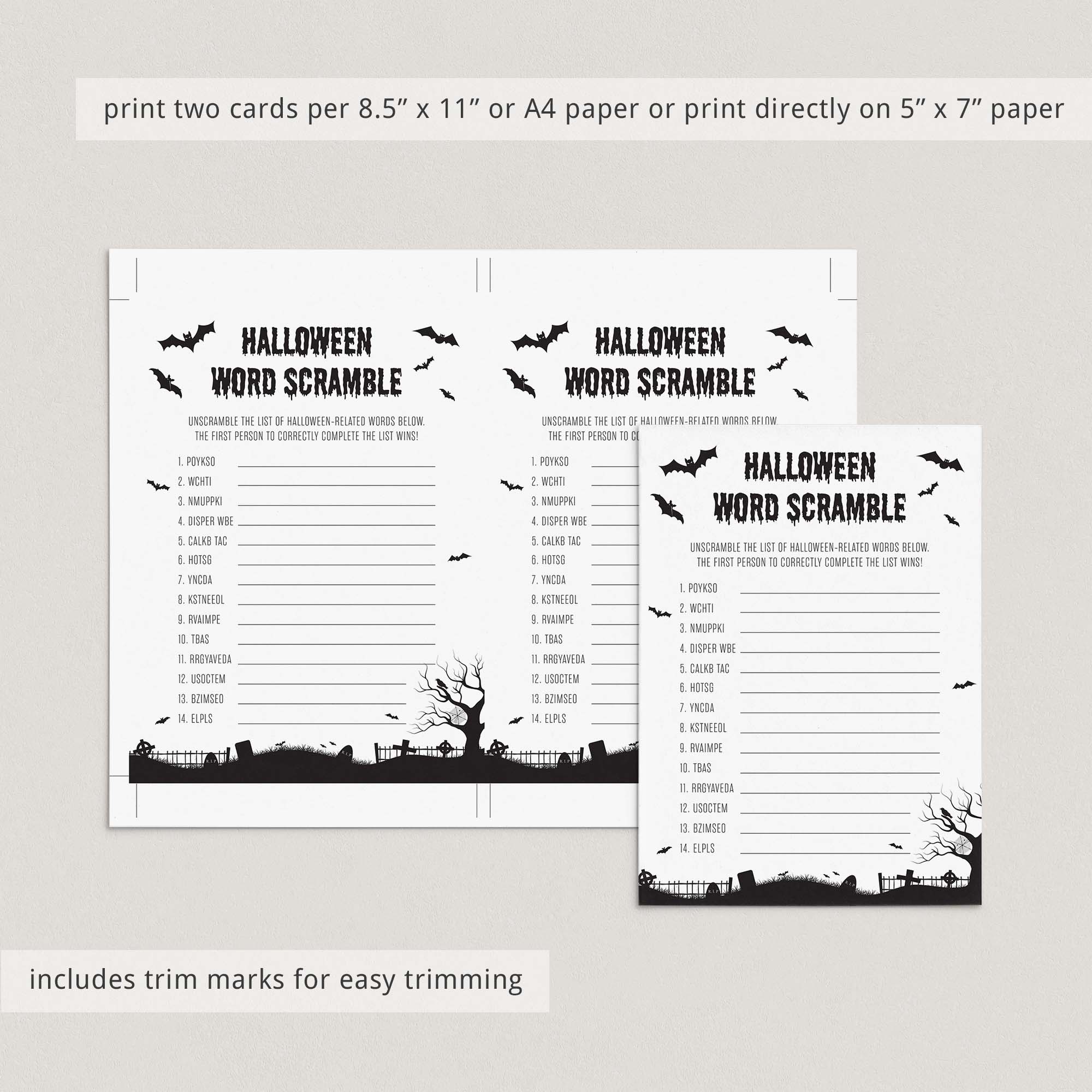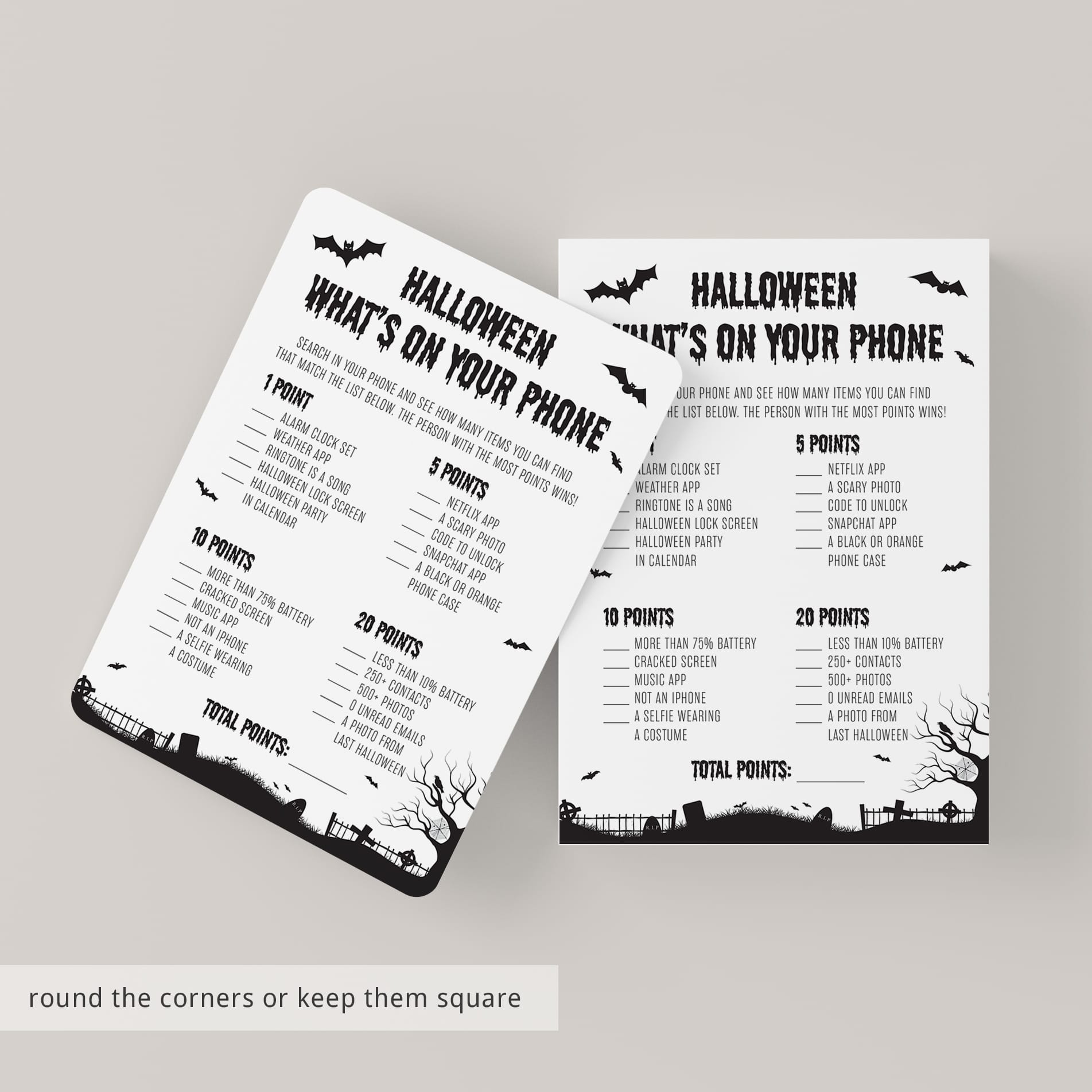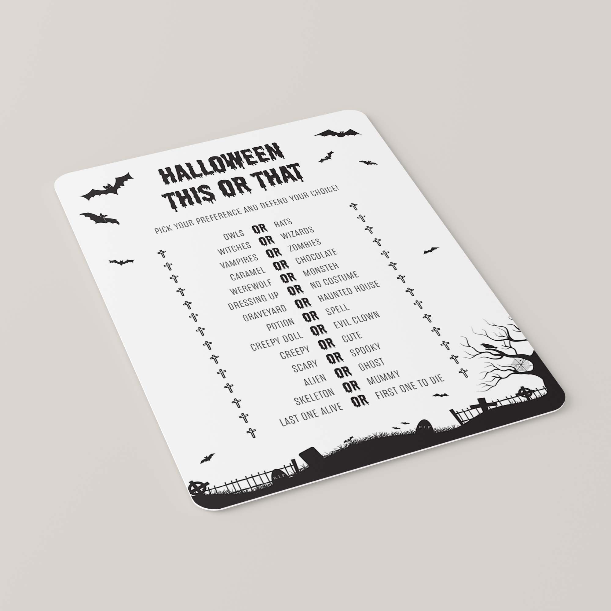 This black and white Halloween Party games pack with graveyard and bats includes the following 4 creepy games: