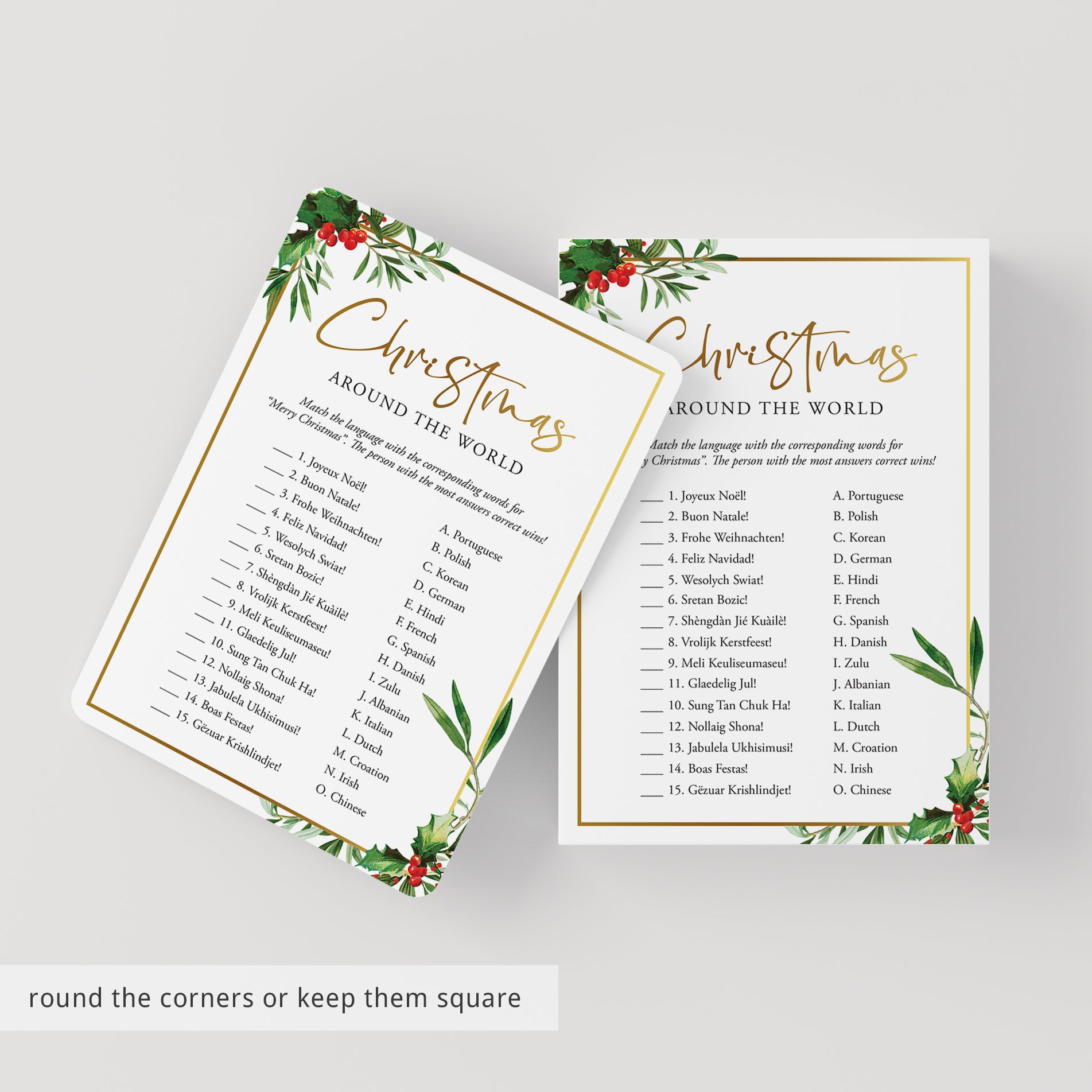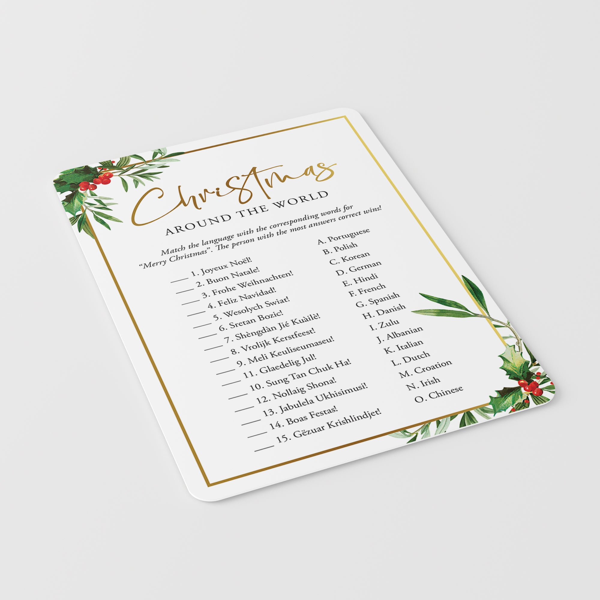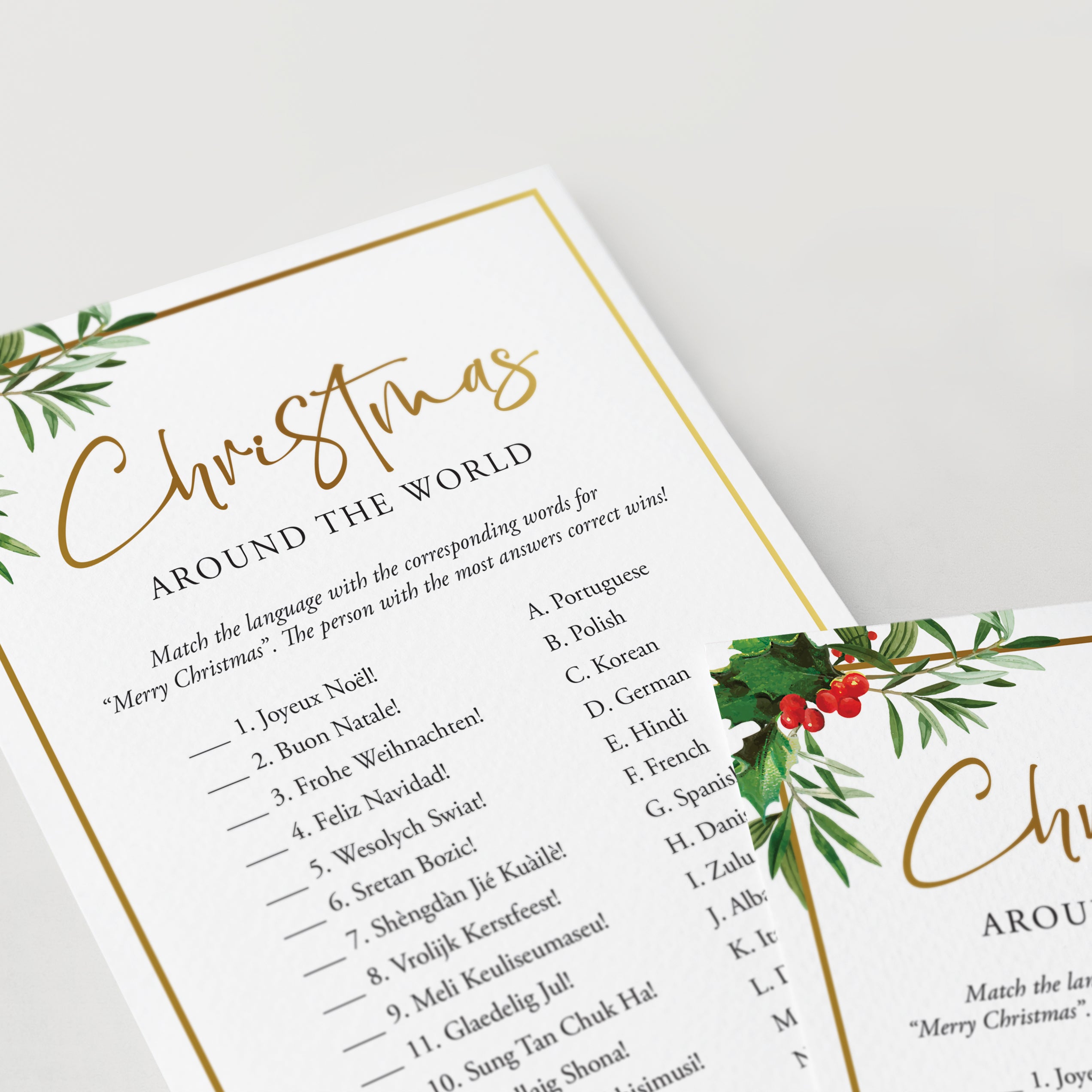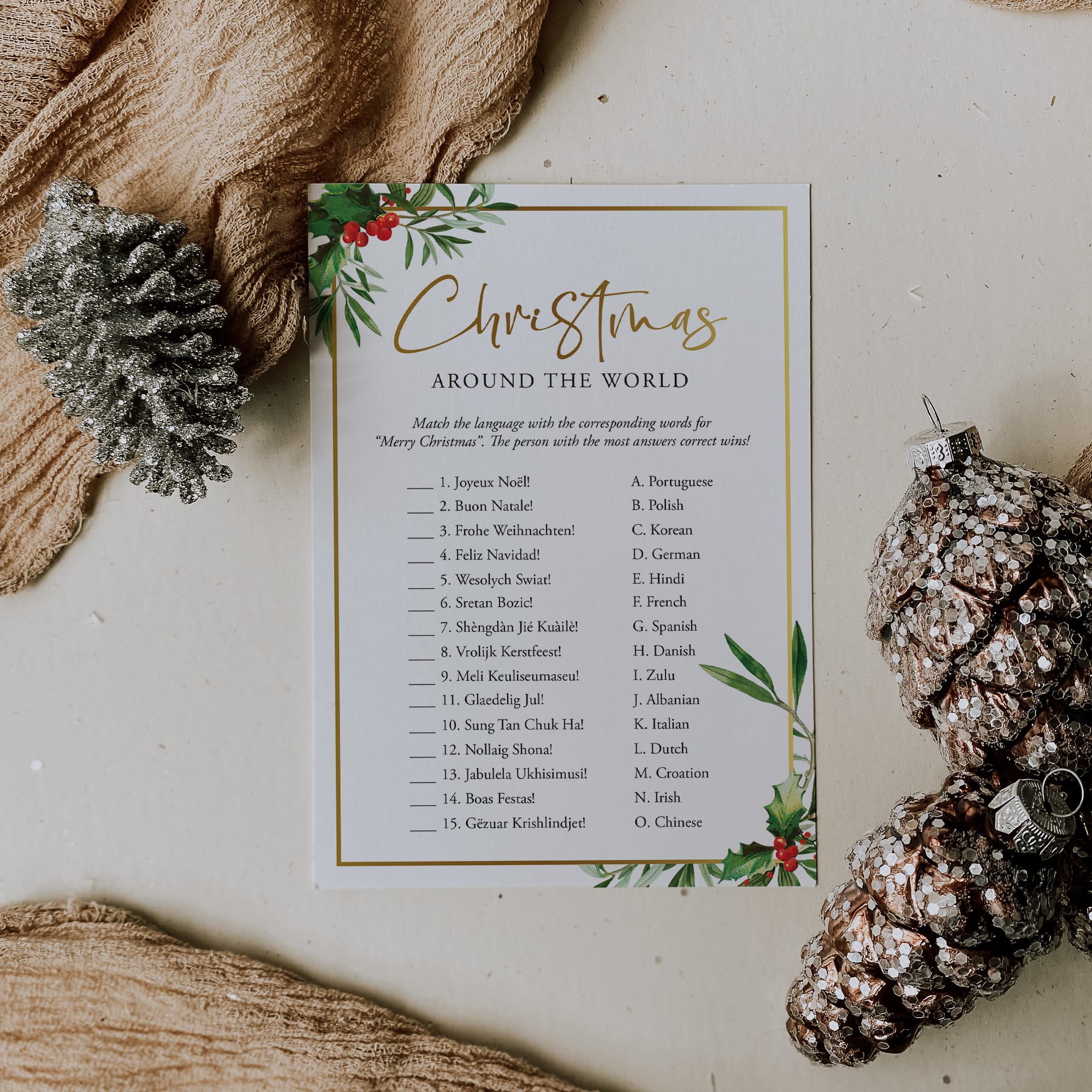 Are you hosting an Around The World Christmas party? Use this chic gold and greenery Christmas game to find out how much you know about different languages and how they say Merry Christmas around the world!