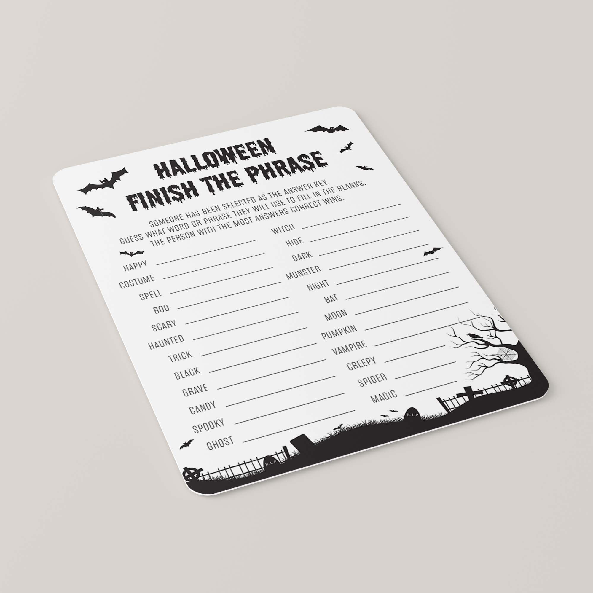 Finish The Phrase is a great ice breaker game for your Halloween party. It is a fun activity for family nights, Halloween parties and for older kids at school and very easy to play. This Halloween party game with black graveyard and bats is the perfect addition to a classy black and white Halloween bash.