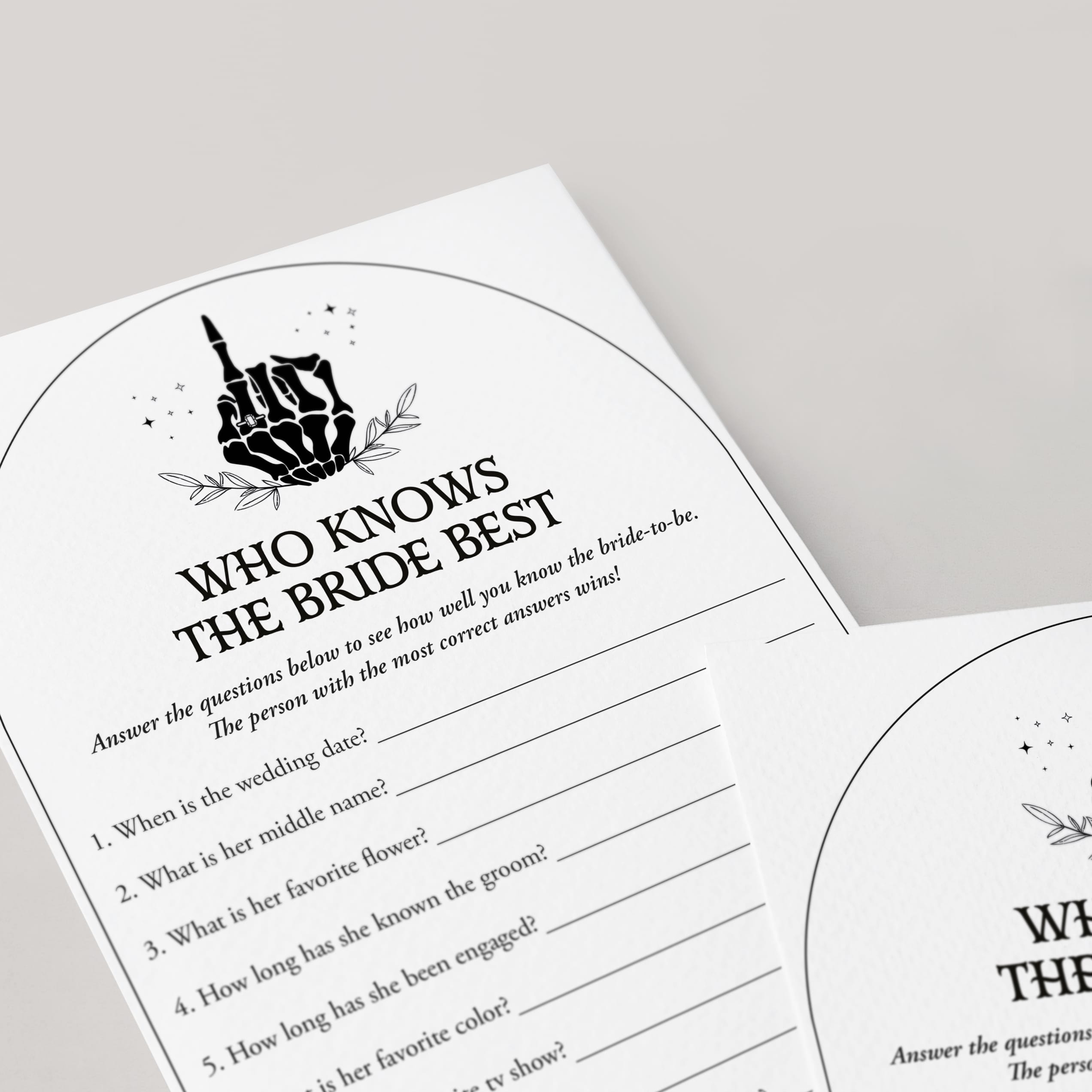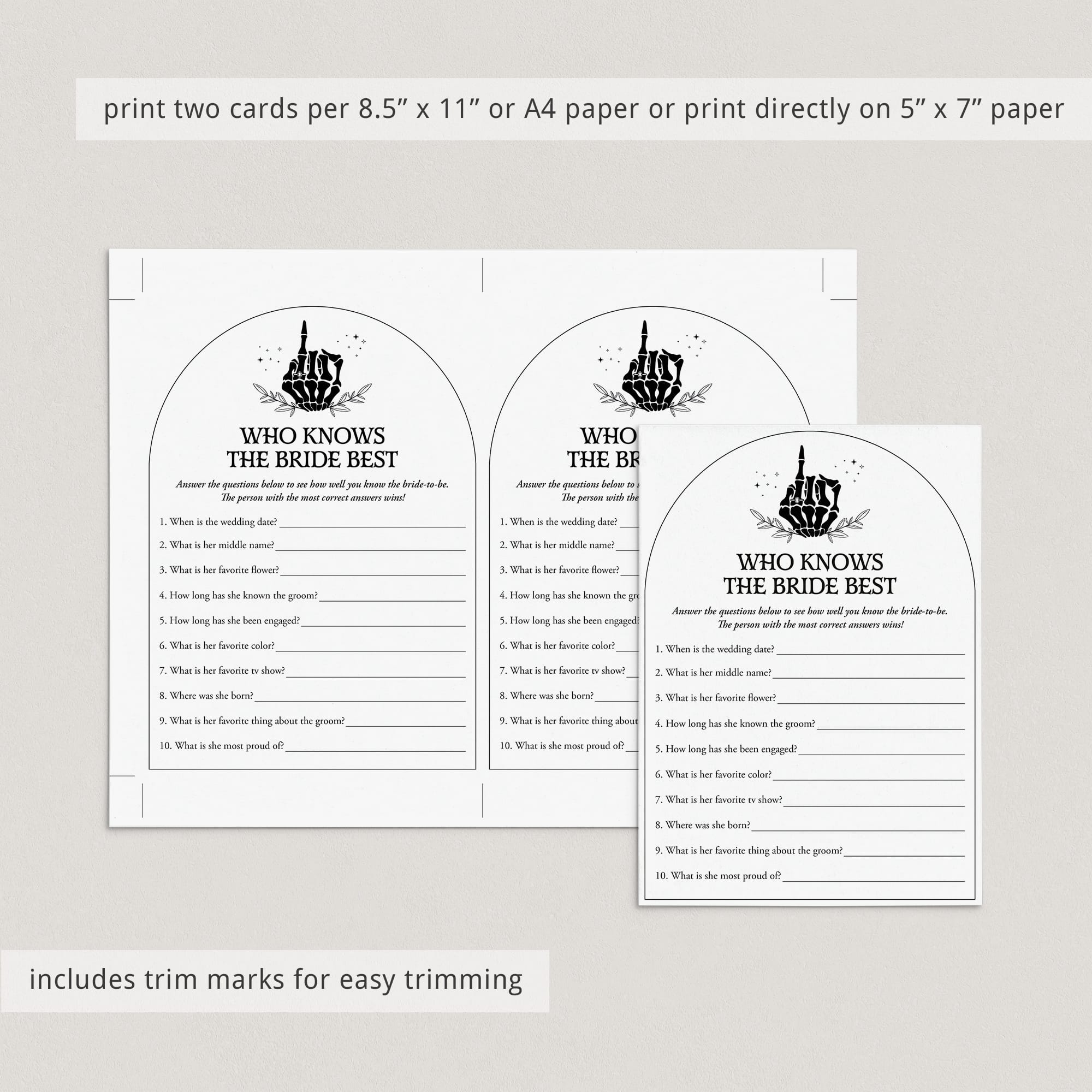 Test your bridal shower guests how good they know the bride to be and play ‘Who knows the bride best’ with these Bride or Die theme bridal shower game cards. A 'Who Knows The Bride Best' game is a great way to bring disparate people together and to put them all in a party mood. This game is the perfect addition to a Till Death Do Us Party bridal shower or Halloween wedding party.