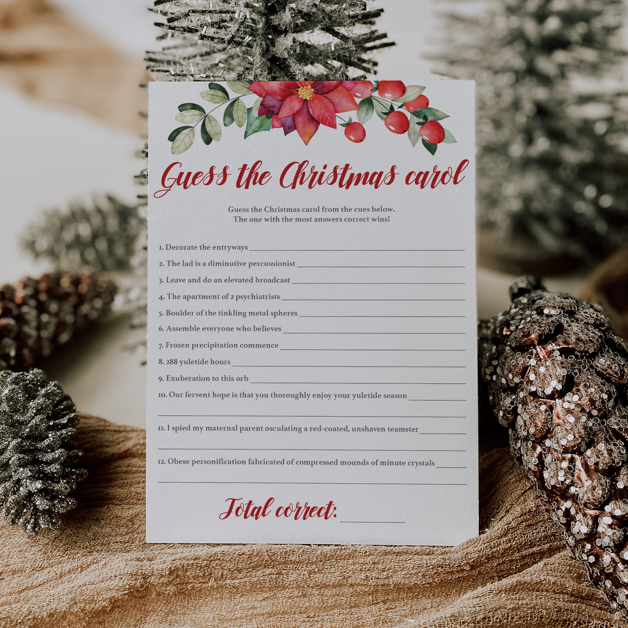This Christmas Carol guessing game is an instant downloadable file that can be printed at the comfort of your home or ordered from a local or online print shop.