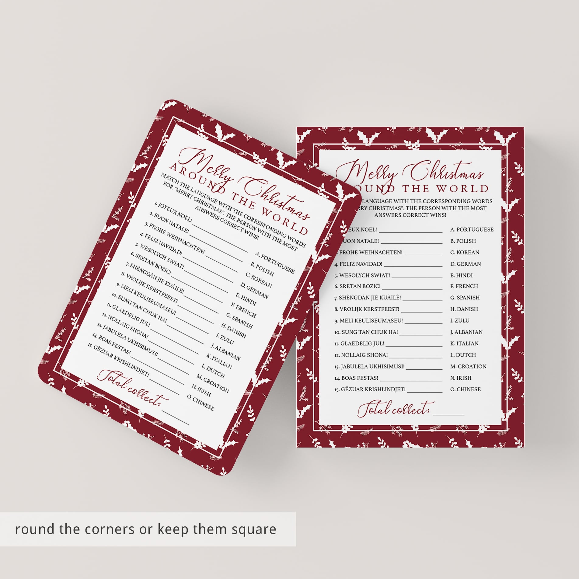 The Christmas games are instant downloadable files. The games can be printed at the comfort of your home or ordered from a local or online print shop. A detailed instruction guide, with tips & tricks on printing, trimming and paper choice is included.