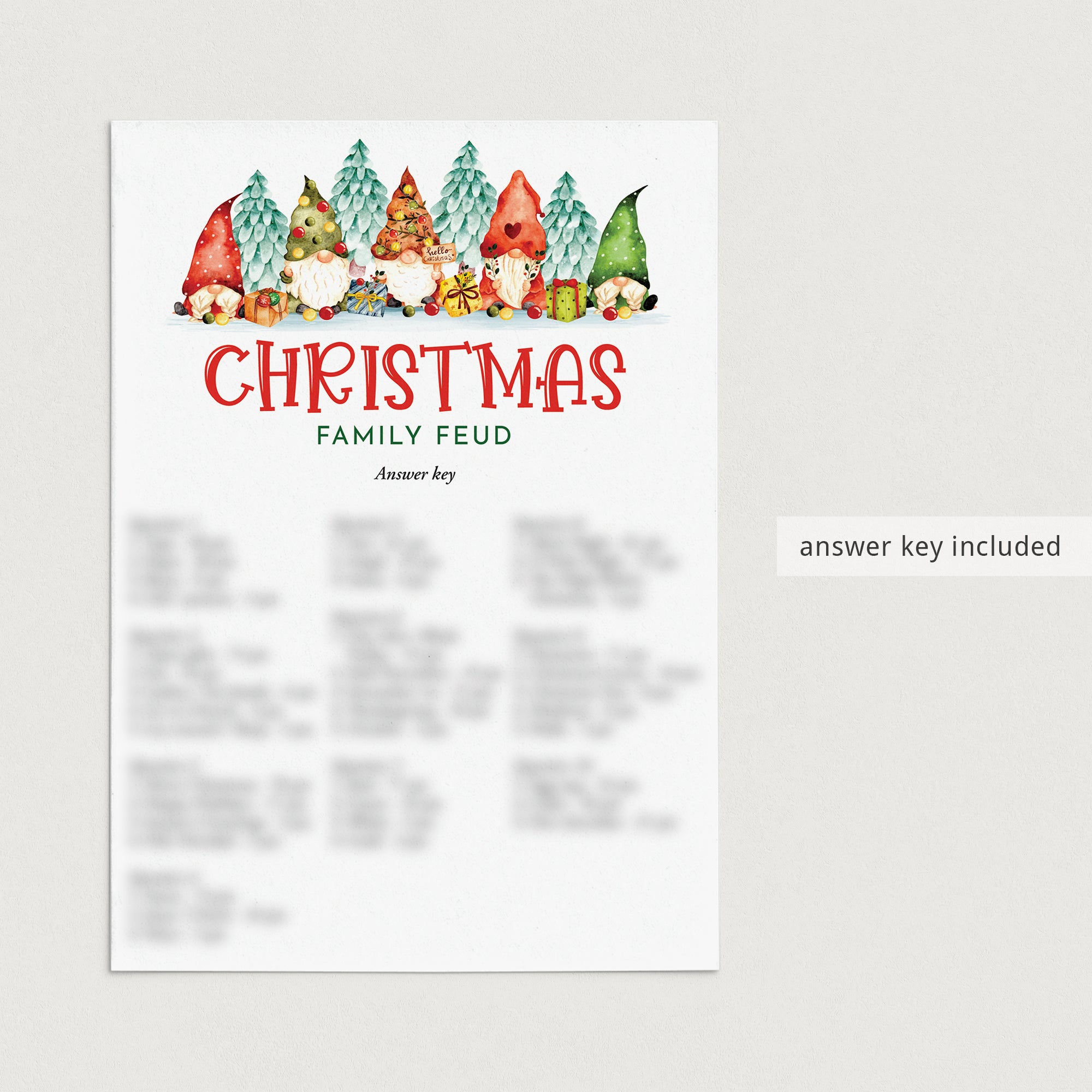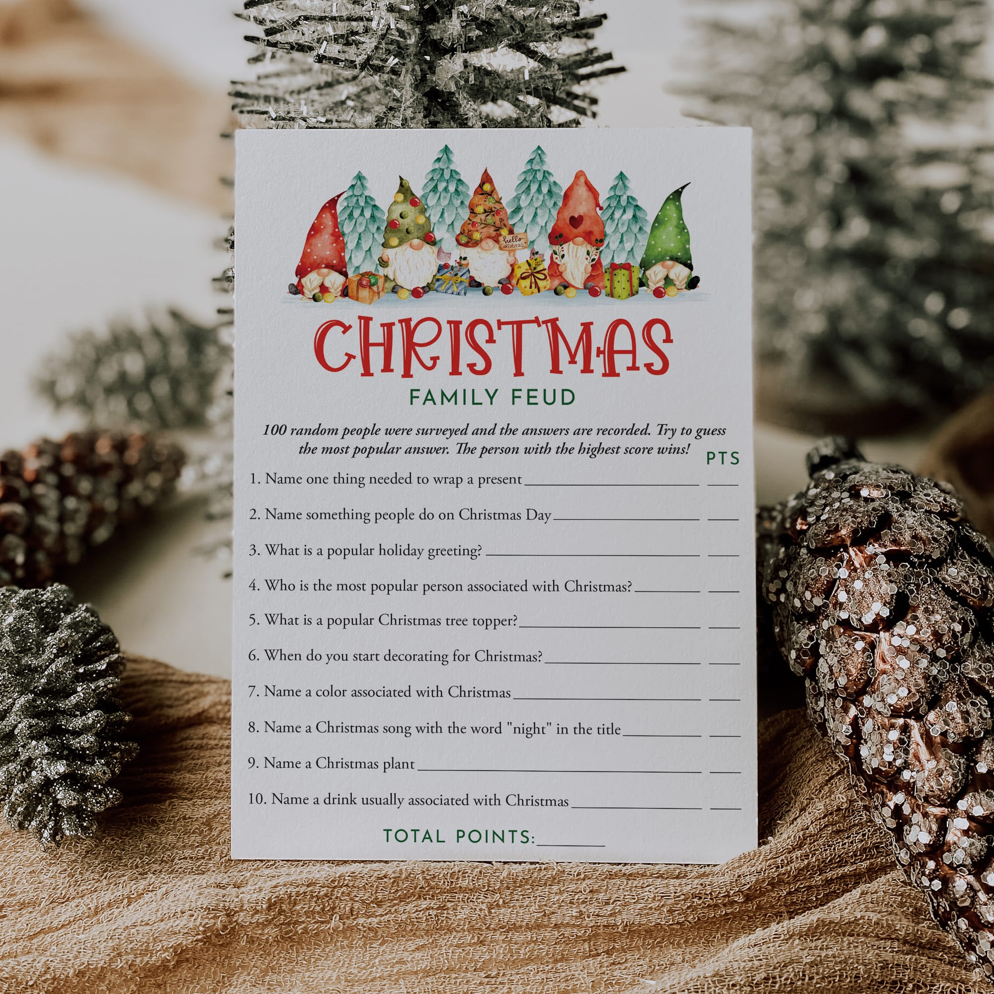 Are you looking for a fun game to play at your Christmas party? Play Christmas Family Feud with this fun game card with watercolor Christmas Gnomes.