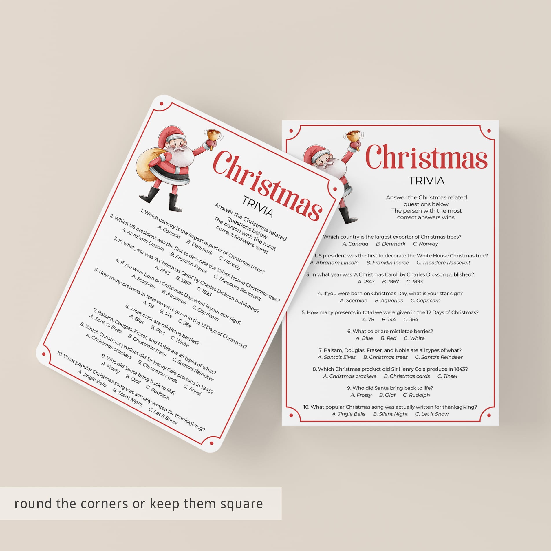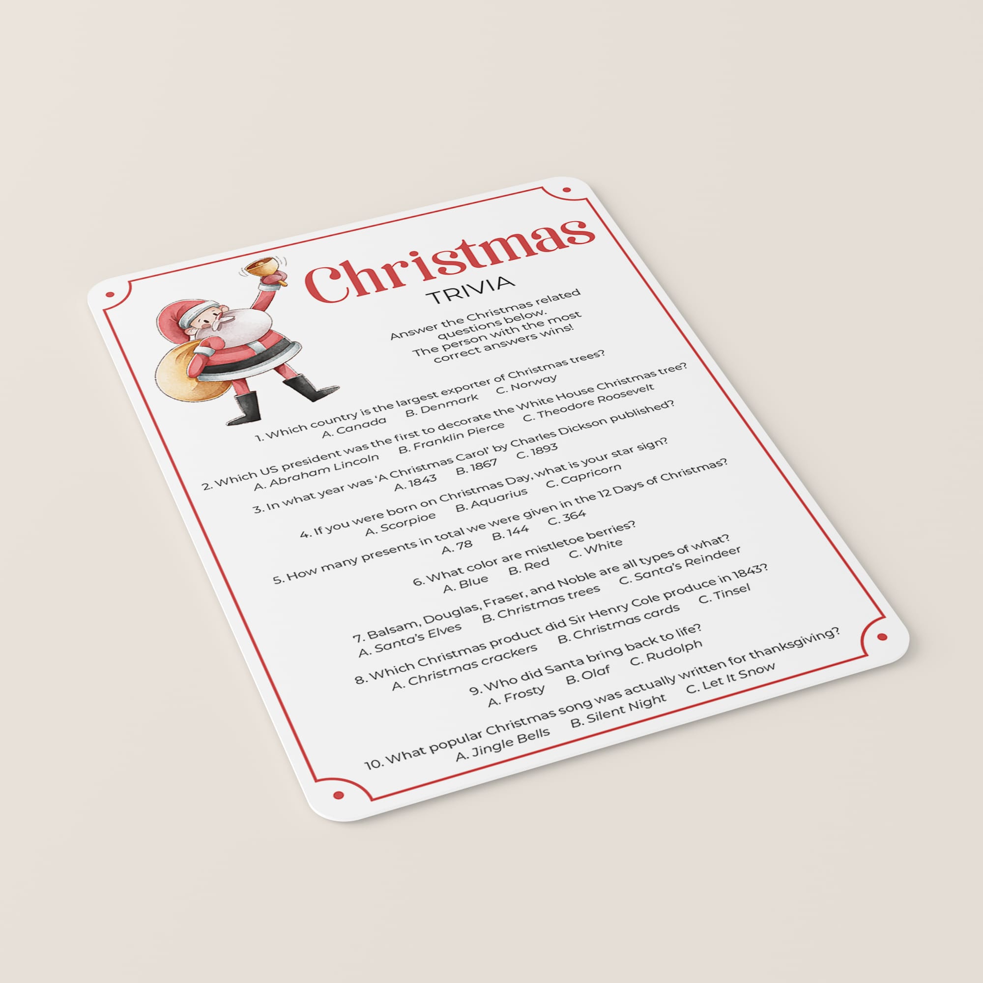 Are you hosting a Christmas party? Use this fun Christmas Multiple Choice Trivia with to test your guests Christmas knowledge. Which country is the largest exporter of Christmas trees? And what popular Christmas song was actually written for Thanksgiving? Play this Christmas trivia game to find out! It’s a great challenging game to play at your Christmas party.