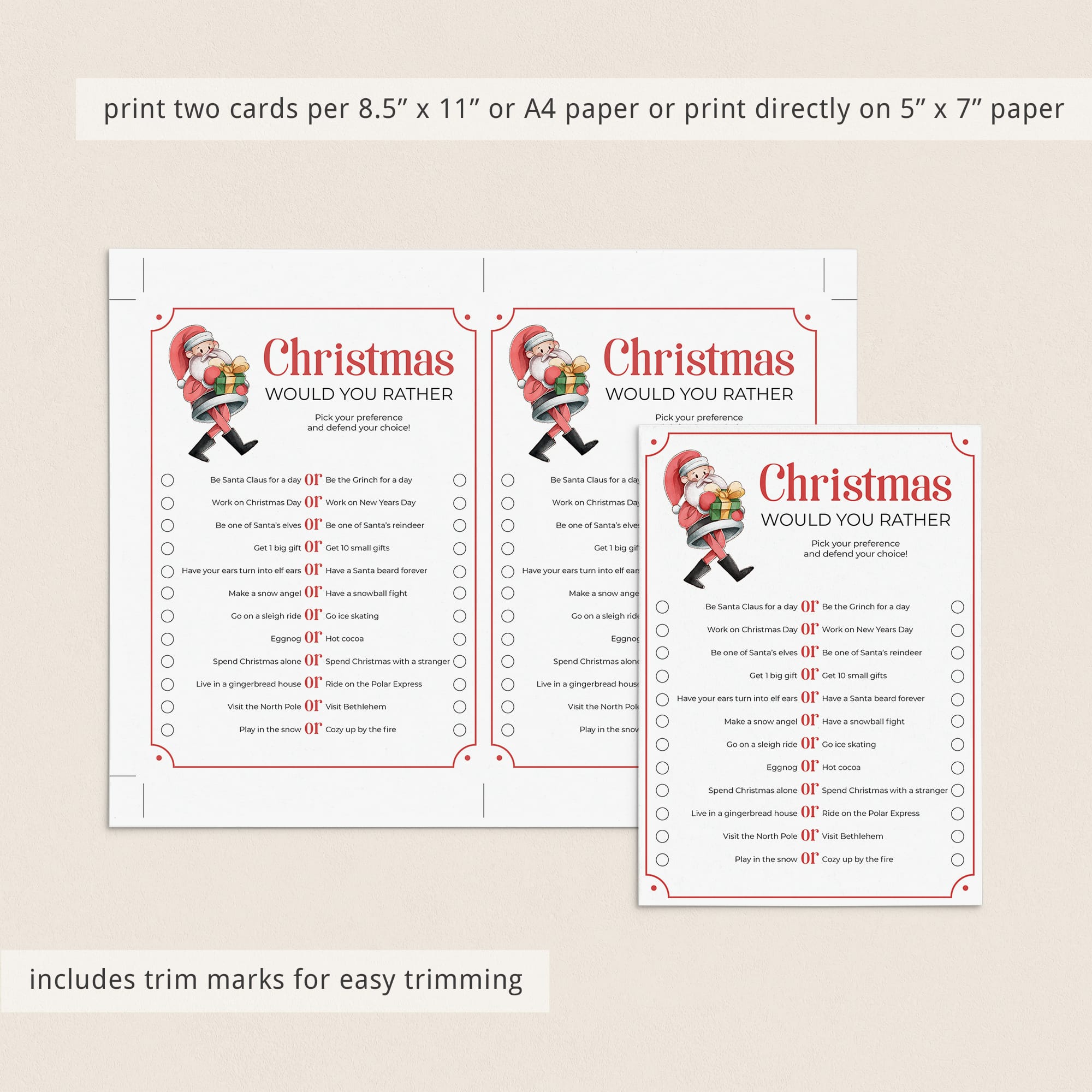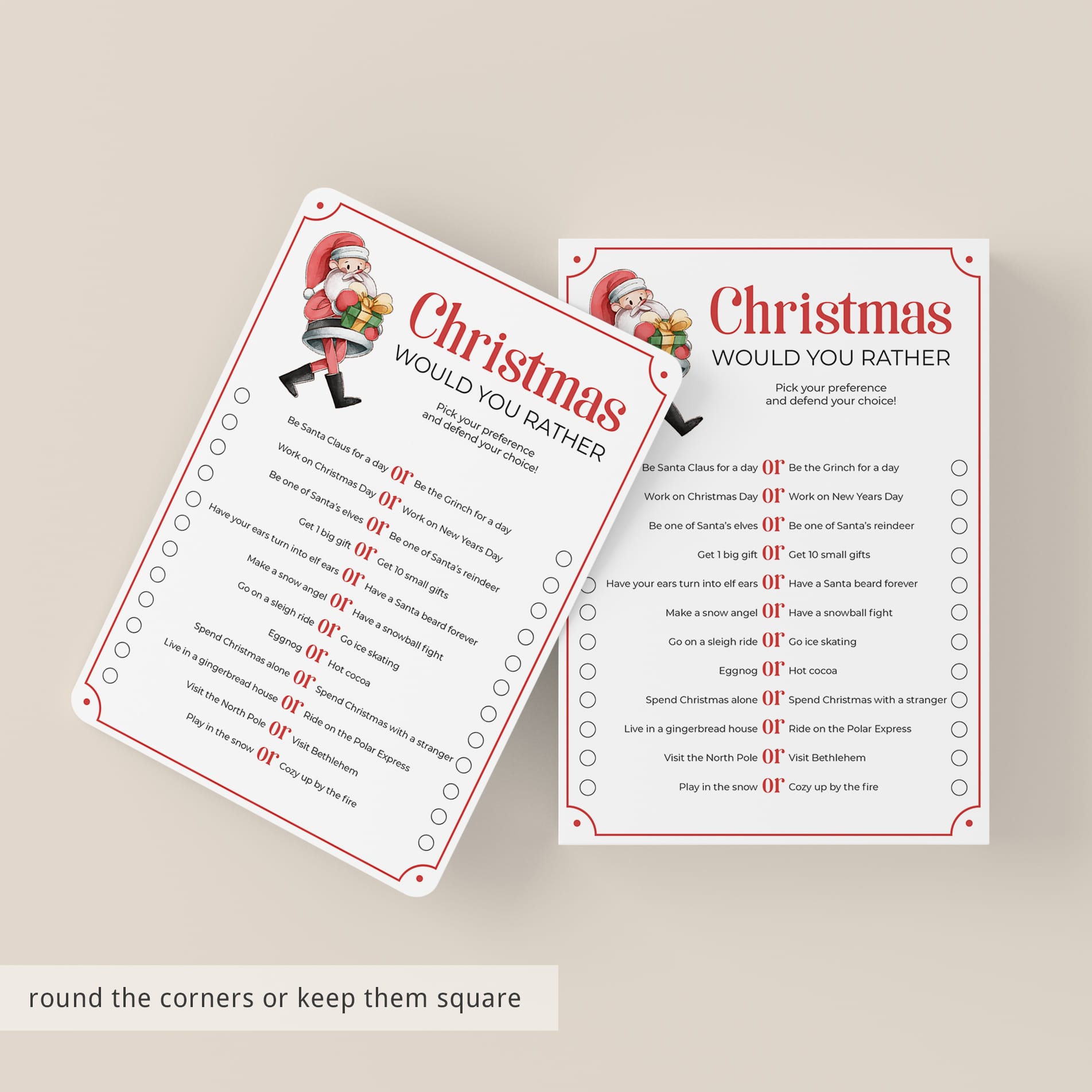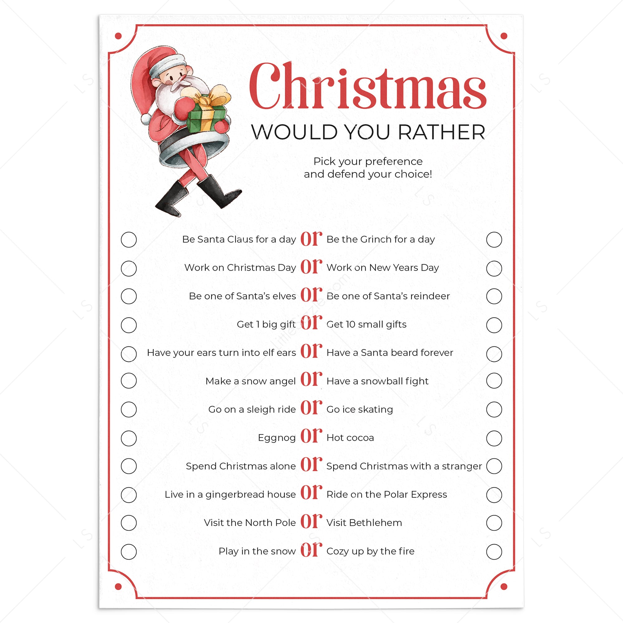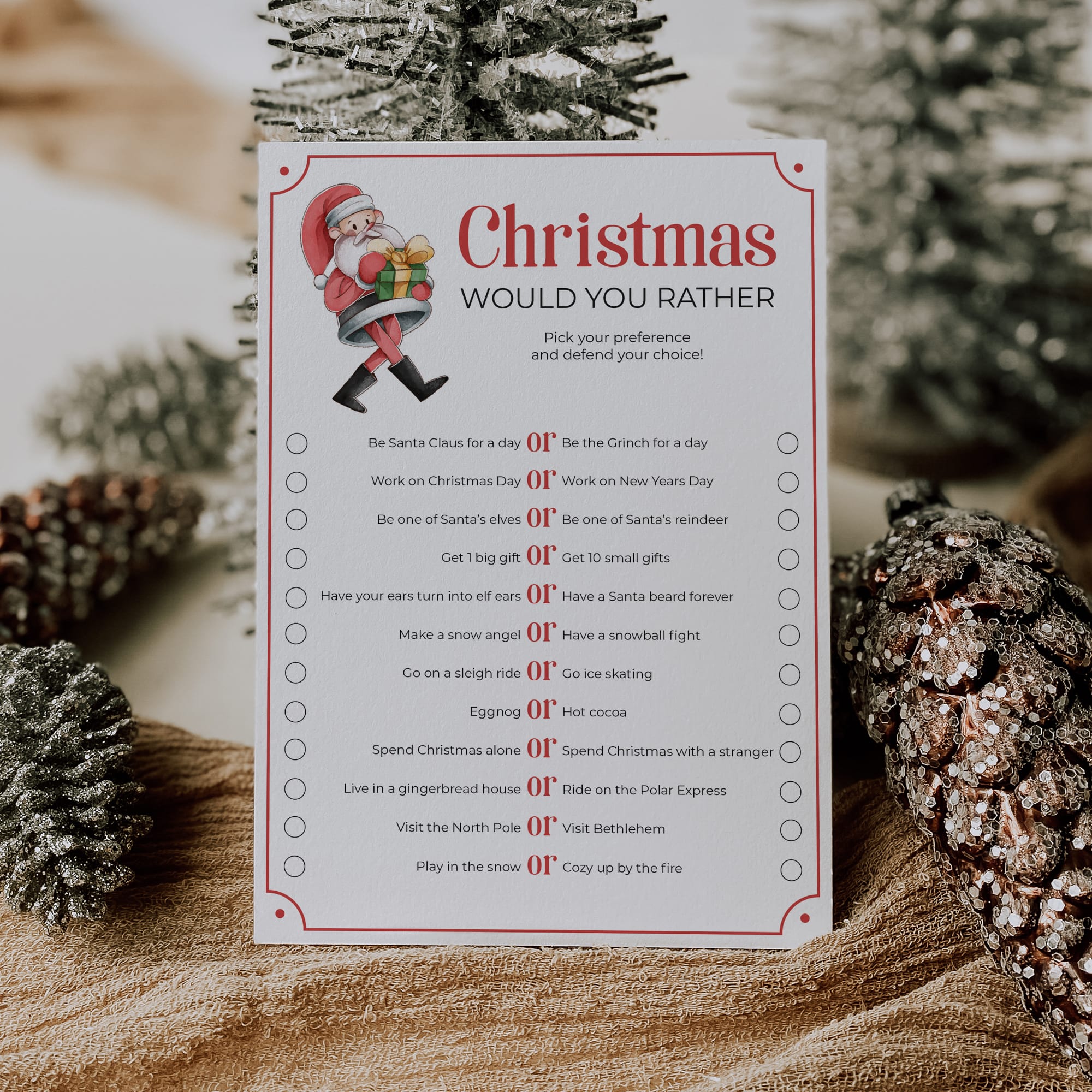 Are you looking for a fun icebreaker game for your Christmas party? Play Would You Rather. It's is a great conversation starter and will definitely get your guests mingling and laughing. This printable Christmas game has 12 Would You Rather questions. Have your guests pick their preferences and defend their choice.
