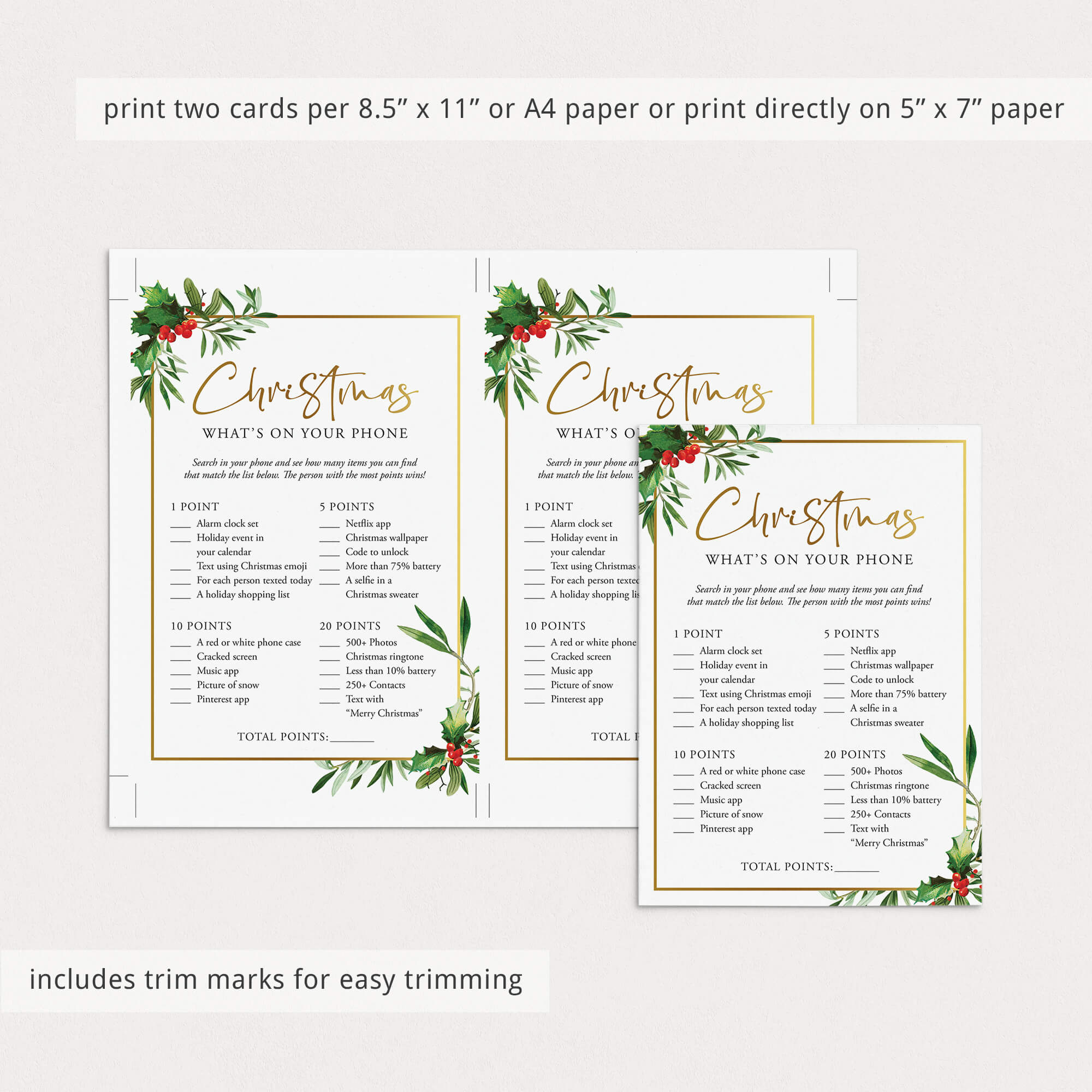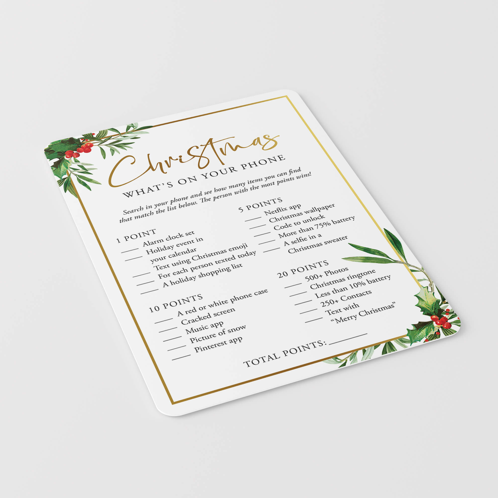 Are you looking for a fun icebreaker game for your Christmas party? Play What's On Your Phone with these elegant Greenery and Gold Christmas Phone Game Cards. The game is super easy to prepare for and simple to play.
