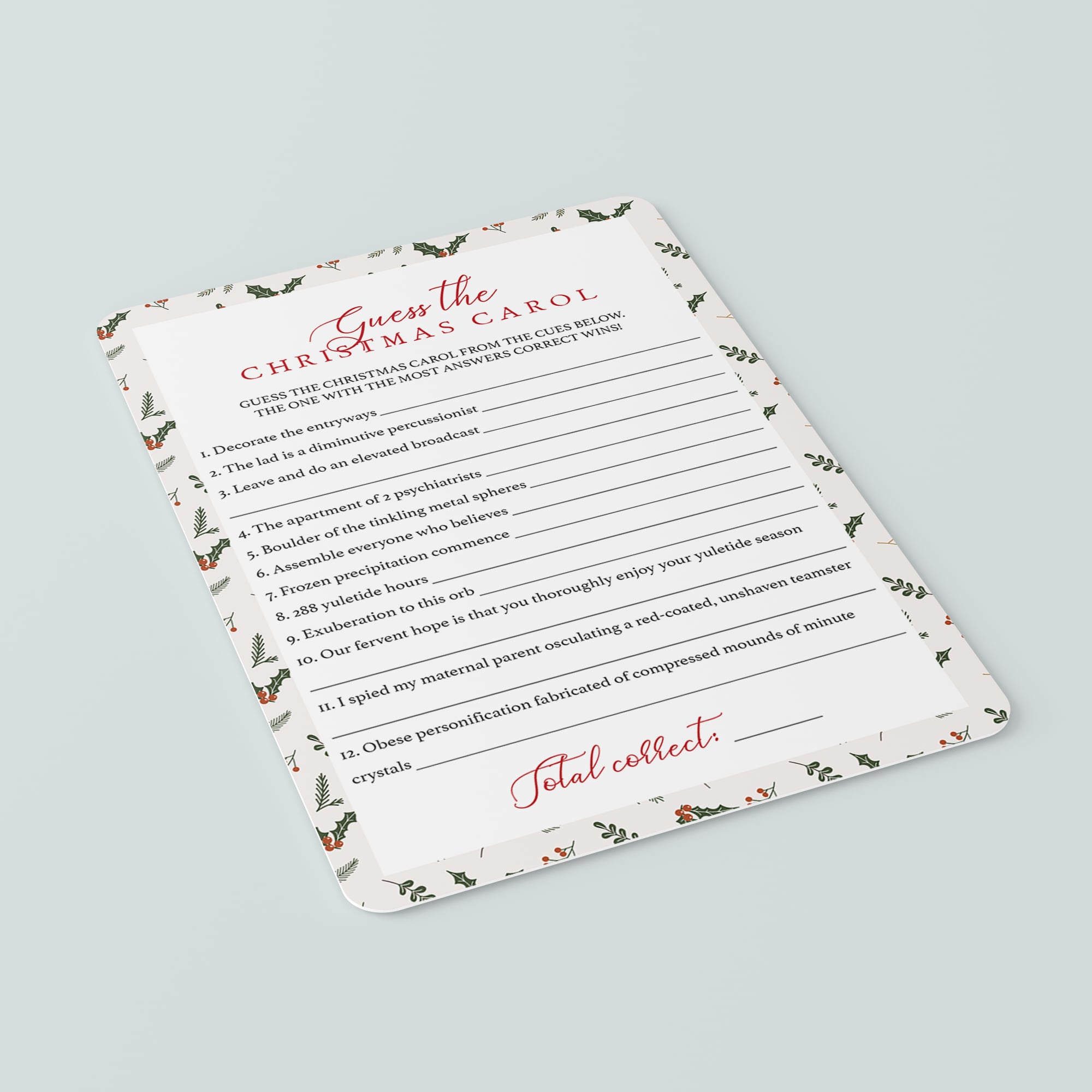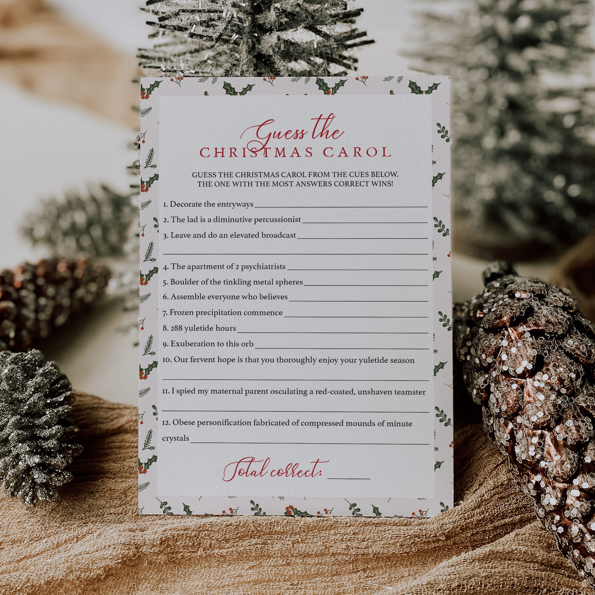 A Christmas Song game is a fun holiday party game that involves guessing a popular Christmas carol by clue titles synonymous with the original titles. Some clues are easier than others, but it’s a fun game to start your party off with. For example “Decorate the entryways” is the Christmas song “Deck the halls”.
