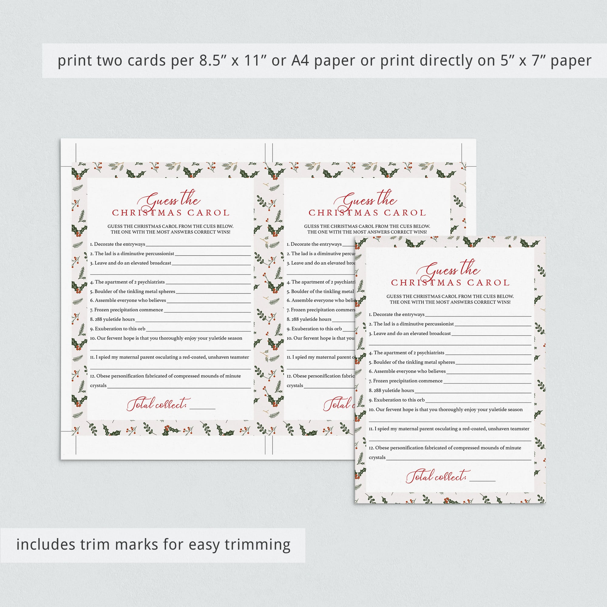This Christmas Songs game is an instant downloadable file that can be printed at the comfort of your home or ordered from a local or online print shop.