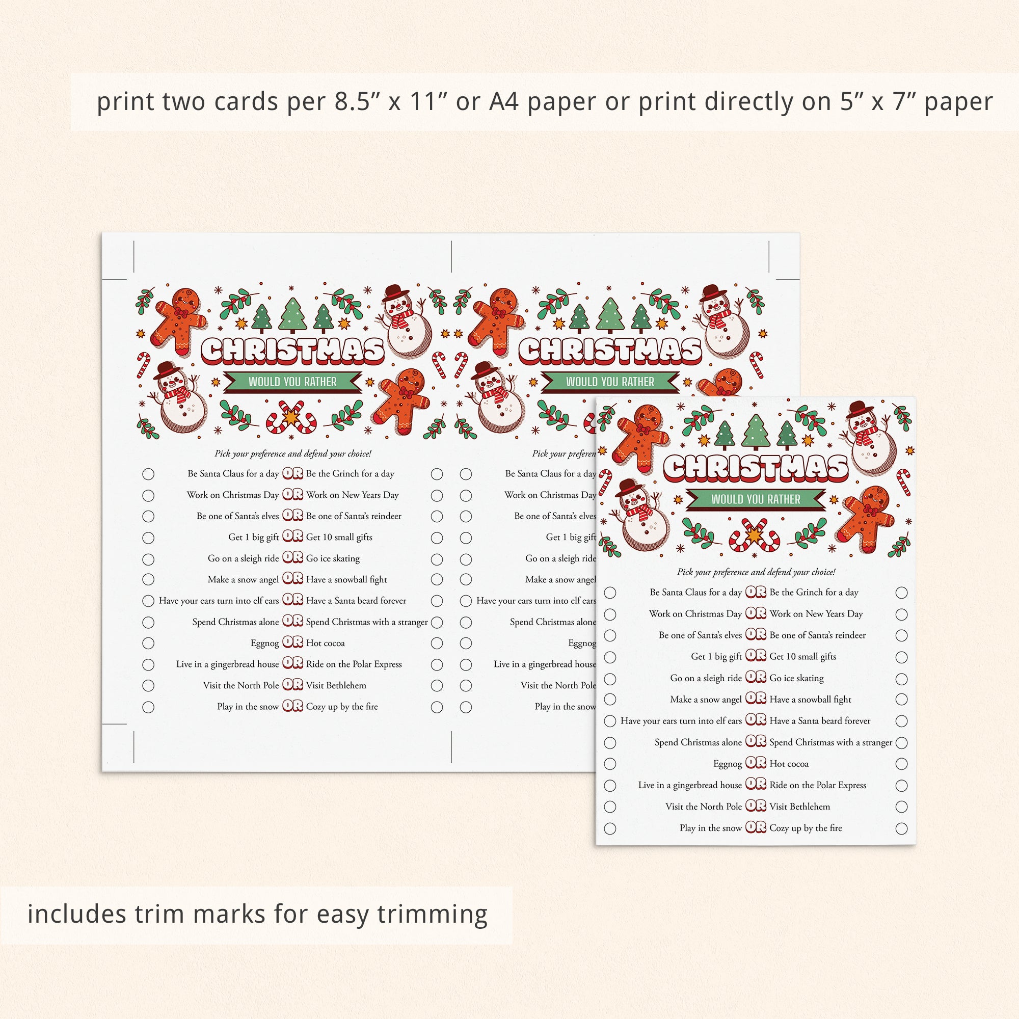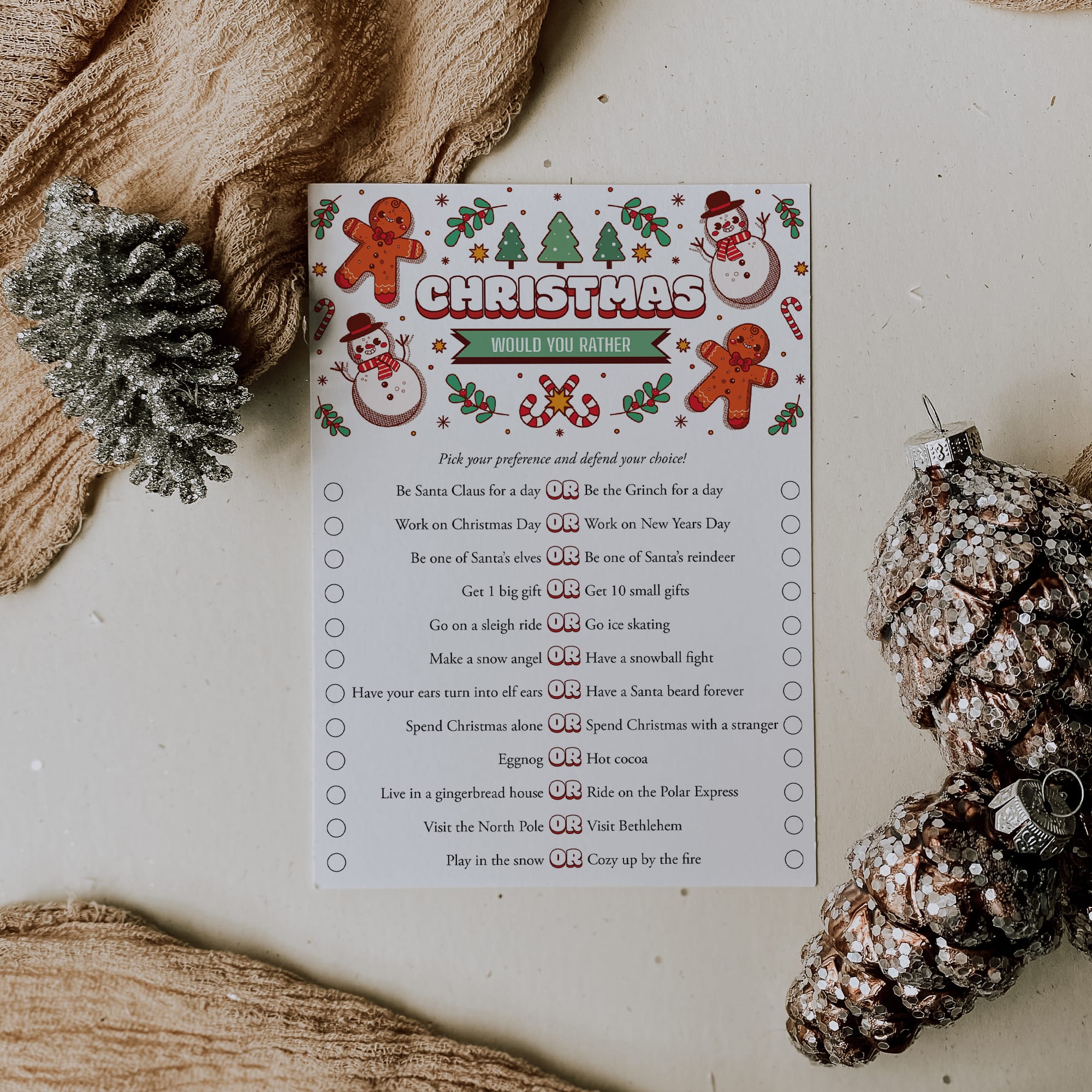 Are you looking for a fun icebreaker game for your Christmas party? Play Would You Rather. It's is a great conversation starter and will definitely get your guests mingling and laughing. This printable Christmas game has 12 This or That questions. Have your guests pick their preferences and defend their choice. Would you rather play in the snow or cozy up by the fire?