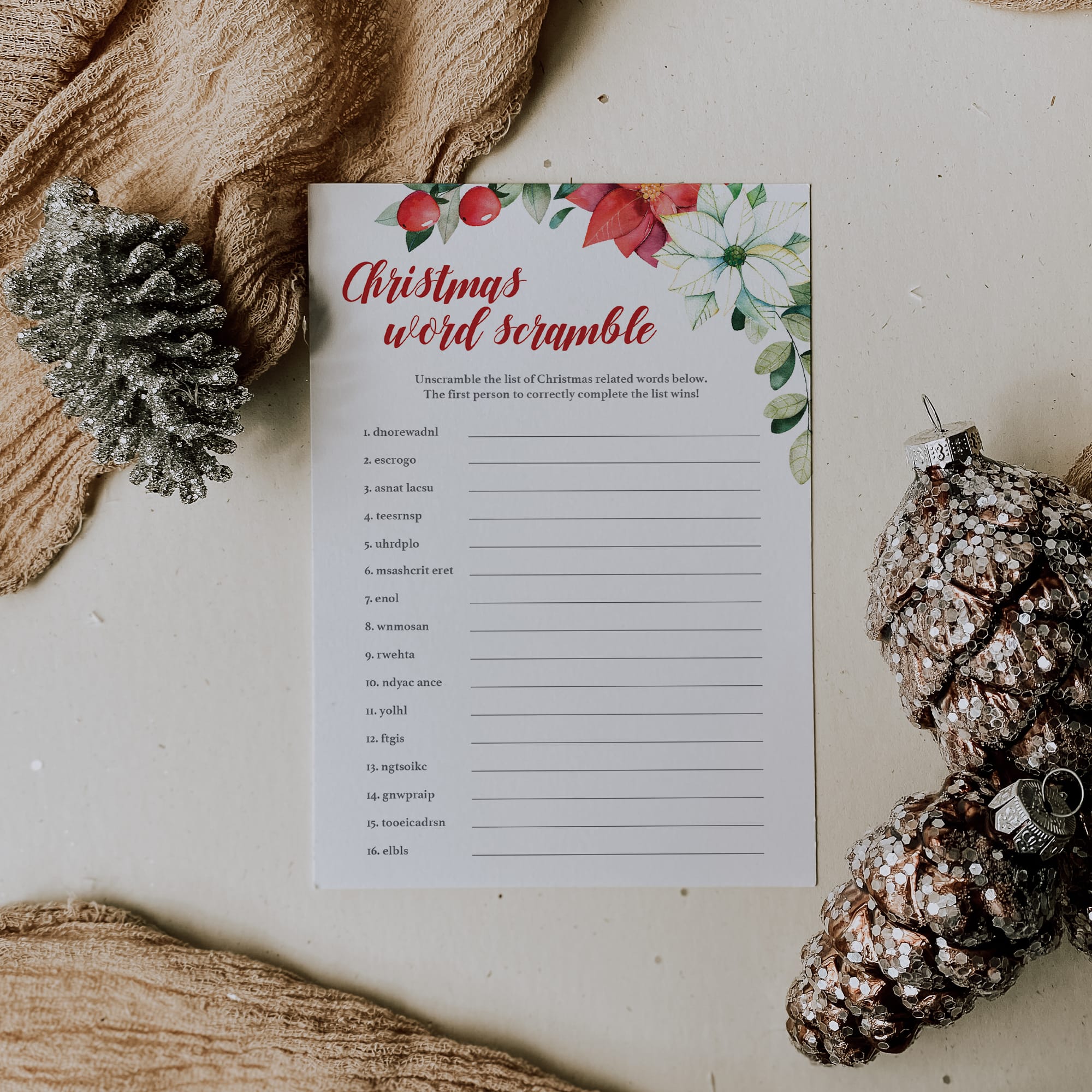 Add some extra fun to the holiday season with this gorgeous Christmas word scramble game. The red and white flowers and green leaves will ensure that you have those special holiday vibes at your party.